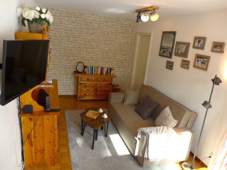 "Résidence du Golf A 07", 2-Zimmer-Wohnung 36 m2, im Erdgeschoss, Ostlage. Teilweise renoviert im Jahre 2022, komfortabel und schön eingerichtet: Wohn-/Esszimmer mit Kabel-TV, Flachbildschirm und Radio. Ausgang zur Terrasse, Richtung Osten. 1 Zimmer mit 1 franz. Bett (1 x 160 cm, Länge 200 cm). Küche (3 Kochplatten, Backofen, Toaster, Wasserkocher, Mikrowelle, elektrische Kaffeemaschine, Kapseln für die Kaffeemaschine (Nespresso) extra, Racletteofen, Fondue Set (Chinoise, Käse)). Bad/WC. Kleine Terrasse 7 m2. Terrassenmöbel, Liegestühle (2). Zur Verfügung: Haartrockner. Internet (WLAN, gratis). Garage Nr. 19 in 50 m, Höhe 190 cm, Breite 230 cm. Bitte beachten: Nichtraucher-Unterkunft. Maximal 1 Haustier/Hund erlaubt.
