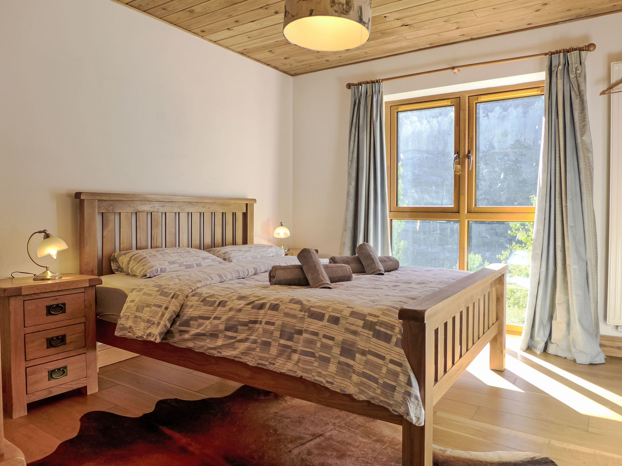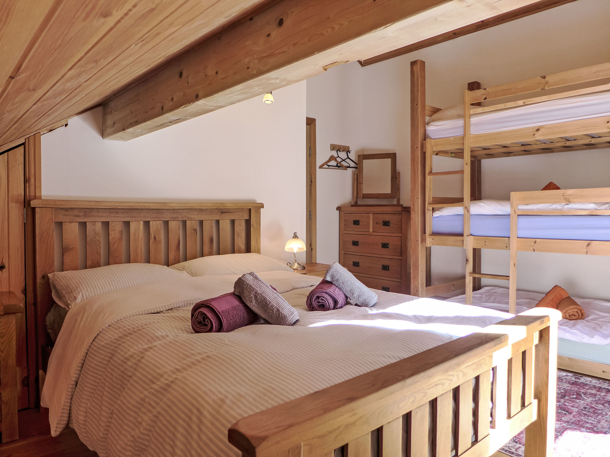 7-Zimmer-Chalet 185 m2 auf 4 Stockwerken. Geräumig und hell, sehr komfortabel und geschmackvoll eingerichtet: offenes grosses Wohnzimmer mit Panoramafenster mit Schwedenofen, Digital-TV, Flachbildschirm, DVD und DVD Sammlung vorhanden. Offene Küche (Backofen, Geschirrspüler, 4 Glaskeramikplatten, Toaster, Wasserkocher, Mikrowelle, Tiefkühler, elektrische Kaffeemaschine, Kapseln für die Kaffeemaschine (Tassimo) extra, Racletteofen, Fondue Set (Käse)) mit Esstisch. Ausgang zum Balkon. Unteres Geschoss: (steile Treppe). Ausgang zum Garten. Sep. WC. Obergeschoss: 1 Doppelzimmer mit 1 franz. Bett (140 cm, Länge 200 cm). 1 Doppelzimmer mit Panoramafenster mit 1 franz. Bett (160 cm, Länge 200 cm). Dusche/WC. 2. Obergeschoss: 1 Doppelzimmer mit 1 franz. Bett (160 cm, Länge 200 cm), Bad/WC. Dusche/WC. Dachgeschoss: 1 Zimmer mit 1 x 2 Etagenbetten (90 cm, Länge 200 cm), 1 franz. Bett (140 cm, Länge 200 cm). 1 Zimmer mit 1 x 3 Etagenbetten (90 cm, Länge 200 cm), 1 franz. Bett (140 cm, Länge 200 cm). Bad/WC. Grosse Terrasse, Gartensitzplatz. Terrassenmöbel, Gartengrill, Liegestühle, Abstellkammer. Herrliche Panoramasicht auf die Berge, die Landschaft und die Ortschaft. Zur Verfügung: Kinderhochstuhl, Babybett (extra), Haartrockner. Internet (Wireless LAN, gratis). Bitte beachten: Nichtraucher-Haus. Rauchmelder, Feuerlöscher. Bei Belegung mit weniger Personen als der maximalen Personenzahl stehen nicht alle Schlafzimmer zur Verfügung.