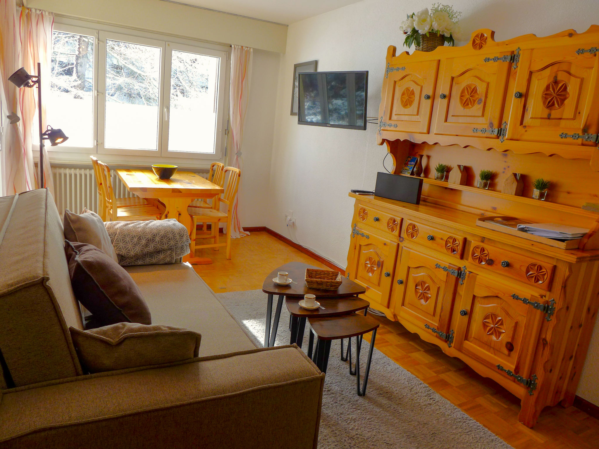 "Résidence du Golf A 07", 2-Zimmer-Wohnung 36 m2, im Erdgeschoss, Ostlage. Teilweise renoviert im Jahre 2022, komfortabel und schön eingerichtet: Wohn-/Esszimmer mit Kabel-TV, Flachbildschirm und Radio. Ausgang zur Terrasse, Richtung Osten. 1 Zimmer mit 1 franz. Bett (1 x 160 cm, Länge 200 cm). Küche (3 Kochplatten, Backofen, Toaster, Wasserkocher, Mikrowelle, elektrische Kaffeemaschine, Kapseln für die Kaffeemaschine (Nespresso) extra, Racletteofen, Fondue Set (Chinoise)). Bad/WC. Kleine Terrasse 7 m2. Terrassenmöbel, Liegestühle (2). Zur Verfügung: Haartrockner. Internet (WLAN, gratis). Garage Nr. 19 in 50 m, Höhe 190 cm, Breite 230 cm. Bitte beachten: Nichtraucher-Unterkunft. Maximal 1 Haustier/Hund erlaubt.