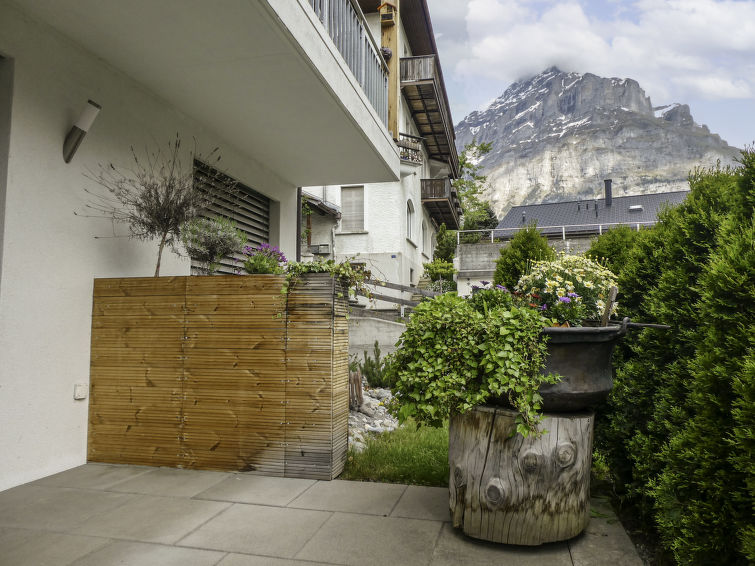 3-Zimmer-Wohnung 60 m2 auf 2 Stockwerken, im Erdgeschoss, Südlage. Hell, modern und gemütlich eingerichtet: Wohn-/Esszimmer mit Digital-TV. Ausgang zum Gartensitzplatz, Richtung Süden. 1 Zimmer mit 1 Doppelbett (2 x 90 cm, Länge 200 cm). Offene Küche (Backofen, Geschirrspüler, 4 Glaskeramikplatten, Toaster, Wasserkocher, Mikrowelle, elektrische Kaffeemaschine, Kapseln für die Kaffeemaschine (Nespresso) extra, Racletteofen, Fondue Set (Käse)). Dusche/WC. Fussbodenheizung. Obergeschoss: (Wendeltreppe) 1 Zimmer mit 2 Betten (90 cm, Länge 200 cm). Parkettboden, Natursteinboden. Gartensitzplatz, Südlage. Terrassenmöbel, Liegestühle. Herrliche Sicht auf die Berge und Eigernordwand. Zur Verfügung: Waschmaschine, Wäschetrockner, Kinderhochstuhl, Babybett, Haartrockner. Internet (Wireless LAN, gratis). Parkplatz (überdacht). Bitte beachten: Nichtraucher-Unterkunft. Feuerlöscher.