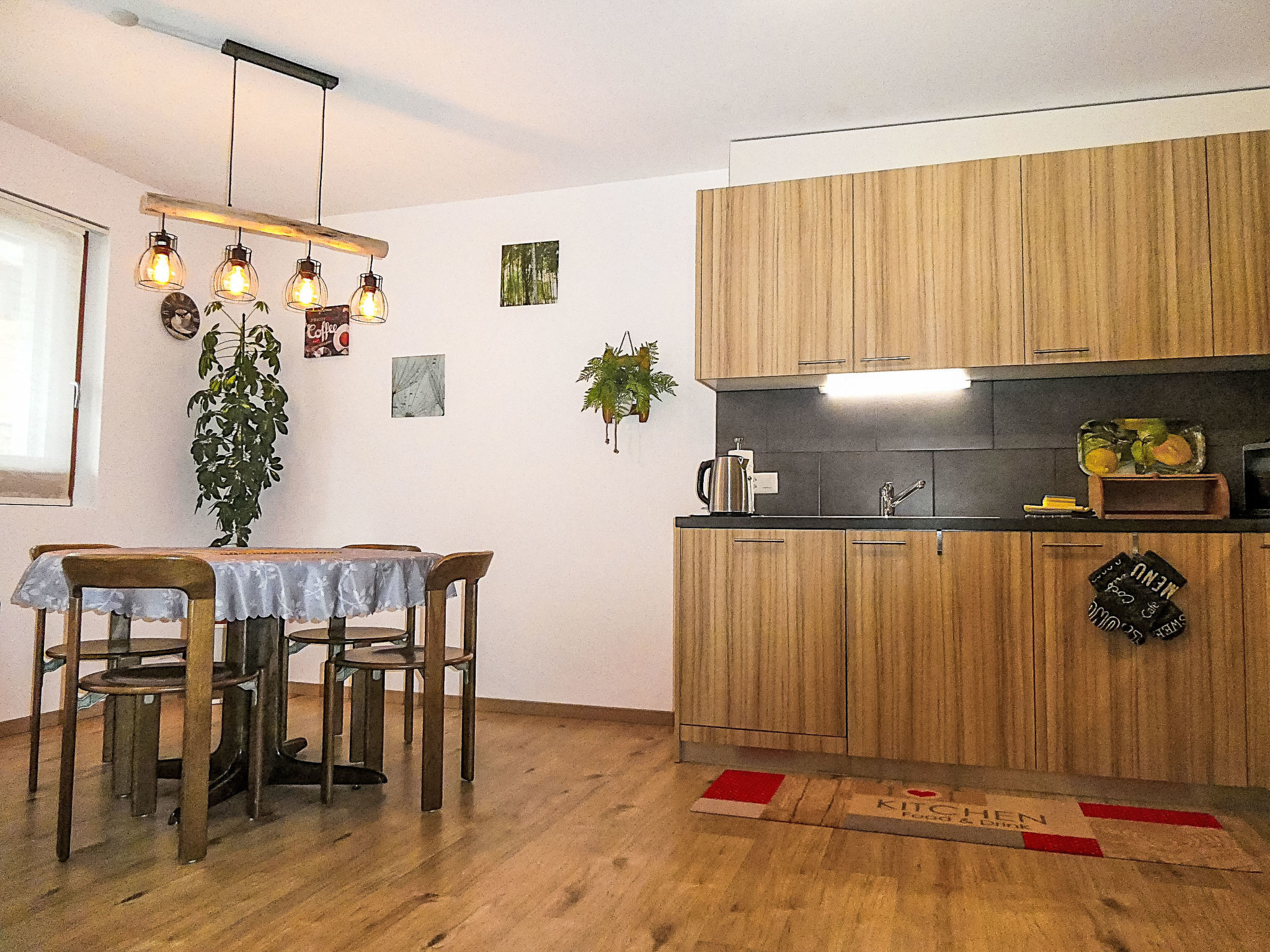 3-Zimmer-Wohnung 60 m2 auf 2 Stockwerken, im Erdgeschoss, Südlage. Hell, modern und gemütlich eingerichtet: Wohn-/Esszimmer mit Digital-TV. Ausgang zum Gartensitzplatz, Richtung Süden. 1 Zimmer mit 1 Doppelbett (2 x 90 cm, Länge 200 cm). Offene Küche (Backofen, Geschirrspüler, 4 Glaskeramikplatten, Toaster, Wasserkocher, Mikrowelle, elektrische Kaffeemaschine, Kapseln für die Kaffeemaschine (Nespresso) extra, Racletteofen, Fondue Set (Käse)). Dusche/WC. Fussbodenheizung. Obergeschoss: (Wendeltreppe) 1 Zimmer mit 2 Betten (90 cm, Länge 200 cm). Parkettboden, Natursteinboden. Gartensitzplatz, Südlage. Terrassenmöbel, Liegestühle. Herrliche Sicht auf die Berge und Eigernordwand. Zur Verfügung: Waschmaschine, Wäschetrockner, Kinderhochstuhl, Babybett, Haartrockner. Internet (WLAN, gratis). Parkplatz (überdacht). Bitte beachten: Nichtraucher-Unterkunft. Feuerlöscher.