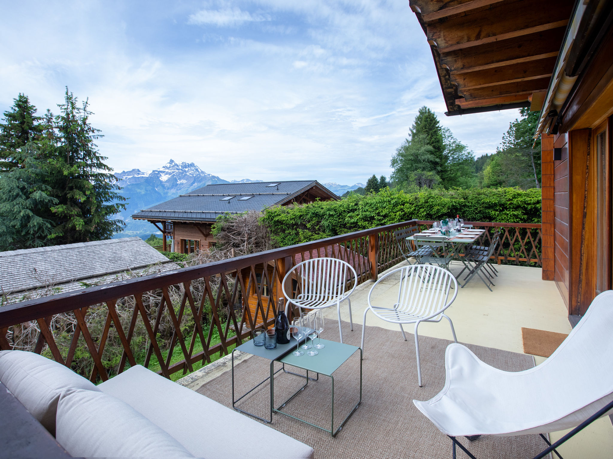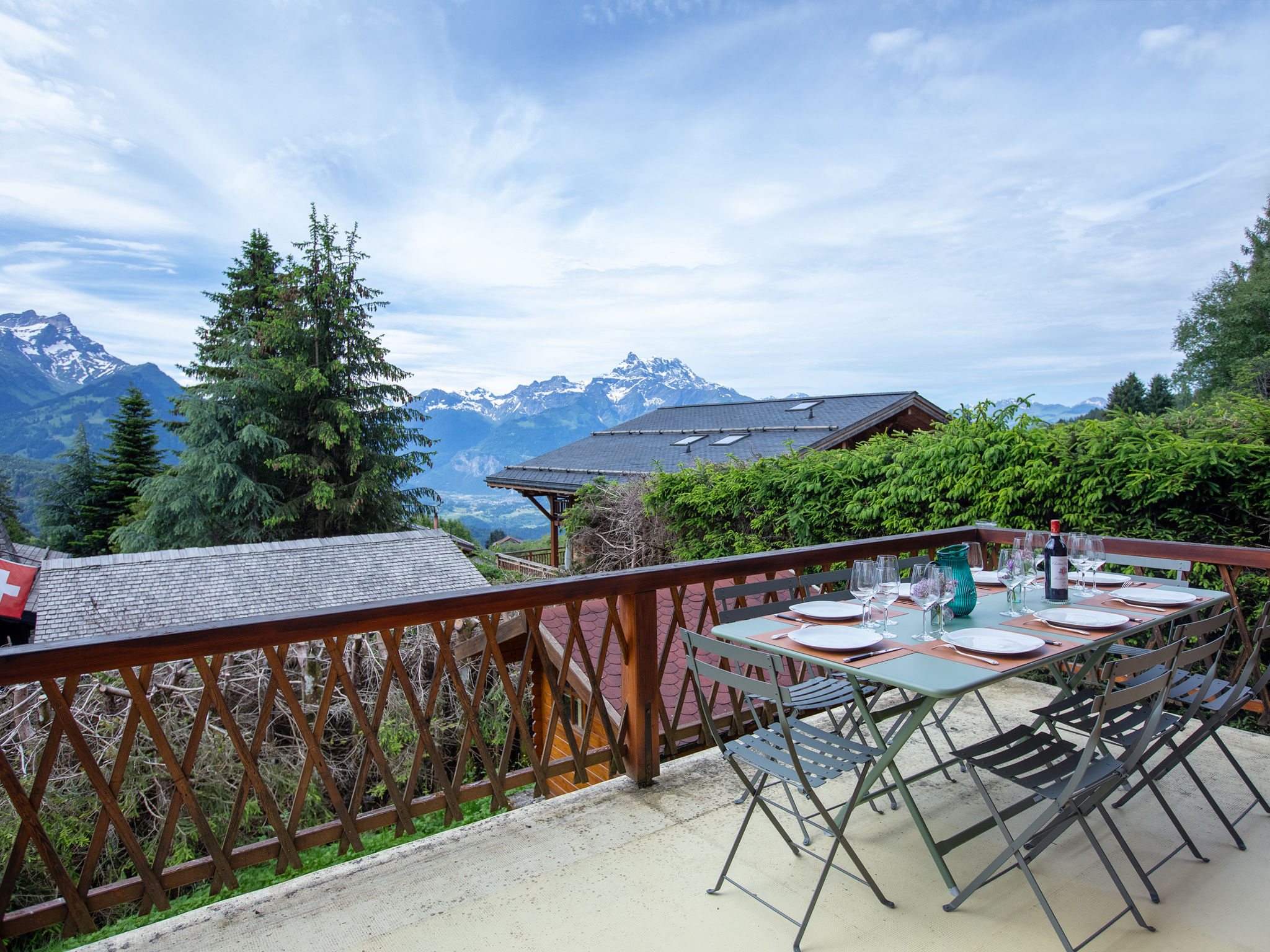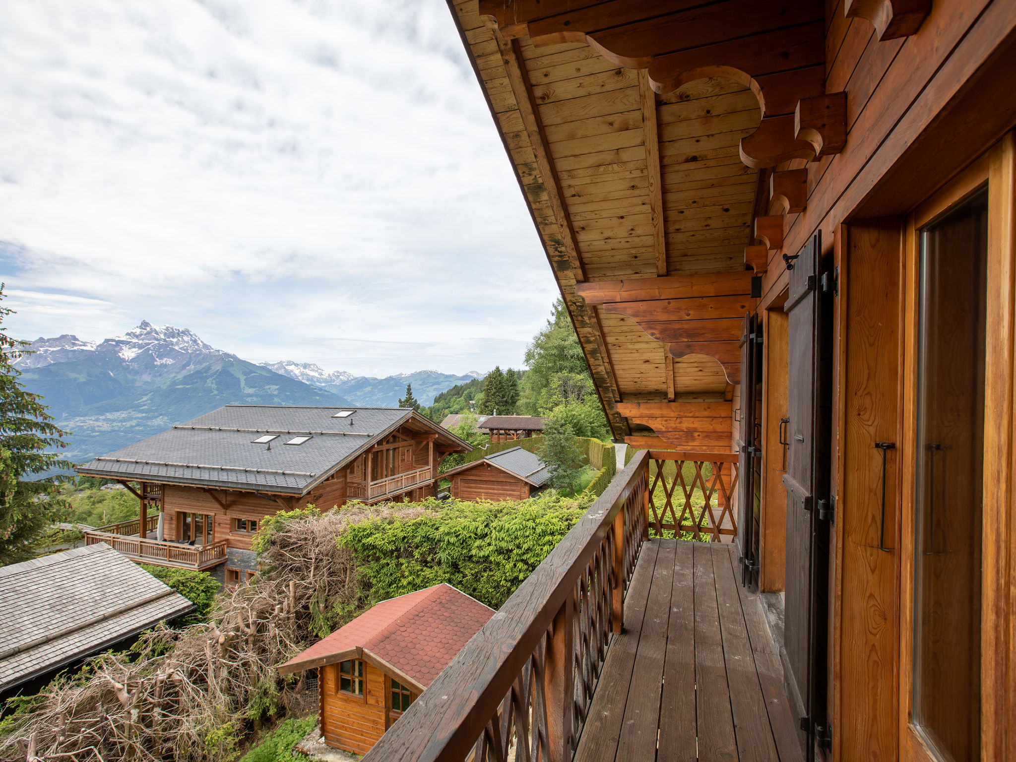 "Chalet Shambala", 7-Zimmer-Chalet 200 m2 auf 3 Stockwerken, Südlage. Modern und geschmackvoll eingerichtet: grosses Wohn-/Esszimmer mit offenem Kamin und Esstisch. Ausgang zur Terrasse, Richtung Süden und Richtung Westen. Kleines Büro. Offene Küche (Backofen, Geschirrspüler, 4 Induktionskochplatten, Toaster, Wasserkocher, Mikrowelle, Tiefkühler, elektrische Kaffeemaschine, Kapseln für die Kaffeemaschine (Nespresso) extra, Racletteofen, Fondue Set (Käse)). Sep. WC. Unteres Geschoss: 1 Doppelzimmer mit 1 franz. Bett (180 cm, Länge 200 cm). Spielzimmer mit TV. Dusche/WC. Obergeschoss: 1 Doppelzimmer mit 1 franz. Bett (1 x 160 cm, Länge 200 cm), Dusche/WC. Ausgang zum Balkon, Richtung Süden. 1 Kinderzimmer mit 1 x 2 Etagenbetten (90 cm, Länge 200 cm), 1 Ausziehbett (2 Pers. 2 x 90 cm, Länge 200 cm). Ausgang zum Balkon, Richtung Süden. 1 Doppelzimmer mit 2 Betten (80 cm, Länge 200 cm). Bad/WC. Balkon, Südlage Terrasse, Südlage und Westlage. Terrassenmöbel. Sehr schöne Panoramasicht auf die Berge. Zur Verfügung: Waschmaschine, Wäschetrockner, Babybett, Haartrockner. Internet (Wireless LAN, gratis). Parkplatz (2 Autos). Bitte beachten: Nichtraucher-Haus.
