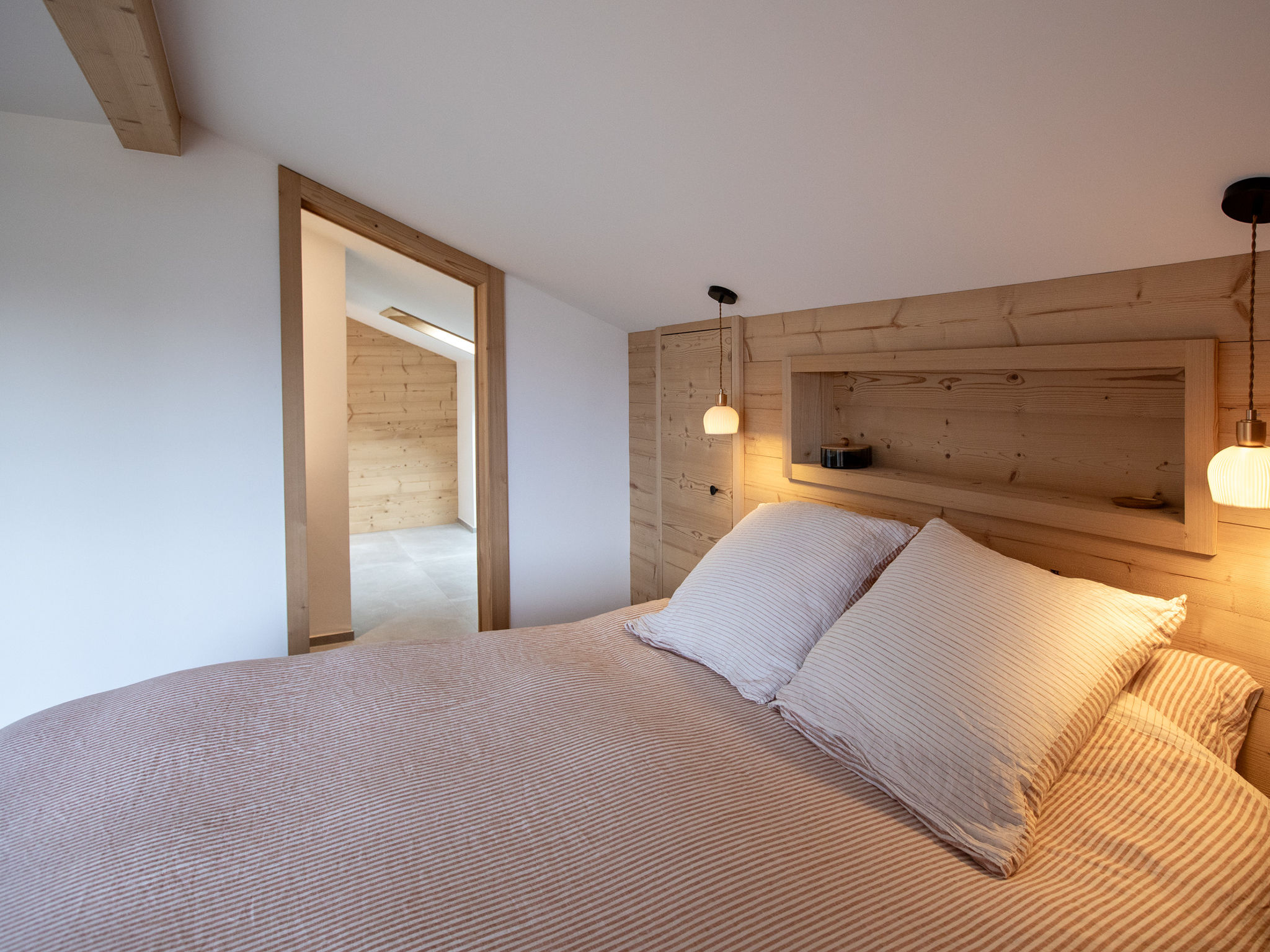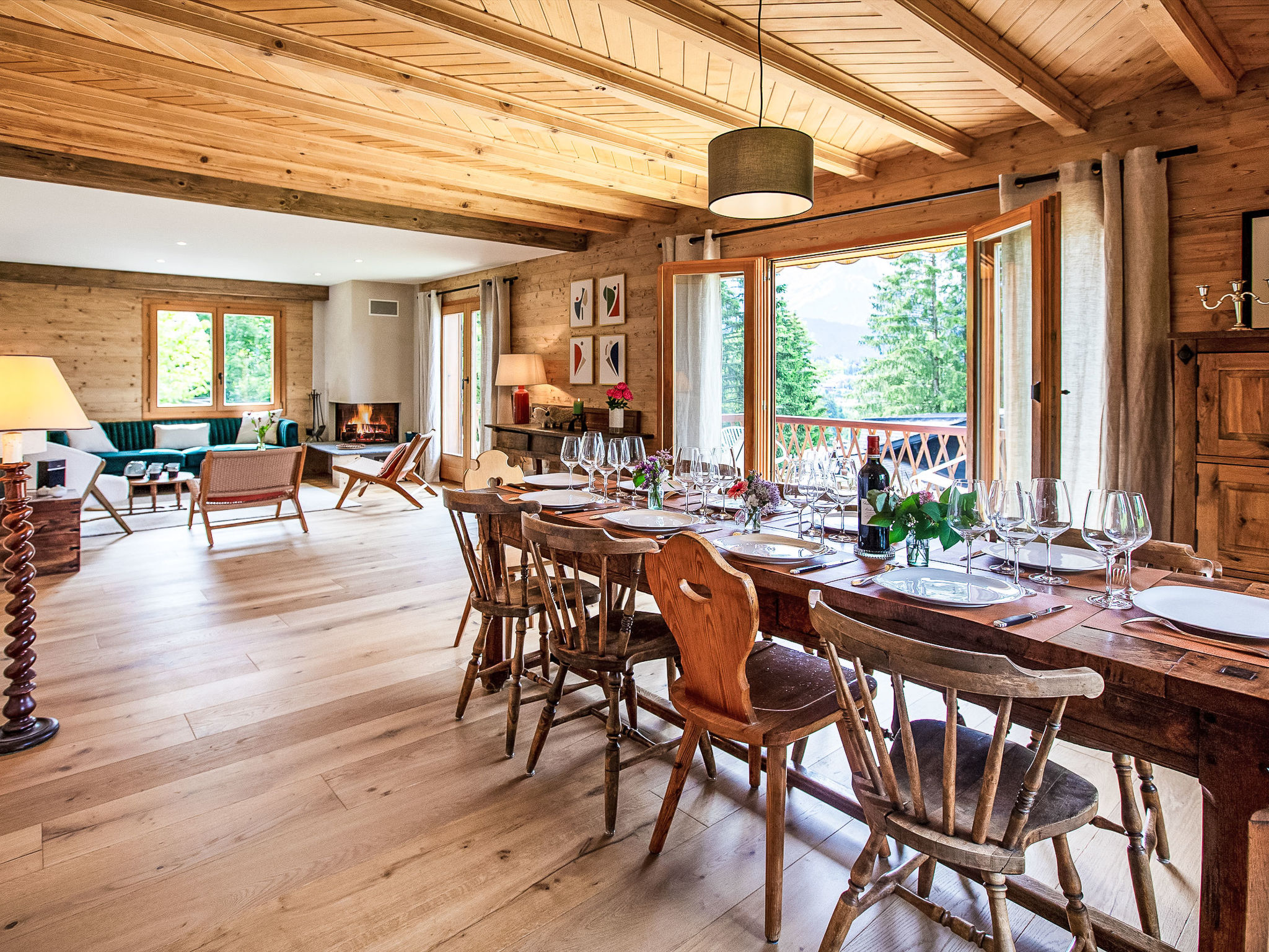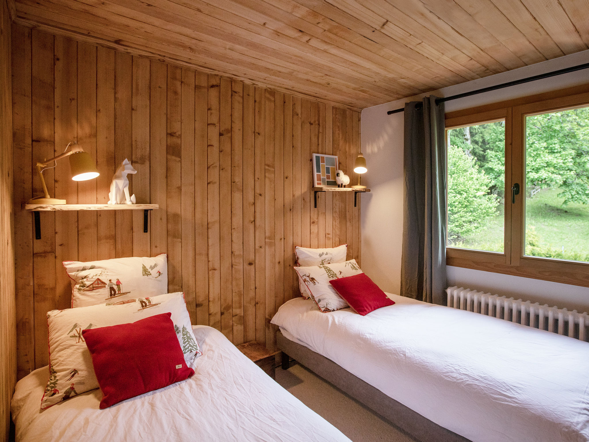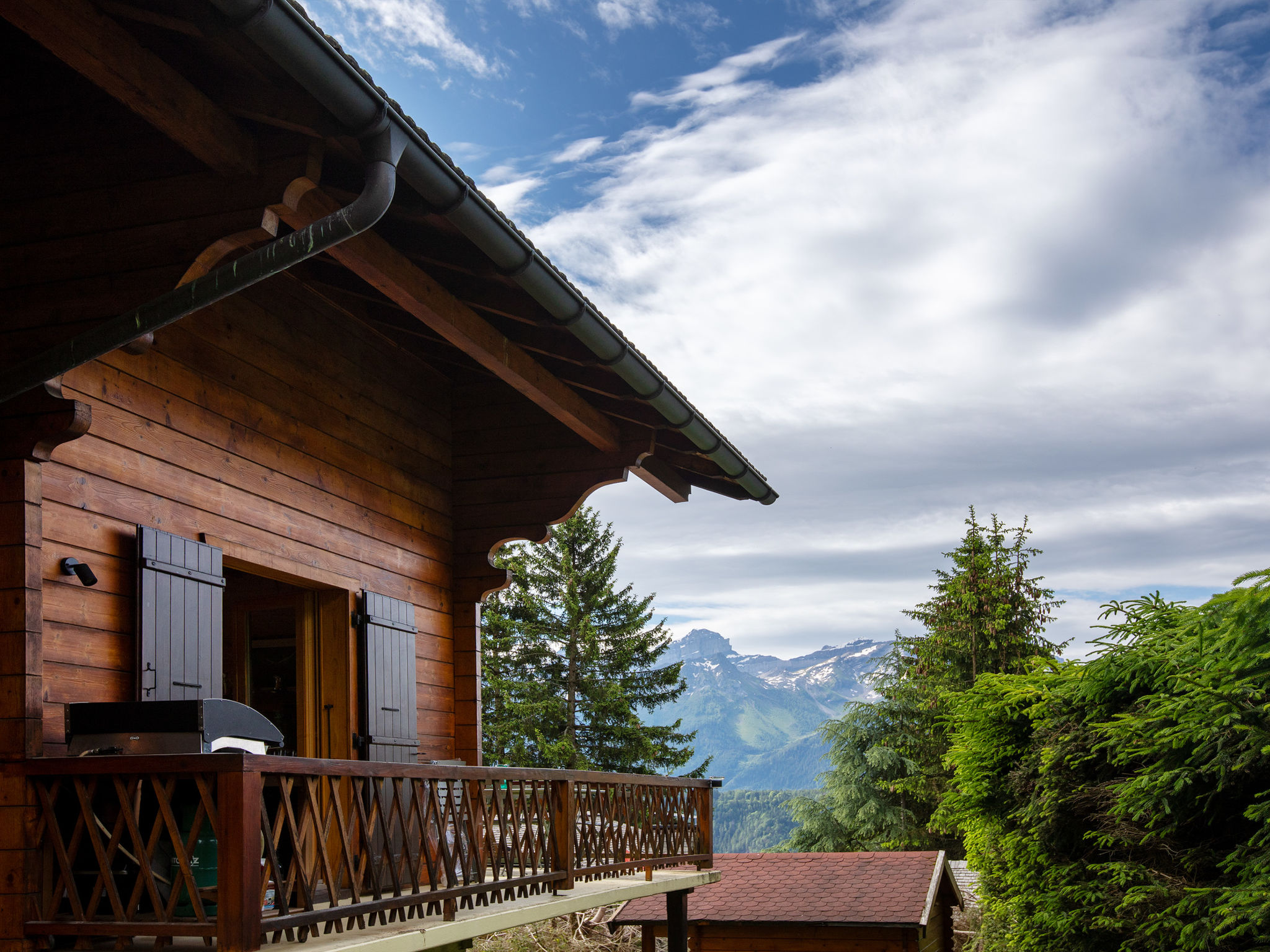 "Chalet Shambala", 7-Zimmer-Chalet 200 m2 auf 3 Stockwerken, Südlage. Modern und geschmackvoll eingerichtet: grosses Wohn-/Esszimmer mit offenem Kamin und Esstisch. Ausgang zur Terrasse, Richtung Süden und Richtung Westen. Kleines Büro. Offene Küche (Backofen, Geschirrspüler, 4 Induktionskochplatten, Toaster, Wasserkocher, Mikrowelle, Tiefkühler, elektrische Kaffeemaschine, Kapseln für die Kaffeemaschine (Nespresso) extra, Racletteofen, Fondue Set (Käse)). Sep. WC. Unteres Geschoss: 1 Doppelzimmer mit 1 franz. Bett (180 cm, Länge 200 cm). Spielzimmer mit TV. Dusche/WC. Obergeschoss: 1 Doppelzimmer mit 1 franz. Bett (1 x 160 cm, Länge 200 cm), Dusche/WC. Ausgang zum Balkon, Richtung Süden. 1 Kinderzimmer mit 1 x 2 Etagenbetten (90 cm, Länge 200 cm), 1 Ausziehbett (2 Pers. 2 x 90 cm, Länge 200 cm). Ausgang zum Balkon, Richtung Süden. 1 Doppelzimmer mit 2 Betten (80 cm, Länge 200 cm). Bad/WC. Balkon, Südlage Terrasse, Südlage und Westlage. Terrassenmöbel. Sehr schöne Panoramasicht auf die Berge. Zur Verfügung: Waschmaschine, Wäschetrockner, Babybett, Haartrockner. Internet (Wireless LAN, gratis). Parkplatz (2 Autos). Bitte beachten: Nichtraucher-Haus.