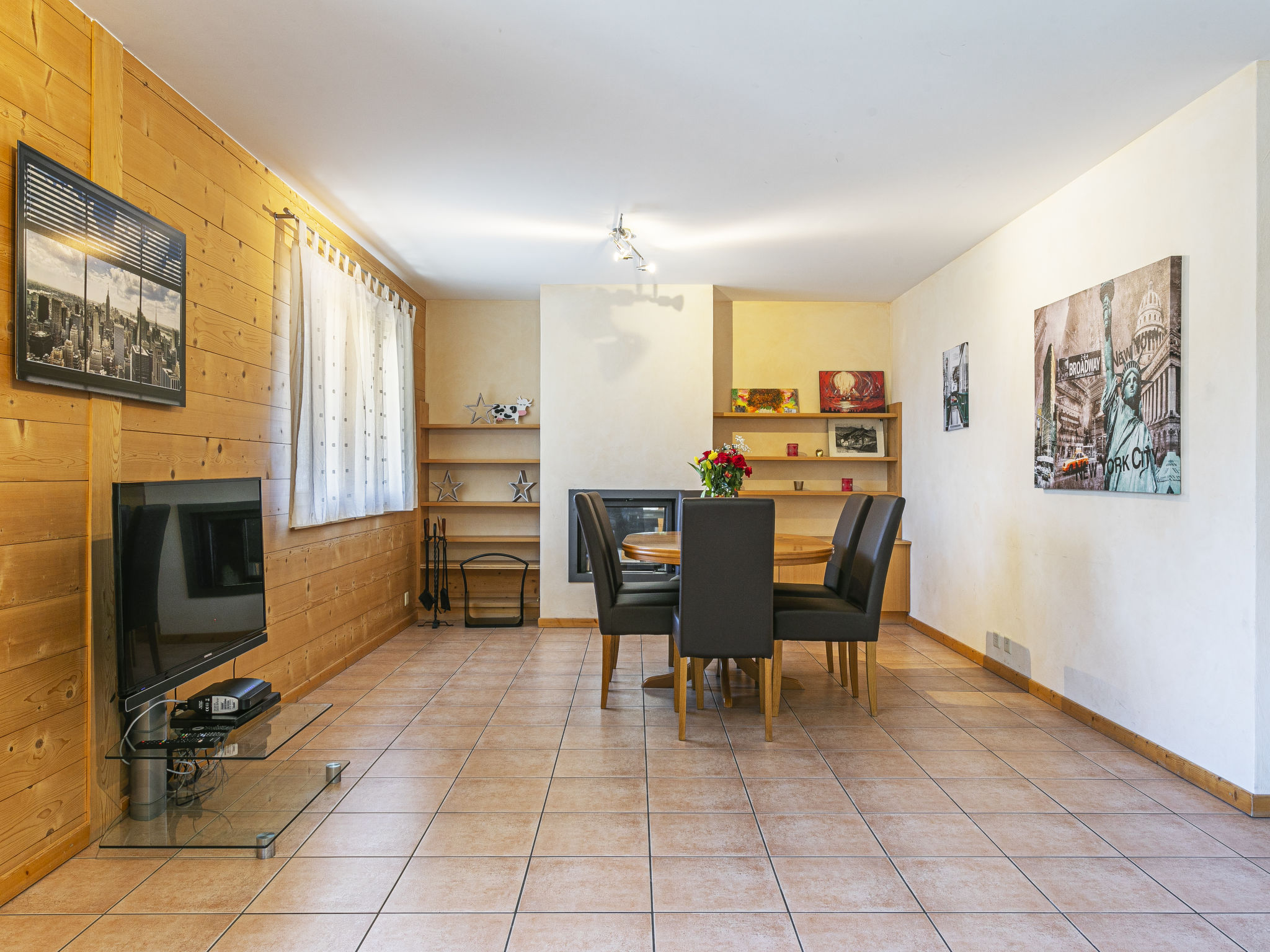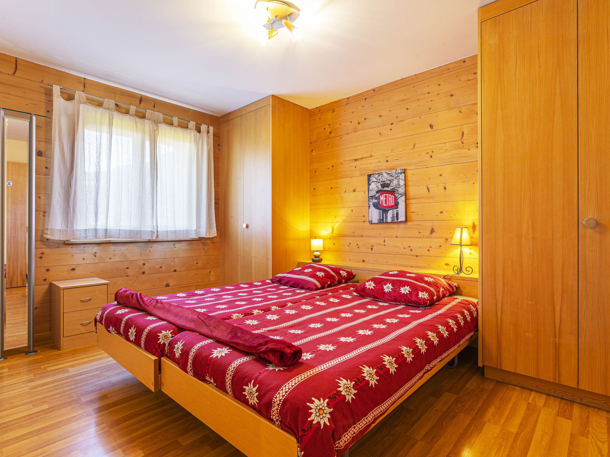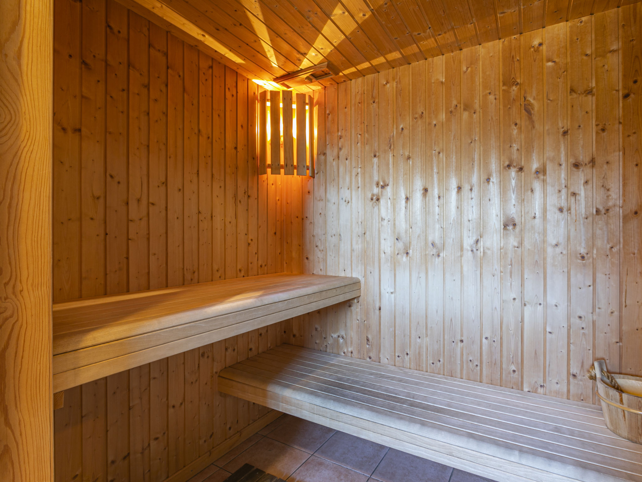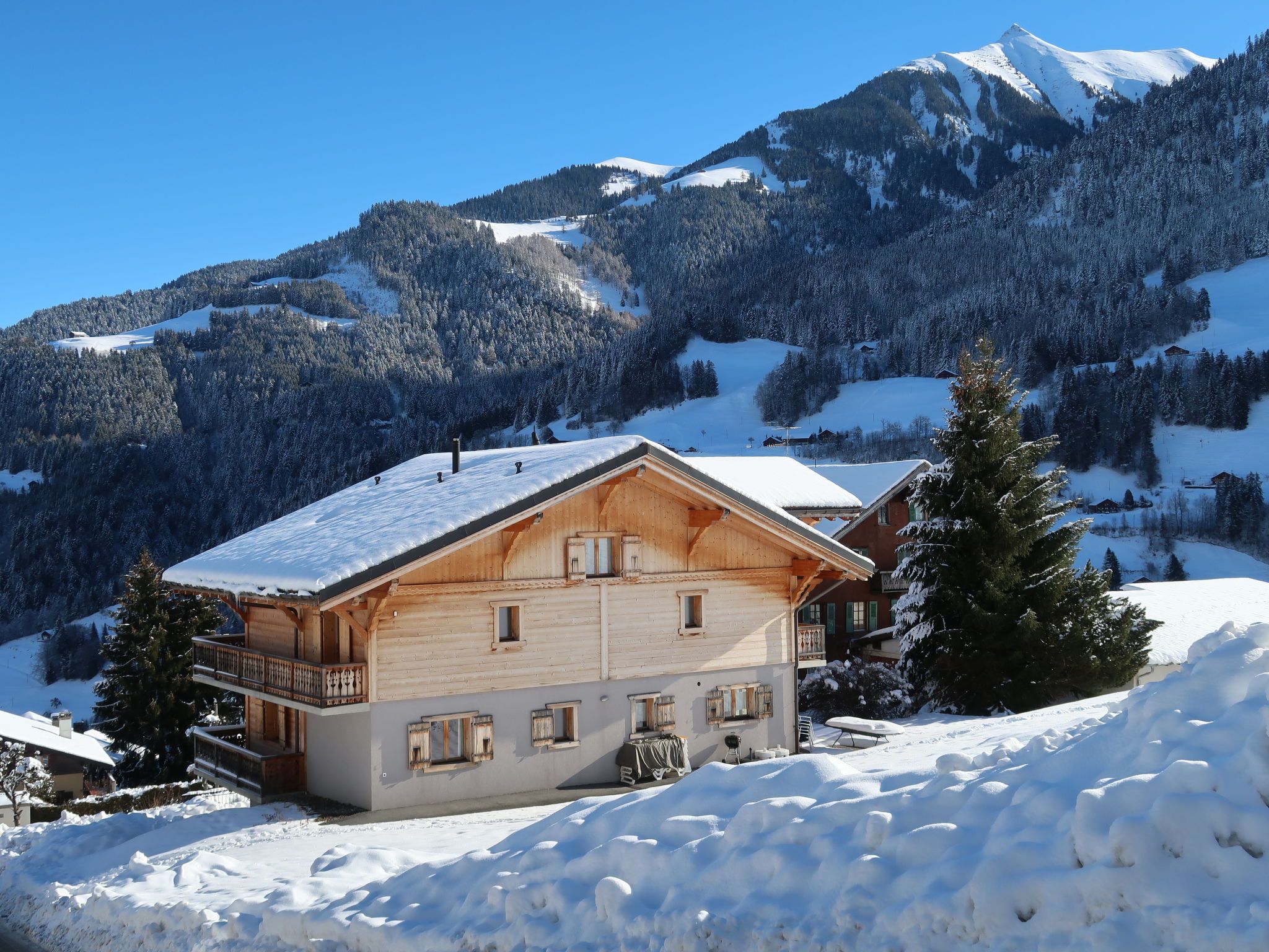 "Chalet Saint Joseph", 9-Zimmer-Chalet 240 m2 auf 4 Stockwerken, Ostlage. Gemütlich und mit viel Holz eingerichtet: Wohnzimmer mit offenem Kamin, Esstisch und Sat-TV (Flachbildschirm), DVD. Ausgang zum Balkon, Richtung Nordosten. 1 Zimmer mit 2 Betten (90 cm, Länge 200 cm). Offene Küche (Backofen, Geschirrspüler, 4 Glaskeramikplatten, Toaster, Wasserkocher, Mikrowelle, Tiefkühler, elektrische Kaffeemaschine, Kapseln für die Kaffeemaschine (Nespresso), Racletteofen, Fondue Set (Chinoise, Käse)) mit Bar, Esstisch. Ausgang zur Terrasse, Richtung Südosten. Dusche/WC. Unteres Geschoss: Dusche, sep. WC, Sauna. Ölheizung. Obergeschoss: 1 Zimmer mit 2 Betten (90 cm, Länge 200 cm), Dusche/WC. 1 Zimmer mit 2 Betten (90 cm, Länge 200 cm), Dusche/WC. 1 Zimmer mit 2 Betten (90 cm, Länge 200 cm). Ausgang zum Balkon. 1 Zimmer mit 2 Betten (90 cm, Länge 200 cm). 1 Zimmer mit 2 Betten (90 cm, Länge 200 cm). Ausgang zum Balkon. Dusche/WC. 2. Obergeschoss: Dusche/WC. 3. Obergeschoss: 1 abgeschrägtes Zimmer mit 4 Betten (90 cm, Länge 200 cm), Dusche/WC. Ausgang zum Balkon, Richtung Südosten. 1 abgeschrägtes Zimmer mit 4 Betten (90 cm, Länge 200 cm), Bad/WC. Ausgang zum Balkon, Richtung Osten. Kleiner Balkon, Ostlage, grosse Terrasse, Südostlage. Terrassenmöbel, Gartengrill (mobil), Liegestühle (6). Sehr schöne Sicht auf die Berge, das Tal, die Landschaft und die Ortschaft. Zur Verfügung: Waschmaschine, Wäschetrockner. Internet (Wireless LAN, gratis). Parkplatz beim Haus. Bitte beachten: Nichtraucher-Unterkunft.