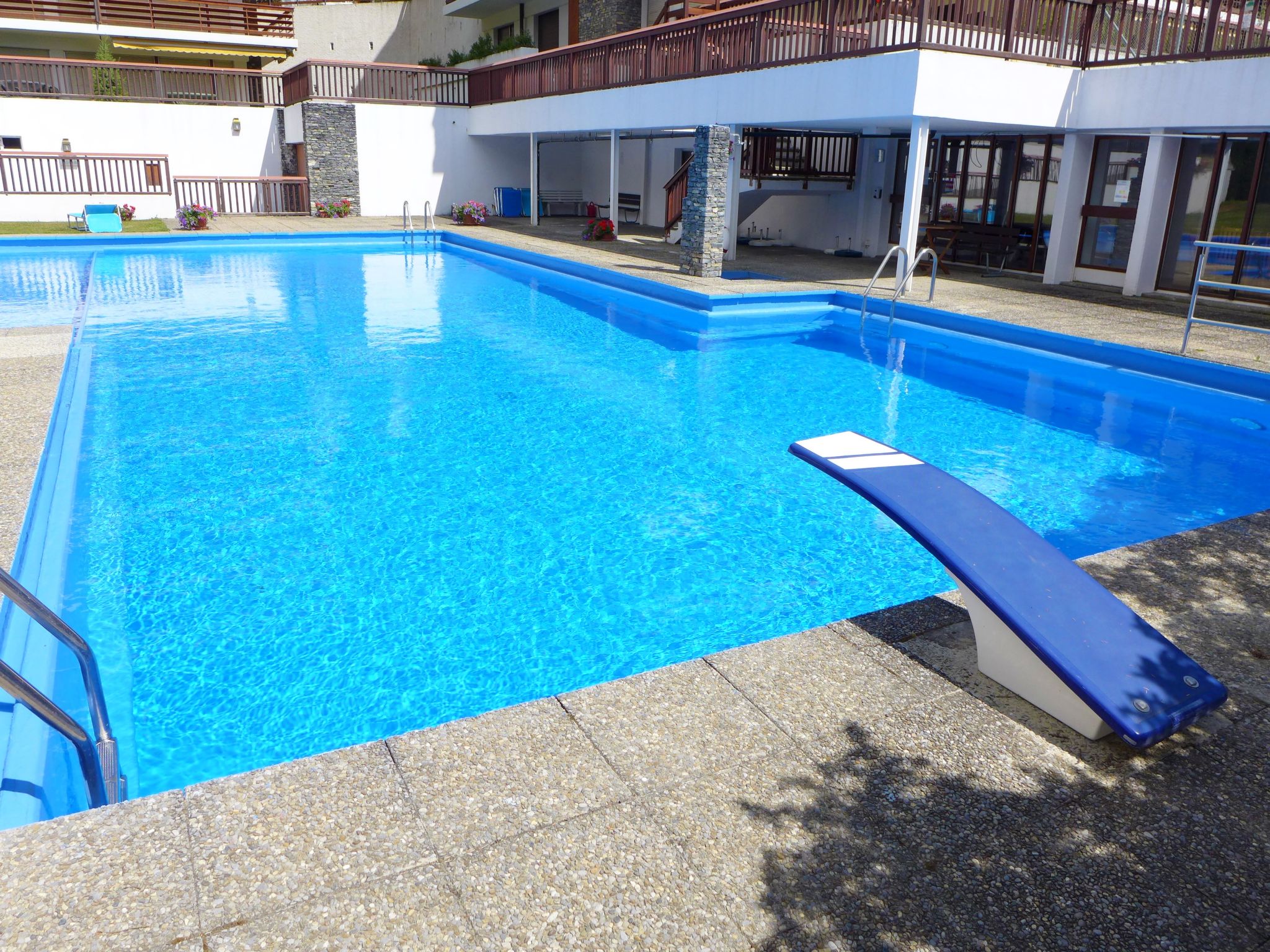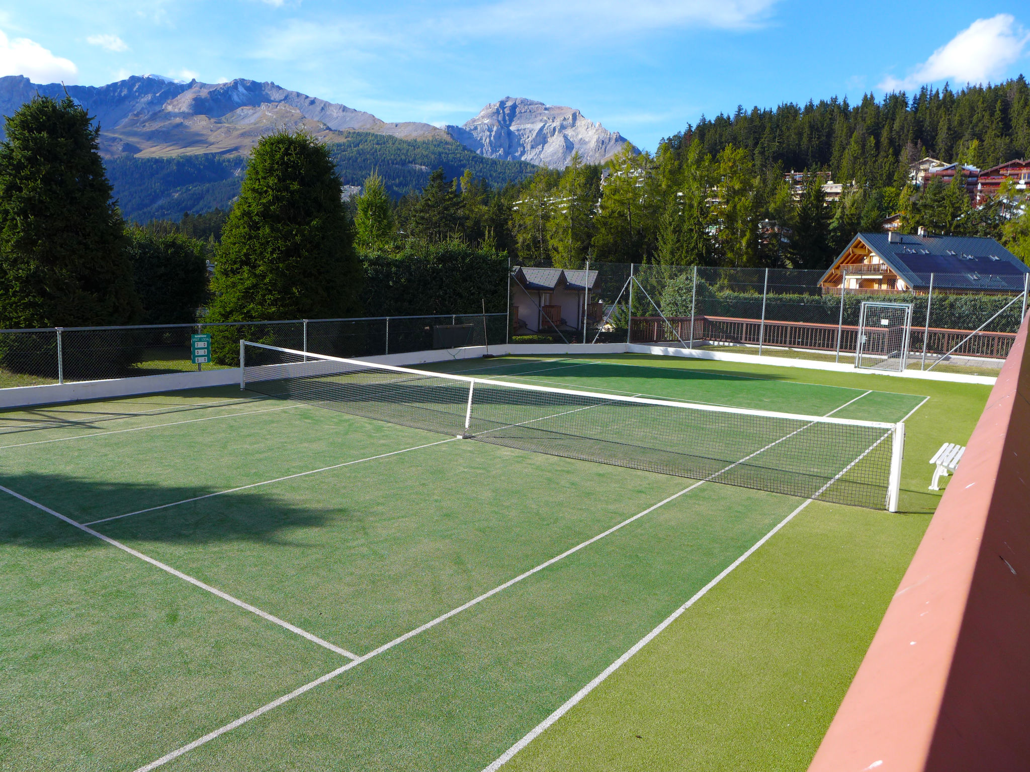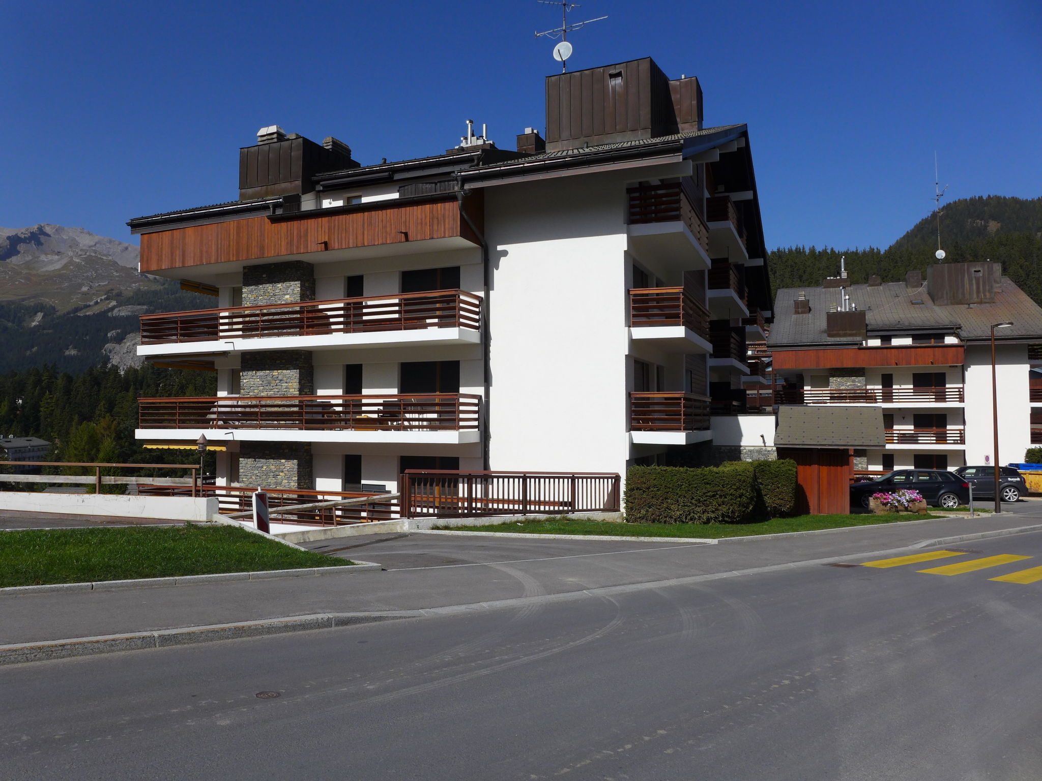 Grosse Residenz "Valdor". 1 km vom Zentrum von Crans, 1 km vom See, Richtung Südwesten. Zur Mitbenutzung: Garten (nicht eingezäunt) mit Rasen, Schwimmbad beheizt (saisonale Verfügbarkeit: 01.Jul. - 15.Sep.) mit Innentreppe. Tennis (17.Jun. - 15.Sep.), Tischtennis. Zur Alleinbenutzung: Rasen 130 m2. Terrasse, Gartenmöbel. In der Anlage: Fitnessraum, Fahrstuhl, Skiraum, Zentralheizung, Waschmaschine, Wäschetrockner (zur Mitbenutzung, extra). Parkplatz (beschränkte Anzahl) beim Haus. Einkaufsgeschäft 850 m, Supermarkt 1.3 km, Restaurant 500 m, Bäckerei 1.5 km, Bushaltestelle "Zier-Régent" 400 m, Bahnstation "Funiculaire Montana Gare" 3 km, Badesee "Moubra" 2.4 km, See Etang Long 1 km. Golfplatz (18 Loch) 900 m, Skisportanlagen 1 km, Ski-Kindergarten 600 m, Langlaufloipe 400 m. Bekannte Seen in der Umgebung sind gut erreichbar: Lac Grenon 2.2 km. Bitte beachten: Gratis Skibus. Die Schlüsselübergabe findet bei der Agentur Interhome in Montana statt, 3 km.