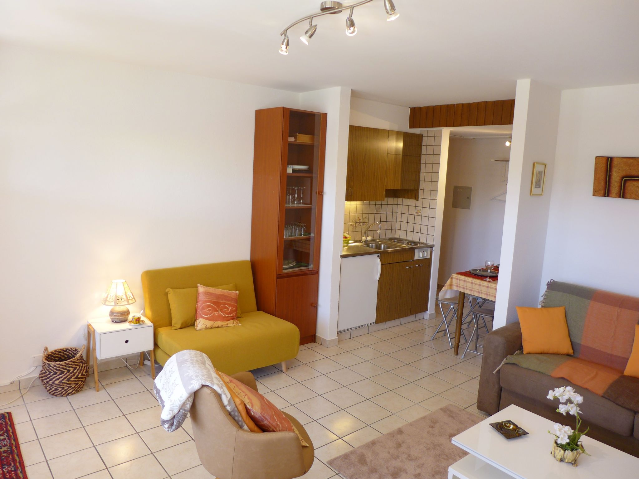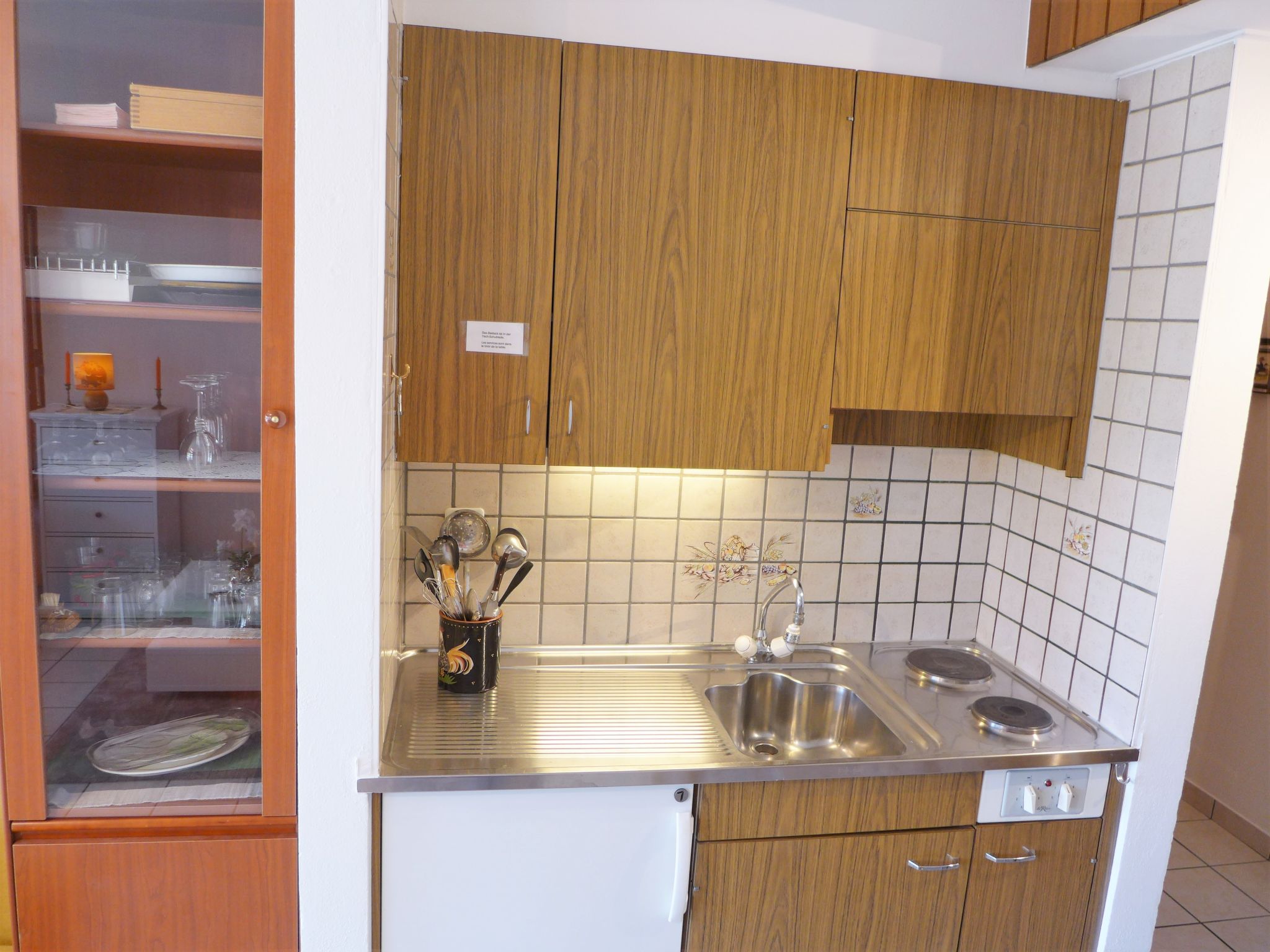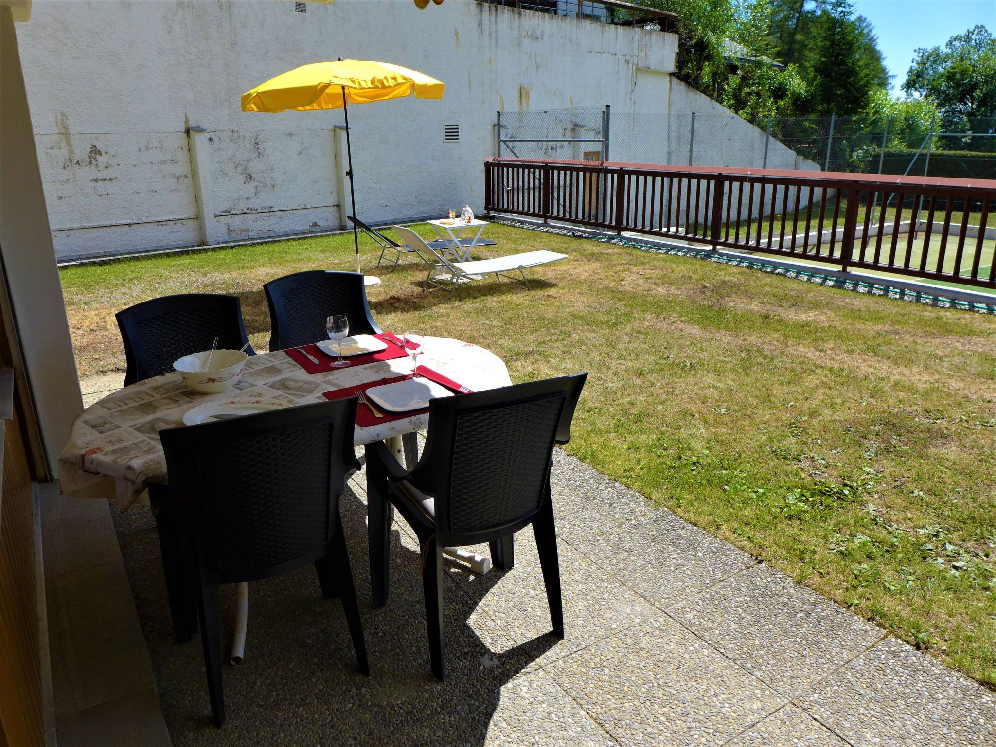 "Valdor A 42 Sud", 1-Zimmer-Studio 32 m2, im Erdgeschoss, Südwestlage. Einfach und komfortabel eingerichtet: Wohnzimmer mit 1 Diwanbett (140 cm, Länge 190 cm), Esstisch, Kabel-TV, Flachbildschirm, Radio, CD und DVD. Ausgang zum Garten, zur Terrasse, Richtung Südwesten. Kochnische (2 Kochplatten, Toaster, Wasserkocher, elektrische Kaffeemaschine, Kapseln für die Kaffeemaschine (Dolce Gusto) extra, Racletteofen, Kombinationsmikrowelle, Fondue Set (Chinoise, Käse)). Bad/WC. Grosse Terrasse, Rasen. Terrassenmöbel, Elektrogrill, Liegestühle (2). Fernsicht auf die Berge. Zur Verfügung: Bügeleisen, Haartrockner. Internet (Wireless LAN, gratis). Bitte beachten: Nichtraucher-Unterkunft.