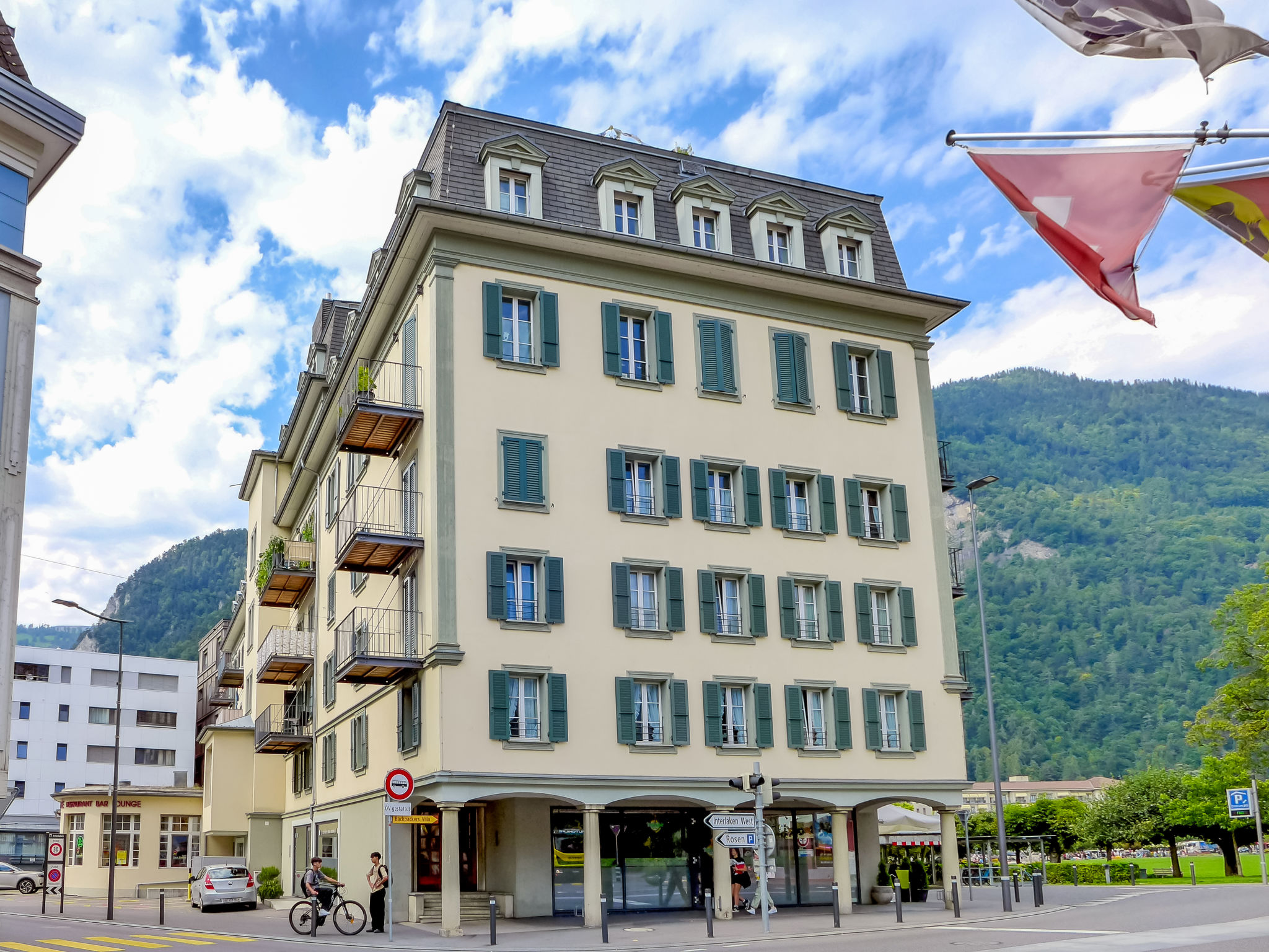 Interlaken: Grosses, schönes Appartementhaus "Residence National". Im Ortszentrum von Interlaken, zentrale, belebte Lage. Im Hause: Fahrstuhl, Zentralheizung. Einkaufsgeschäft 50 m, Supermarkt 600 m, Einkaufszentrum 50 m, Restaurant 10 m, Bar 5 m, Café 50 m, Bushaltestelle "Centralplatz oder Sonnenhof" 150 m, Bahnstation "Interlaken West" 600 m, Freibad 1 km, Hallenbad 1 km, Strandbad 3 km. Golfplatz (18 Loch) 4.5 km, Tennis 200 m, Minigolf 1 km, Reitstall 1.5 km, Sportzentrum 200 m, Bergeisenbahn 800 m, Skisportanlagen 12 km, Skibushaltestelle 300 m, Eisfeld 100 m, Kinderspielplatz 150 m. Nahe gelegene Sehenswürdigkeiten: Jungfraujoch, Schilthorn, Tell Freilichspiele. Bekannte Skigebiete sind gut erreichbar: Wengen - Kleine Scheidegg, Grindelwald - First, Mürren - Schilthorn. Bekannte Seen in der Umgebung sind gut erreichbar: Thunersee, Brienzersee. Wandergebiete: Jungfrau Region. Bitte beachten: Objekt geeignet für 2 Erwachsene + 2 Kinder. Gratis Skibus. Der gratis Skibus fährt zum Skigebiet Grindelwald. Bitte beachten: Be- und Entladen am Ferienhaus möglich.