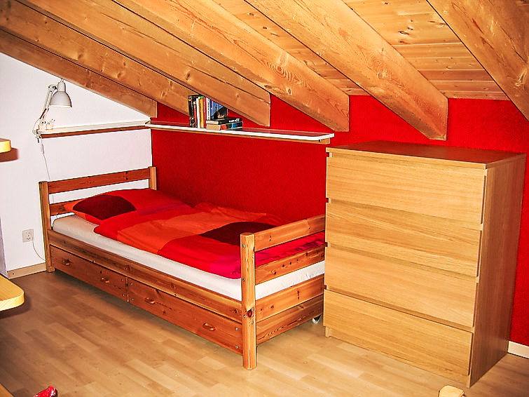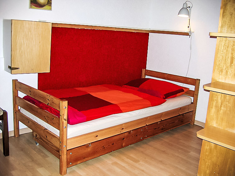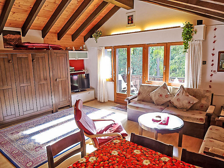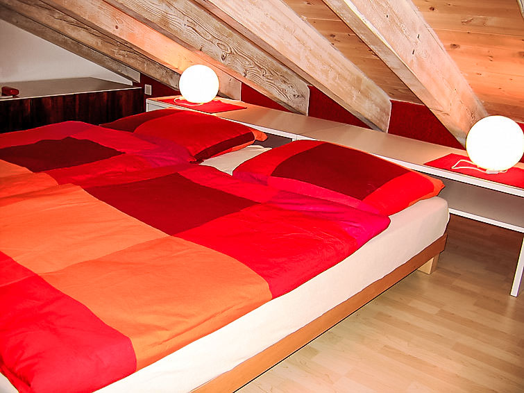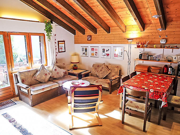 3-Zimmer-Wohnung 62 m2 im 4. Stock. Komfortabel und gemütlich eingerichtet: Wohn-/Esszimmer mit 1 Wandschrankbett und Sat-TV (Flachbildschirm), Stereoanlage und DVD. Ausgang zum Balkon. 1 abgeschrägtes Zimmer mit 2 Betten (90 cm, Länge 200 cm). 1 abgeschrägtes Zimmer mit 1 Doppelbett (180 cm, Länge 200 cm). Offene Küche (Backofen, Geschirrspüler, 4 Glaskeramikplatten). Bad/WC. Balkon. Balkonmöbel. Schöne Sicht auf die Berge, die Landschaft und die Ortschaft. Zur Verfügung: Internet (Wireless LAN, gratis). Parkplatz (extra) beim Haus. Bitte beachten: Nichtraucher-Unterkunft. Bitte beachten: Das Doppelzimmer ist nur durch das 1. Schlafzimmer erreichbar. Als Familienwohnung geeignet. Niedrige Türrahmen (ca. 1.60m) zu den Schlafzimmern.