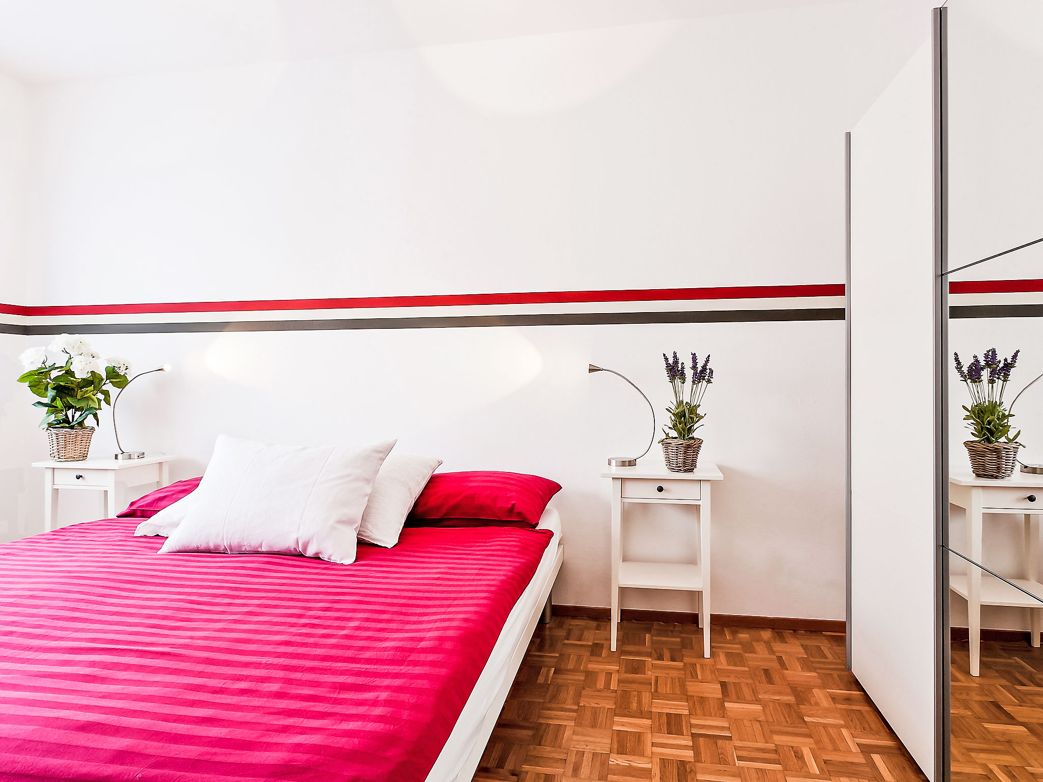 "Junior Suite", 2-Zimmer-Wohnung 50 m2 im 2. Stock, Südlage. Zweckmässig eingerichtet: Wohn-/Esszimmer mit 1 Doppeldiwanbett (1 x 160 cm, Länge 200 cm), Sat-TV und Radio. 1 Zimmer mit 2 Betten (90 cm, Länge 200 cm). Küche (4 Kochplatten, Backofen, Geschirrspüler). Bad/WC. Warmluftheizung. Balkon. Terrassenmöbel. Zur Verfügung: Internet (Wireless LAN, gratis). Maximal 1 Haustier/Hund erlaubt. NL-00008121