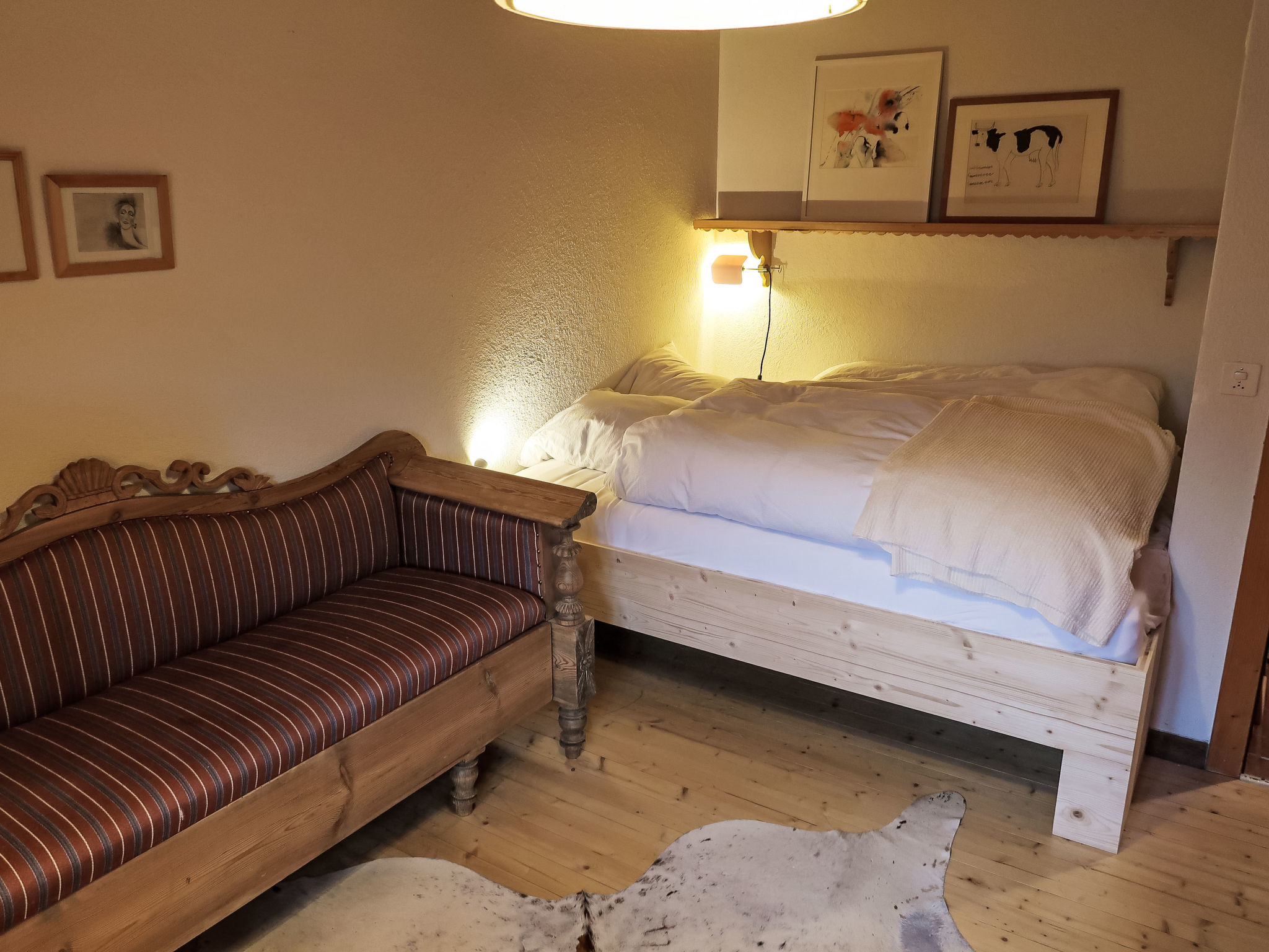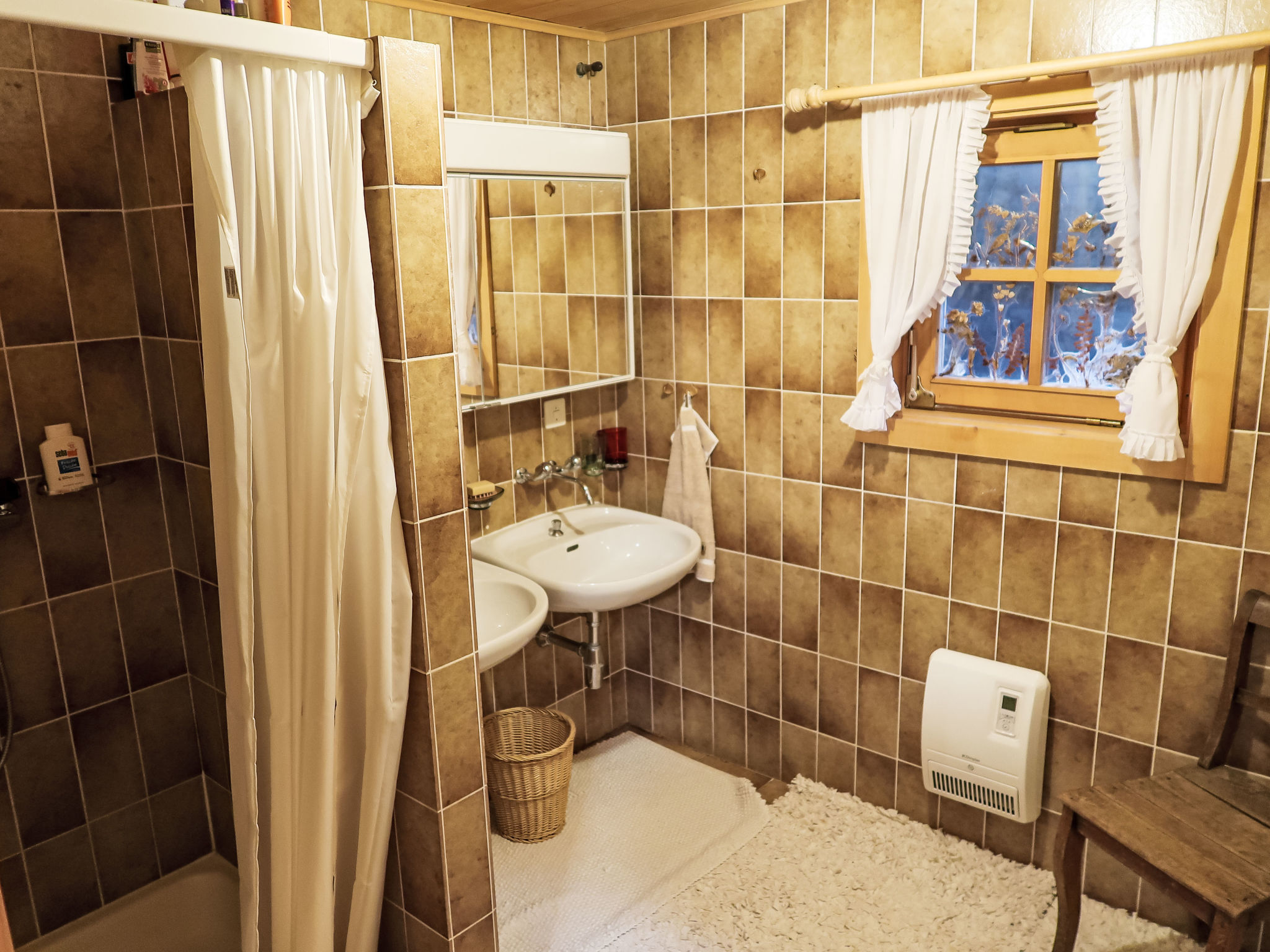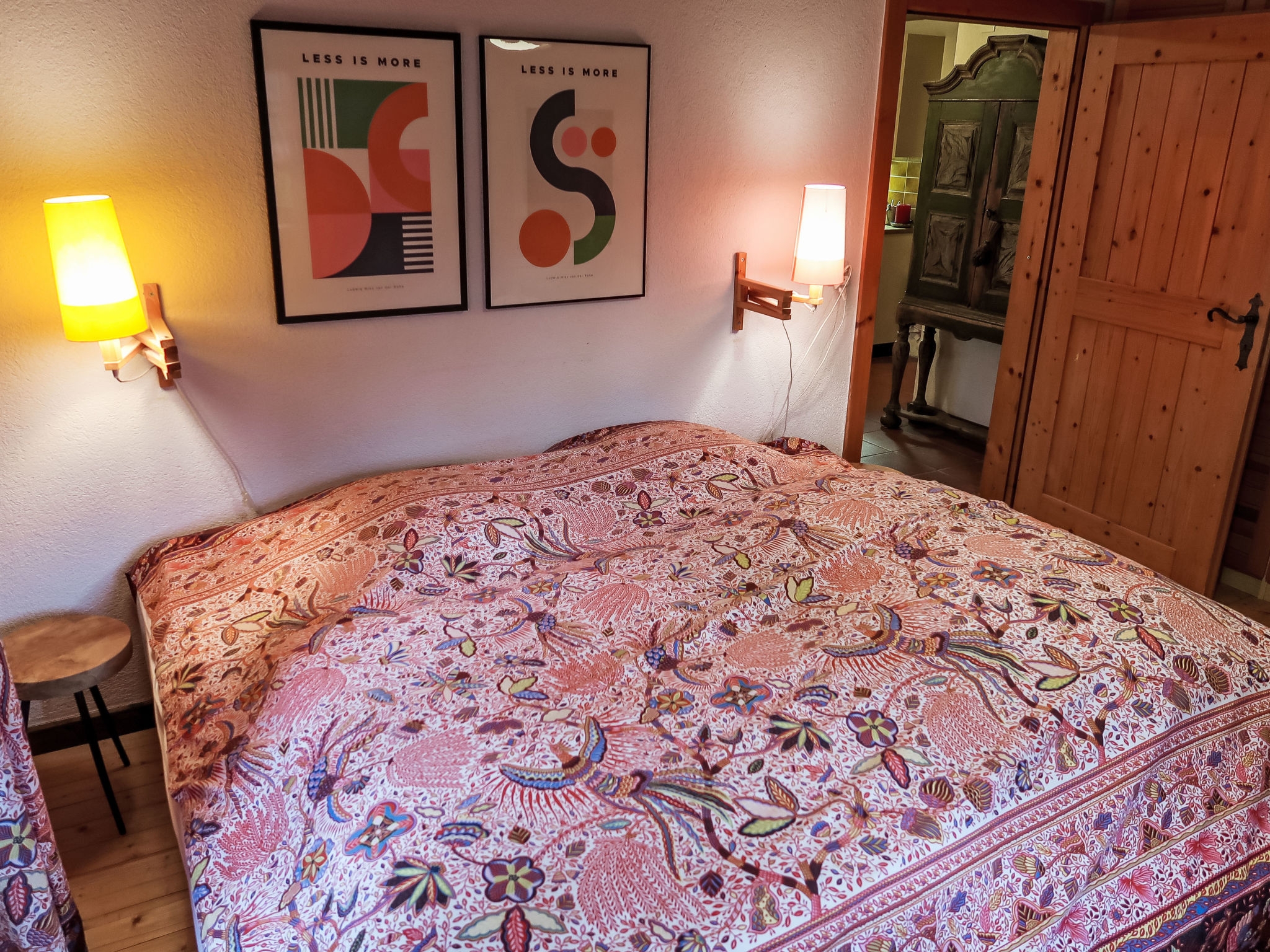 4-Zimmer-Wohnung 80 m2, im Erdgeschoss. Rustikal und gemütlich eingerichtet: Wohn-/Esszimmer. Ausgang zum Gartensitzplatz. 3 Doppelzimmer. Offene Küche (4 Kochplatten, Backofen, Geschirrspüler, Toaster, Wasserkocher, Racletteofen, Fondue Set (Käse)). Dusche, sep. WC. E-Heizung, Boiler (300 Liter). Gartensitzplatz 40 m2. Terrassenmöbel, Abstellkammer. Schöne Sicht auf die Berge, das Tal und die Landschaft. Parkplatz, Garage Nr. 12 in 50 m. Bitte beachten: Nichtraucher-Unterkunft.