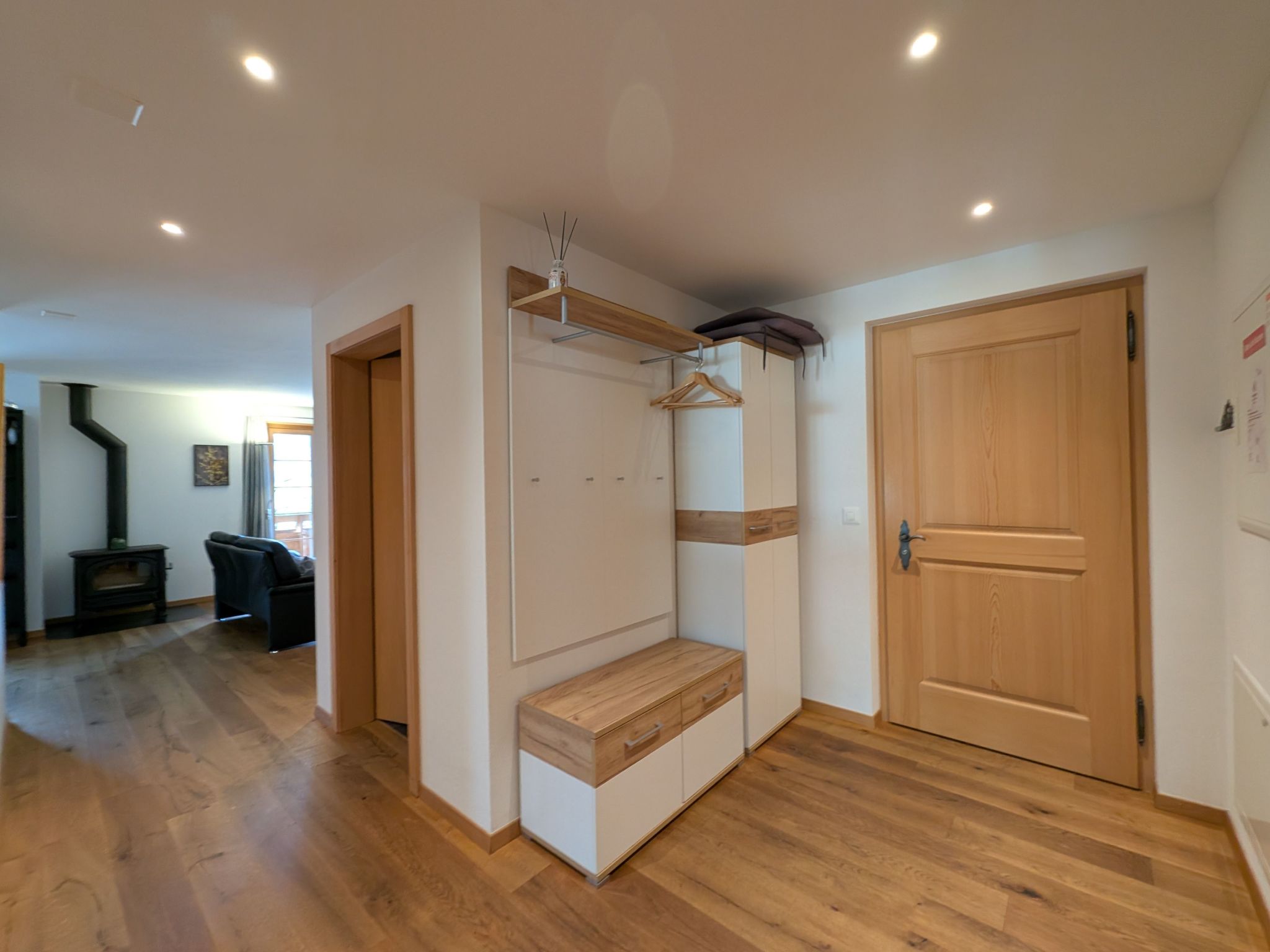 Im Inneren erwartet Sie eine voll ausgestattete Küche mit großem Esstisch, 4 Kochplatten, Backofen, Mikrowelle, Kühlschrank, zwei Arten von Kaffeemaschinen (Filter und Nespresso), einem Fondue Set sowie einem Racletteofen und Geschirrspüler. Erleben Sie gemütliche Abende im Wohnzimmer mit einer Polstergruppe und einem wärmenden Schwedenofen, ergänzt durch einen Bürotisch und einen Sessel für entspannende Lesestunden. Für Ihren Komfort stehen Ihnen zwei Schlafzimmer mit Doppelbetten (180 x 200 cm), ein Badezimmer mit Dusche/WC und ein weiteres Badezimmer mit Bad/WC zur Verfügung, alle mit hochwertigem Parkettboden ausgestattet.