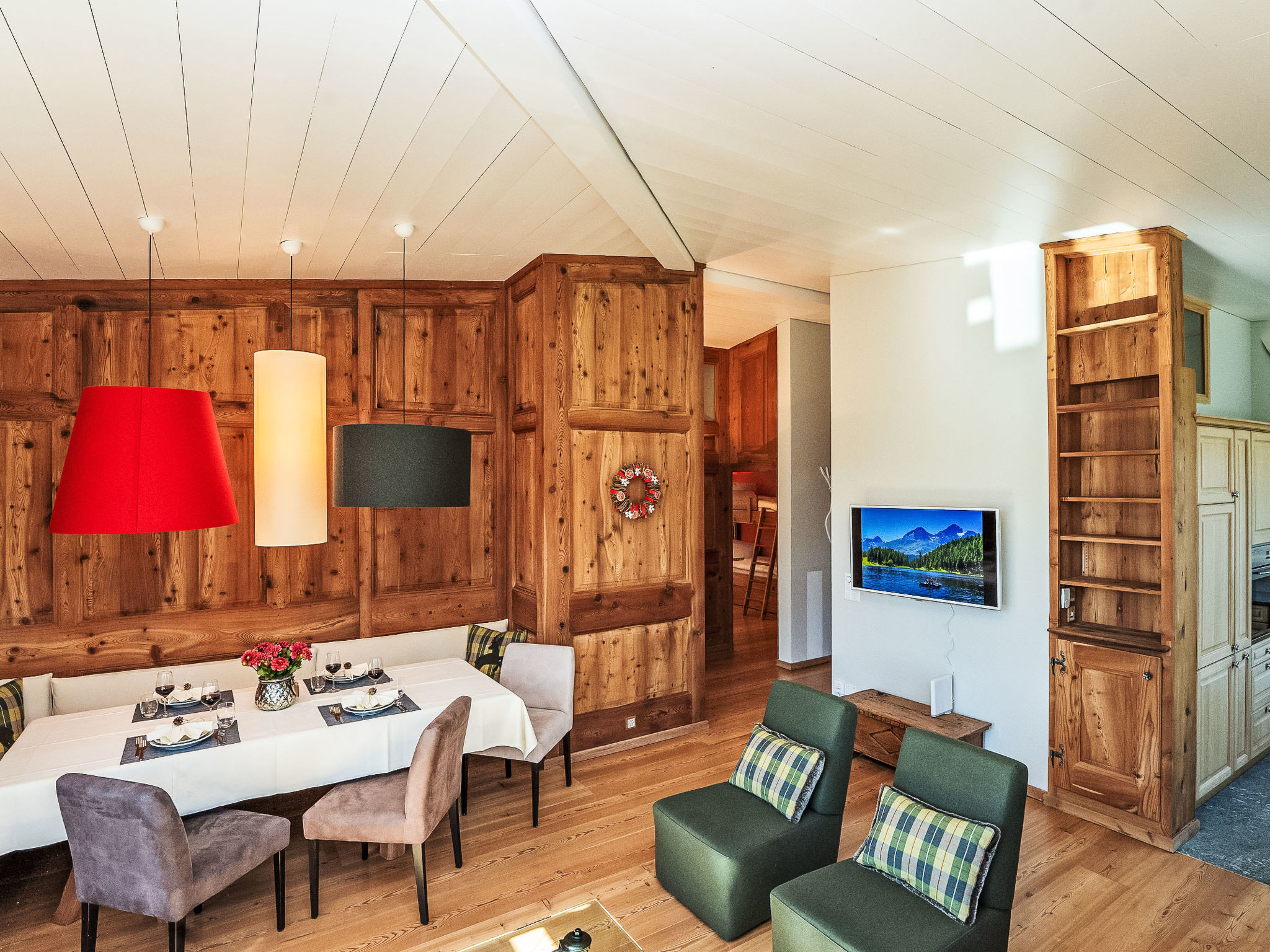 "Chesa Spuonda Verde 2.5", 3-Zimmer-Wohnung 80 m2 im 4. Stock. Hell, schön und geschmackvoll eingerichtet: offenes Wohn-/Esszimmer mit Panoramafenster mit Esstisch und TV (Flachbildschirm). 1 Doppelzimmer mit 1 Doppelbett (2 x 90 cm, Länge 210 cm). Ausgang zum Balkon. 1 Zimmer mit 1 x 2 Etagenbetten (90 cm, Länge 190 cm). Offene Küche (Backofen, Geschirrspüler, 4 Glaskeramikplatten, Toaster, Wasserkocher, Mikrowelle, Tiefkühler, elektrische Kaffeemaschine, Kapseln für die Kaffeemaschine (Nespresso) extra, Racletteofen, Fondue Set (Käse)). Ausgang zum Balkon. Dusche/WC, Bad/Dusche/WC. Heizung. Parkettboden. Balkonmöbel. Herrliche Panoramasicht auf den See, die Berge und die Landschaft. Zur Verfügung: Haartrockner. Internet (WLAN). Garage Nr. 3 (1 Auto), Höhe 270 cm, Breite 240 cm. Bitte beachten: nicht geeignet für Kinder unter 3 Jahren. Nichtraucher-Unterkunft, Nichtraucher-Haus. Maximal 1 Haustier/Hund erlaubt.