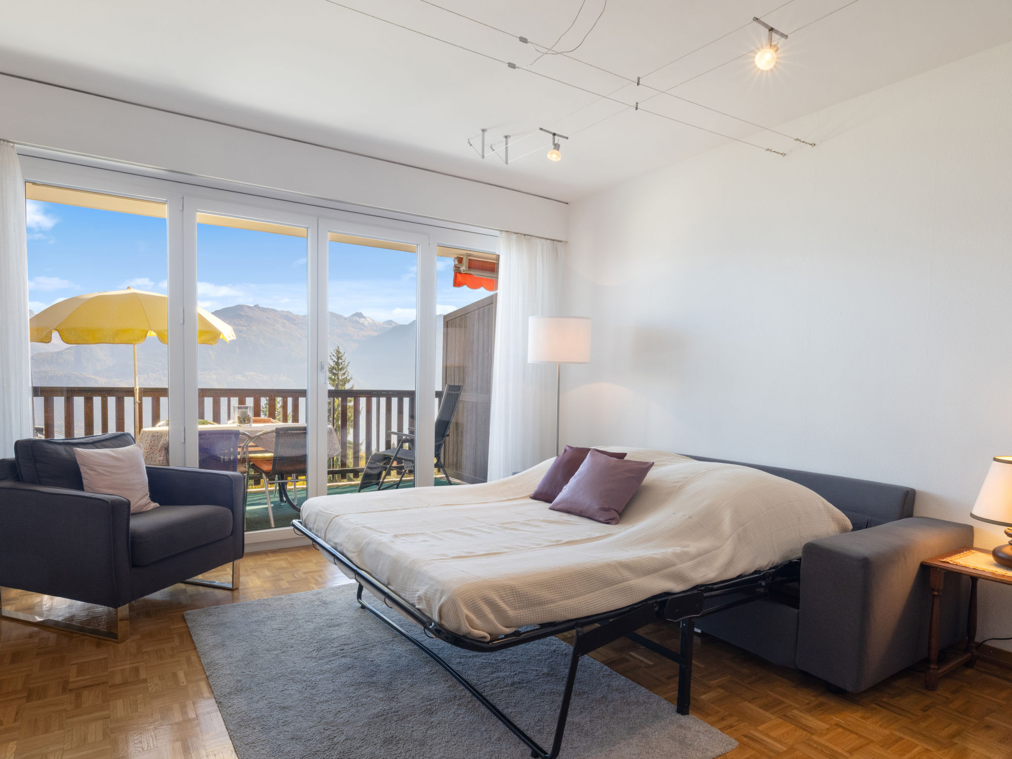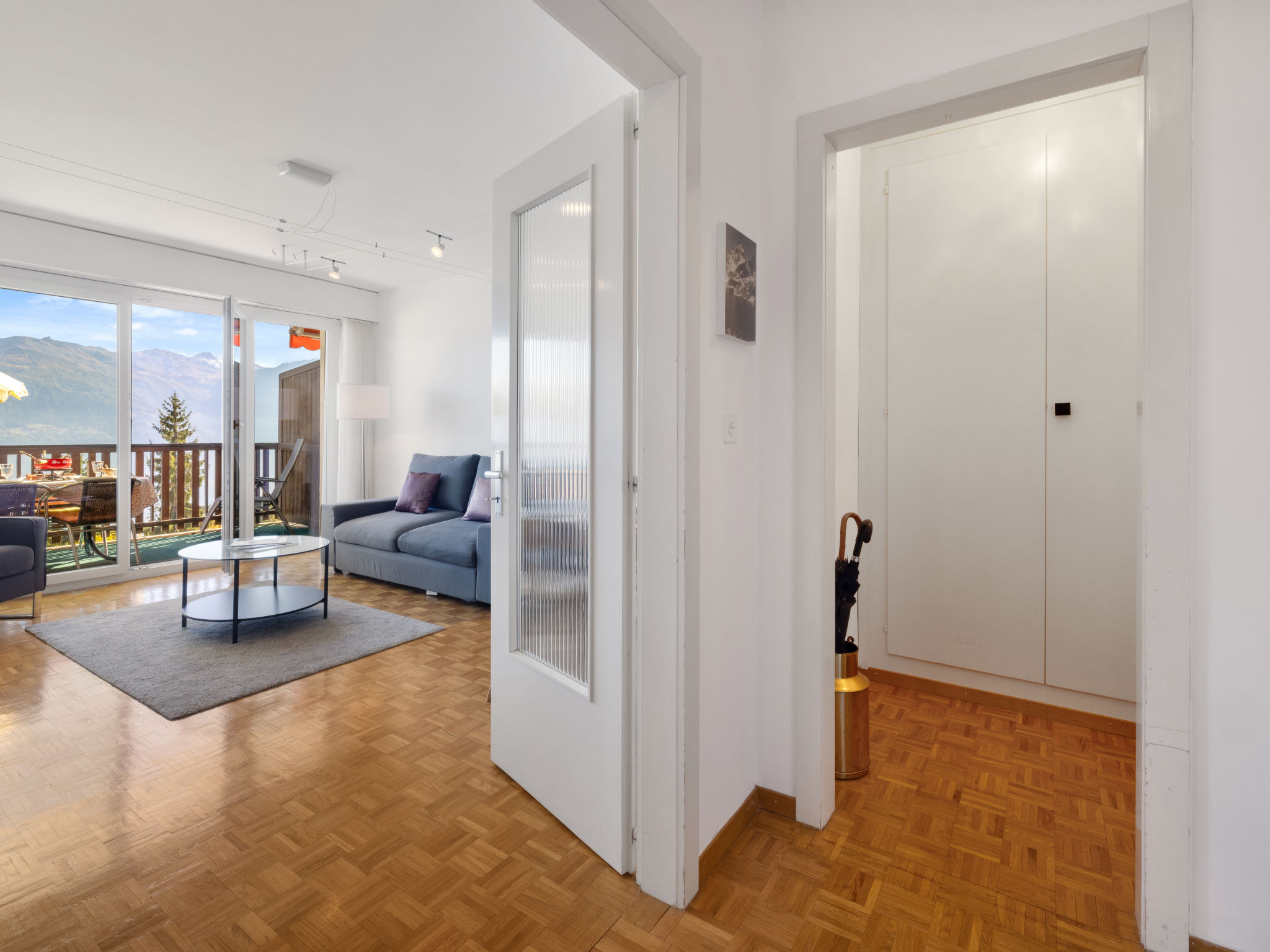 Residenz "Marigny Dent-Blanche". Im Ortsteil Marigny, 1.5 km vom Zentrum von Montana, ruhige, sonnige Lage, 150 m vom Waldrand, 1.3 km vom See, Richtung Süden. In der Anlage: Fahrstuhl, Skiraum, Zentralheizung, Waschmaschine (extra), Wäschetrockner (zur Mitbenutzung), Trockenraum. Parkplatz (beschränkte Anzahl). Einkaufsgeschäft 1.5 km, Supermarkt 1.6 km, Restaurant 1.5 km, Bäckerei 900 m, Bushaltestelle "Marigny" 50 m, Bahnstation "Funiculaire Montana Gare" 1.1 km, Badesee "Moubra" 1.3 km. Golfplatz (18 Loch) 3 km, Tennis 1.4 km, Tennishalle 1.4 km, Skisportanlagen 1.3 km, Eisfeld 2 km. Bekannte Seen in der Umgebung sind gut erreichbar: Lac Grenon 2.5 km, Etang Long 3 km. Bitte beachten: Gratis Skibus.