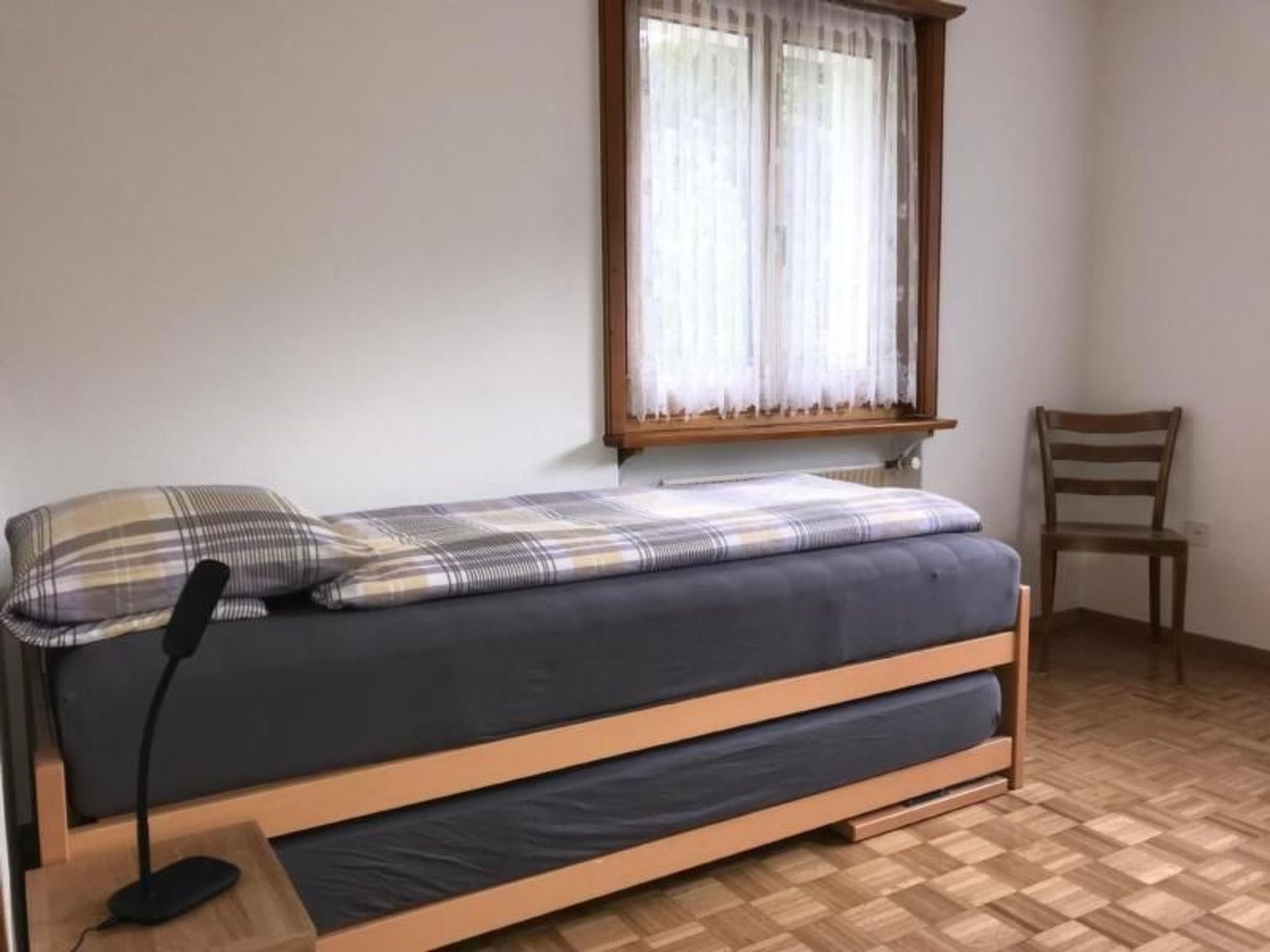Separates Wohnzimmer mit Parkettboden, Swisscom TV, WiFi.