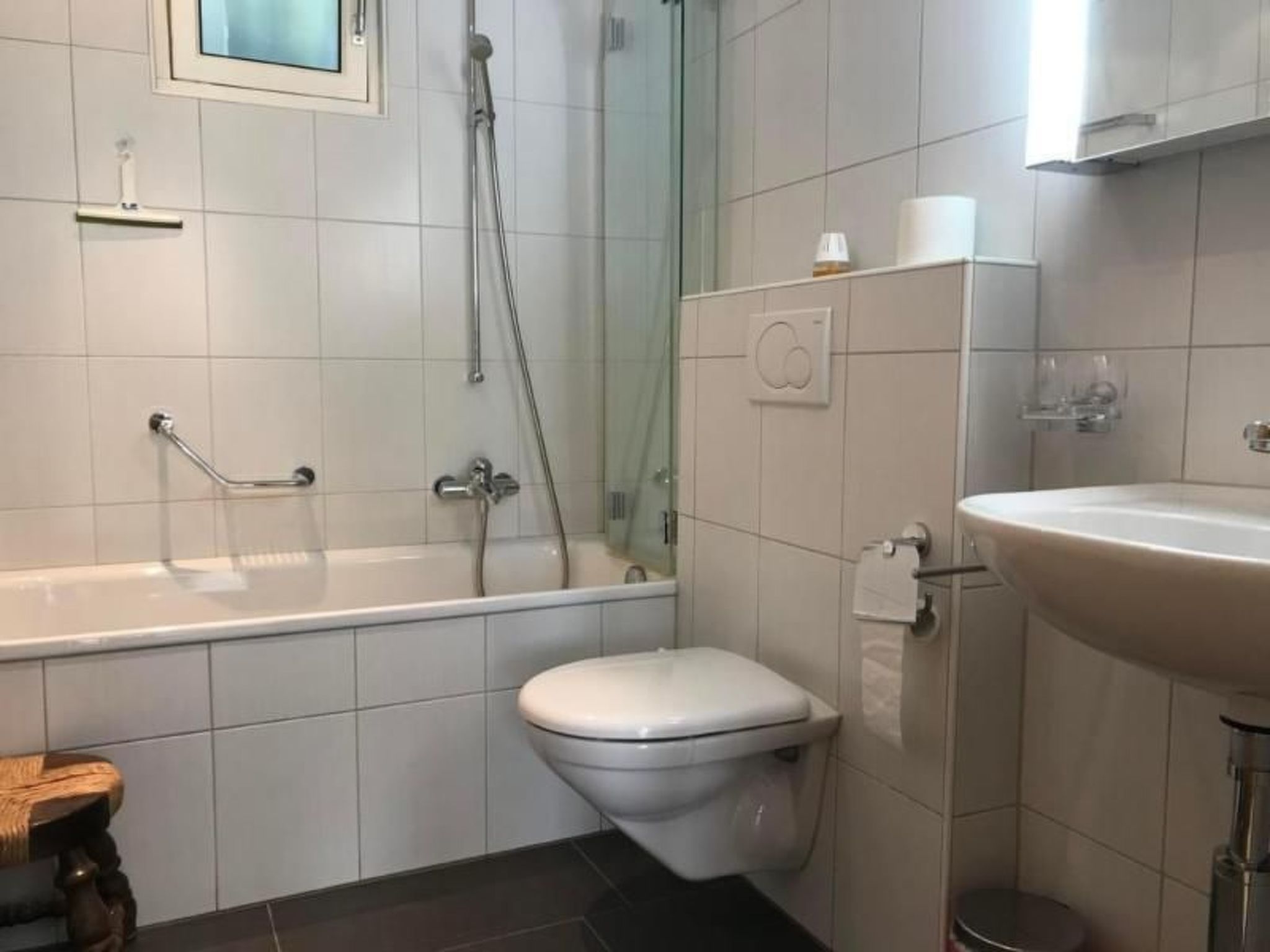Badezimmer mit Badewanne, Duschwand und WC. Waschmaschine und Tumbler auf Anfrage.