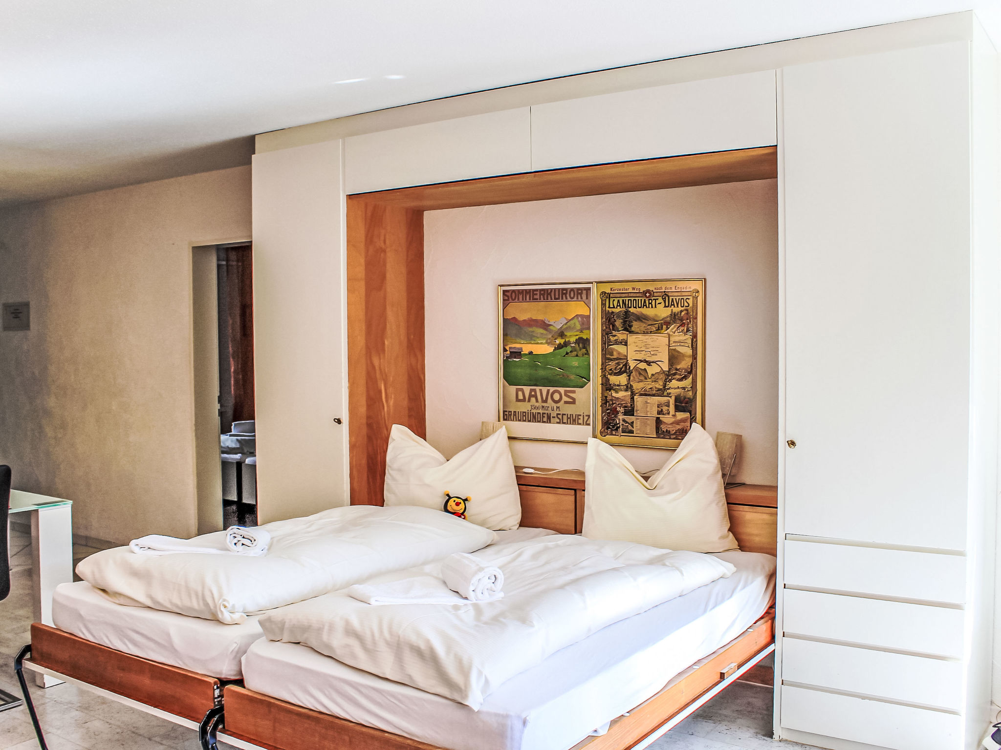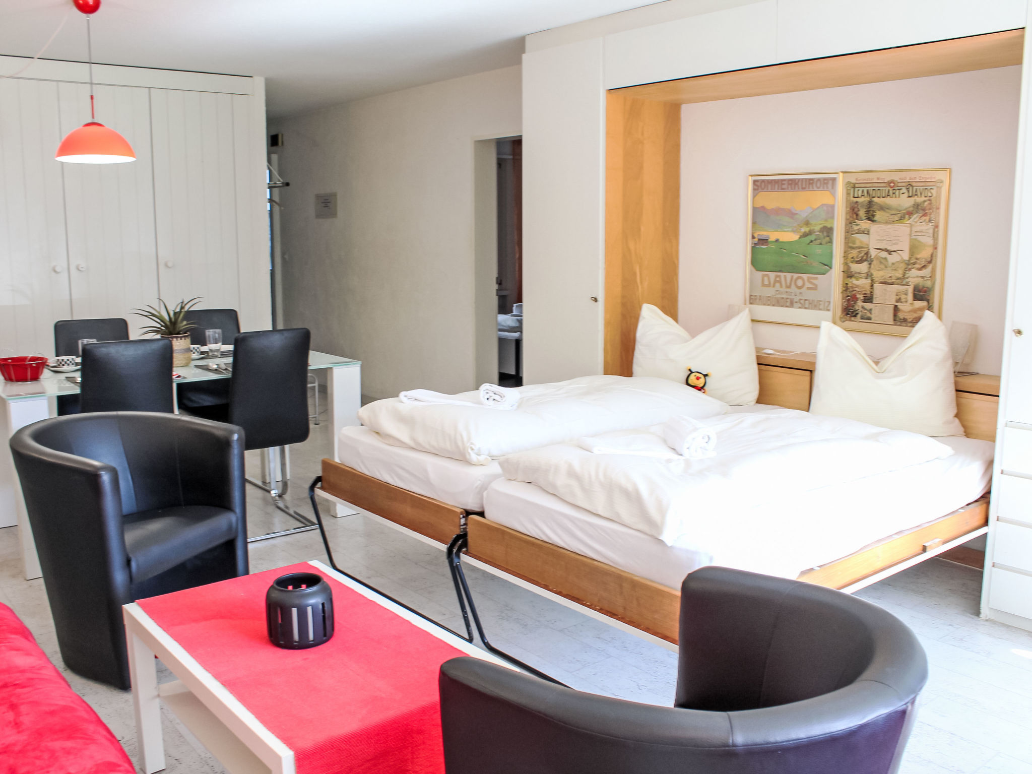 Kinderfreundliches, gemütliches Mehrfamilienhaus "Seewiese", 1'560 m.ü.M., auf 6 Stockwerken, Baujahr 1970. Am Ortsrand, 250 m vom Zentrum, zentrale, sonnige Lage, an einer Hauptstrasse. Zur Mitbenutzung: Grundstück, Hallenbad (8 x 20 m, saisonale Verfügbarkeit: 05.Jun. - 20.Okt. und 20.Nov. - 20.Apr.). Im Hause: Sauna, Fitnessraum, Tischtennis, Spielzimmer, Fahrstuhl, Einstellraum für Fahrräder, Skiraum, Zentralheizung, Waschmaschine, Wäschetrockner (zur Mitbenutzung, extra), Trockenraum. Zufahrt bis zum Haus. Gemeinschaftsgarage beim Haus. Maße: Höhe 190 cm. Einkaufsgeschäft, Lebensmittelgeschäft, Supermarkt 250 m, Restaurant 150 m, Bushaltestelle 100 m, Bahnstation "Davos Dorf" 250 m, Freibad 400 m, See Davoser See 250 m. Golfplatz (9 Loch) 1 km, Reitstall 700 m, Luftseilbahn 1.5 km, Bergeisenbahn, Skilift, Skisportanlagen, Skipisten, Skiverleih 300 m, Skibushaltestelle 100 m, Skischule 300 m, Schlittelbahn 1.5 km, Langlaufloipe 300 m, Kinderspielplatz 250 m.