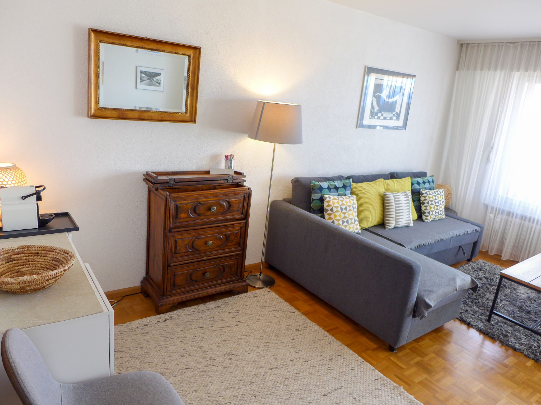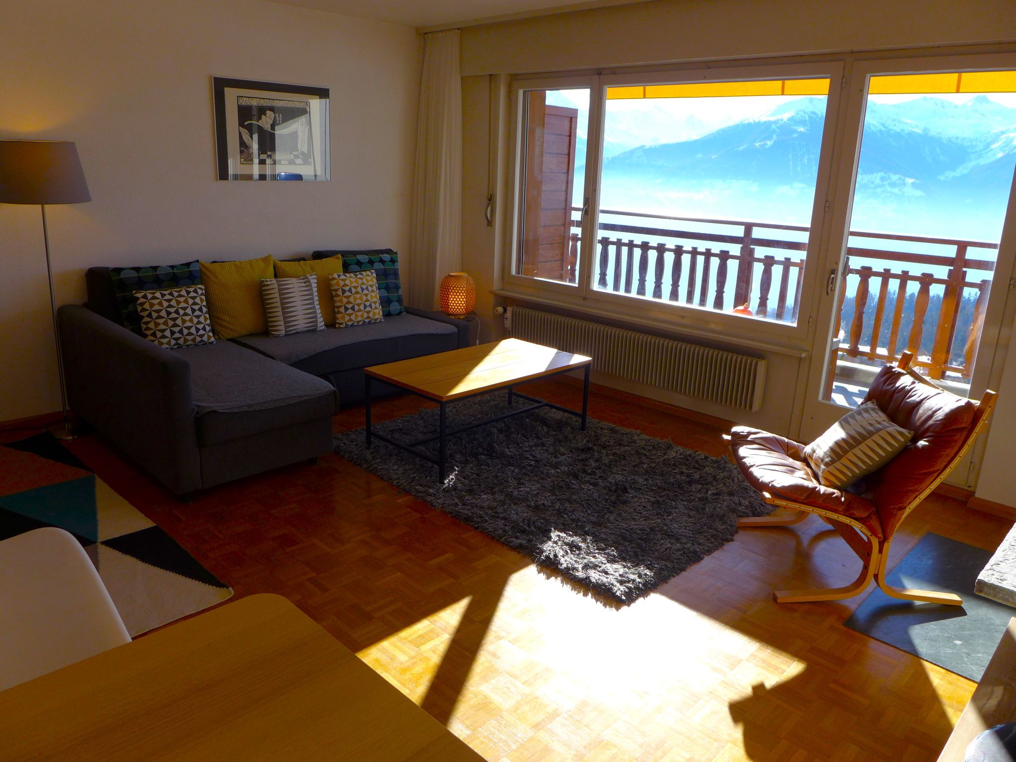 "Eden Roc 29", 2-Zimmer-Wohnung 60 m2 im 5. Stock. Hell, komfortabel und schön eingerichtet: Wohn-/Esszimmer mit 1 Diwanbett (140 cm, Länge 200 cm), Kabel-TV, Radio, CD und DVD. Ausgang zum Balkon. 1 Zimmer mit 1 franz. Bett (160 cm, Länge 200 cm). Küche (3 Kochplatten, Backofen, Geschirrspüler, Toaster, Wasserkocher, Mikrowelle, elektrische Kaffeemaschine, Kapseln für die Kaffeemaschine (Nespresso) extra, Fondue Set (Käse)). Bad/Bidet/WC, sep. WC. Südlage. Balkonmöbel, Liegestühle (2). Panoramasicht auf die Berge und die Landschaft. Zur Verfügung: Waschmaschine, Bügeleisen, Haartrockner. Internet (Wireless LAN, gratis). Bitte beachten: Nichtraucher-Unterkunft.