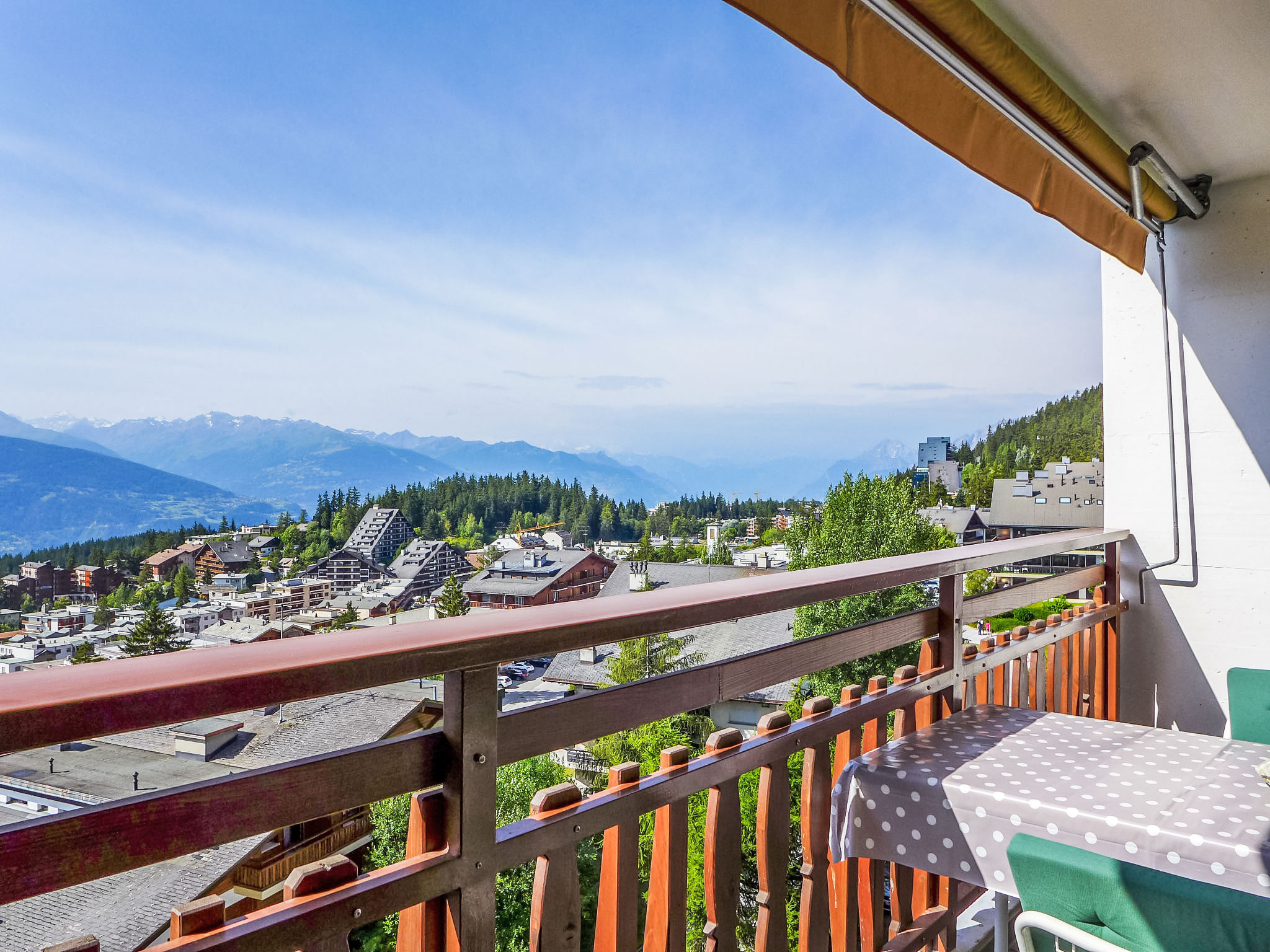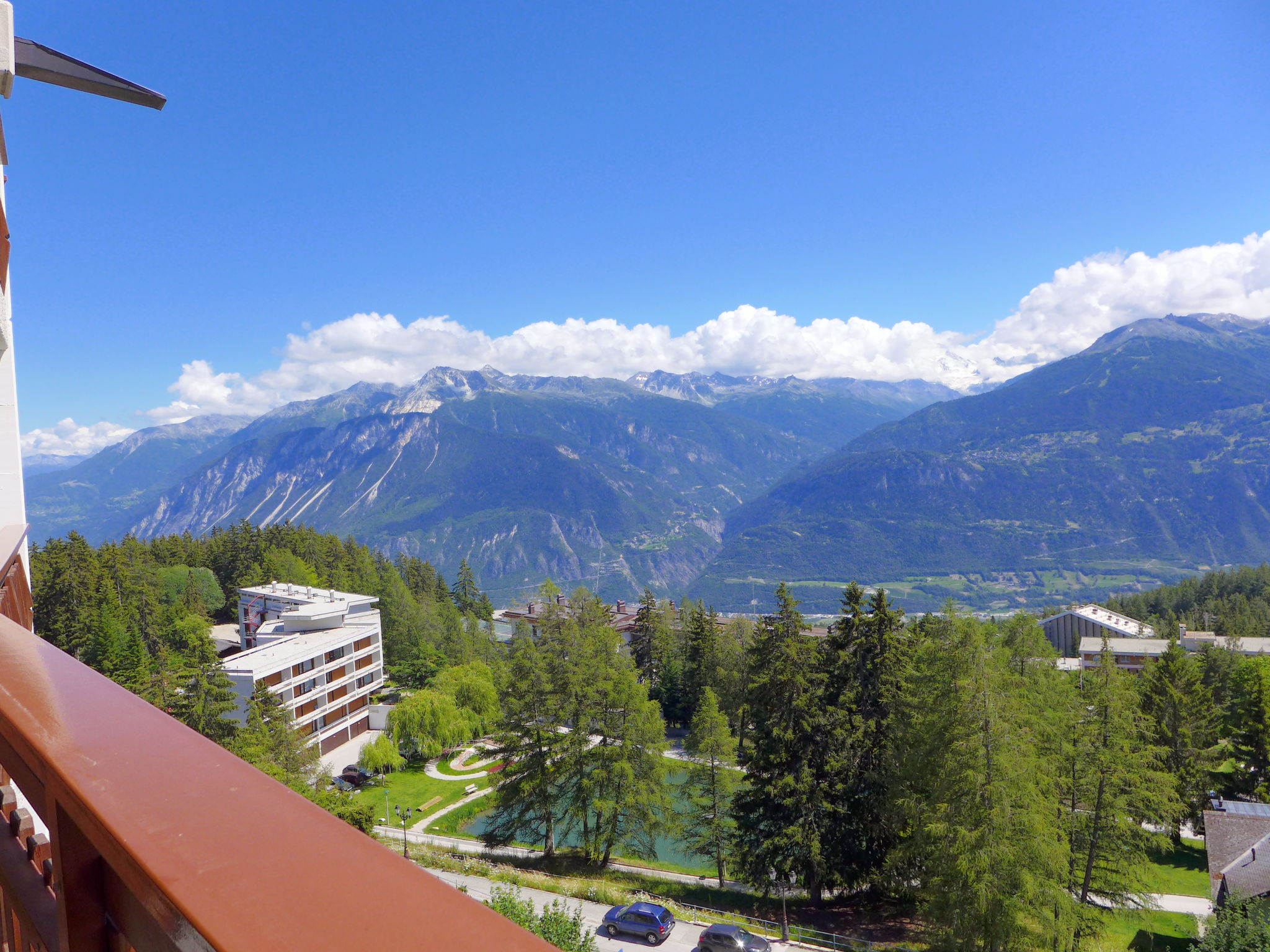 Mehrfamilienhaus "Eden Roc", auf 9 Stockwerken. Im Ort, 1.1 km vom Zentrum von Montana, ruhige, sonnige Lage, verkehrsberuhigte Zone, 50 m vom Waldrand, 950 m vom See, 600 m vom Skigebiet, in einer Sackgasse, Richtung Süden. Im Hause: Fahrstuhl, Skiraum, Zentralheizung, Waschmaschine, Wäschetrockner (zur Mitbenutzung, extra), Trockenraum. Parkplatz (beschränkte Anzahl). Einkaufsgeschäft 1 km, Supermarkt 1.2 km, Restaurant 1 km, Bäckerei 1.3 km, Zentrum zu Fuss in 5 Minuten erreichbar, Bushaltestelle "Résidence Forêt" 300 m, Bahnstation "Funiculaire Montana Gare" 2 km, Badesee "Moubra" 2.3 km. Golfplatz (18 Loch) 2.2 km, Skisportanlagen 600 m, Eisfeld 1.2 km. Bekannte Seen in der Umgebung sind gut erreichbar: Grenon 950 m, Etang Long 2.3 km. Bitte beachten: Gratis Skibus.