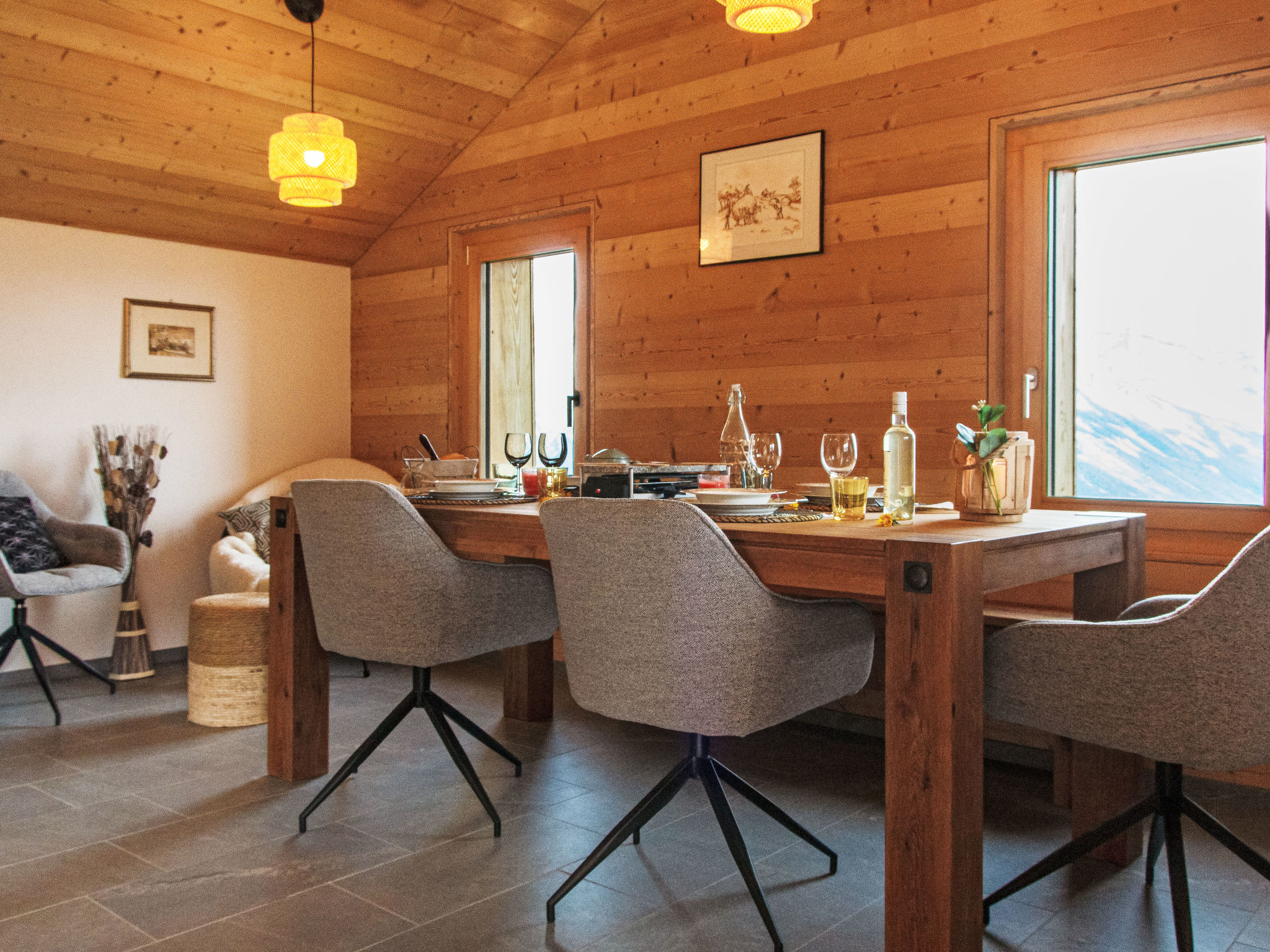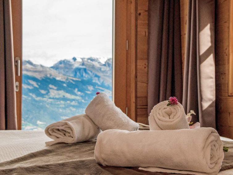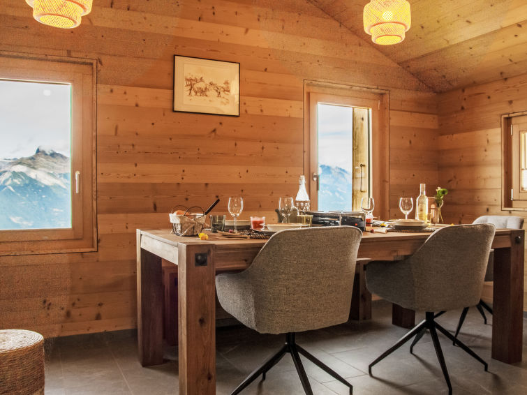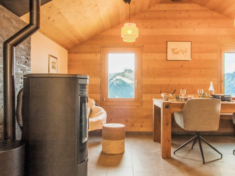 "Le mayen des Veillas", 4-Zimmer-Chalet 75 m2 auf 2 Stockwerken. Objekt geeignet für 2 Erwachsene + 2 Kinder. Vollständig renoviert im Jahre 2024, modern und gemütlich eingerichtet: Esszimmer mit Schwedenofen. Kleines Wohnzimmer mit TV. Offene Küche (Backofen, Geschirrspüler, 4 Induktionskochplatten, elektrische Kaffeemaschine, Kapseln für die Kaffeemaschine (Nespresso) extra, Racletteofen, Kombinationsmikrowelle, Fondue Set (Käse)). Sep. WC. E-Heizung. Unteres Geschoss: 1 Zimmer mit 1 Doppelbett (2 x 80 cm, Länge 200 cm). Ausgang zur Terrasse. 1 kleines Zimmer mit 2 Betten (90 cm, Länge 200 cm). Dusche/WC. Parkettboden. Terrasse, Ostlage, Gartensitzplatz, Nordlage und Südlage. Gartengrill. Sehr schöne Panoramasicht auf die Berge und das Tal. Zur Verfügung: Haartrockner. Internet (Wireless LAN). Parkplatz beim Haus, im Winter in 50 m. Bitte beachten: Nichtraucher-Unterkunft.