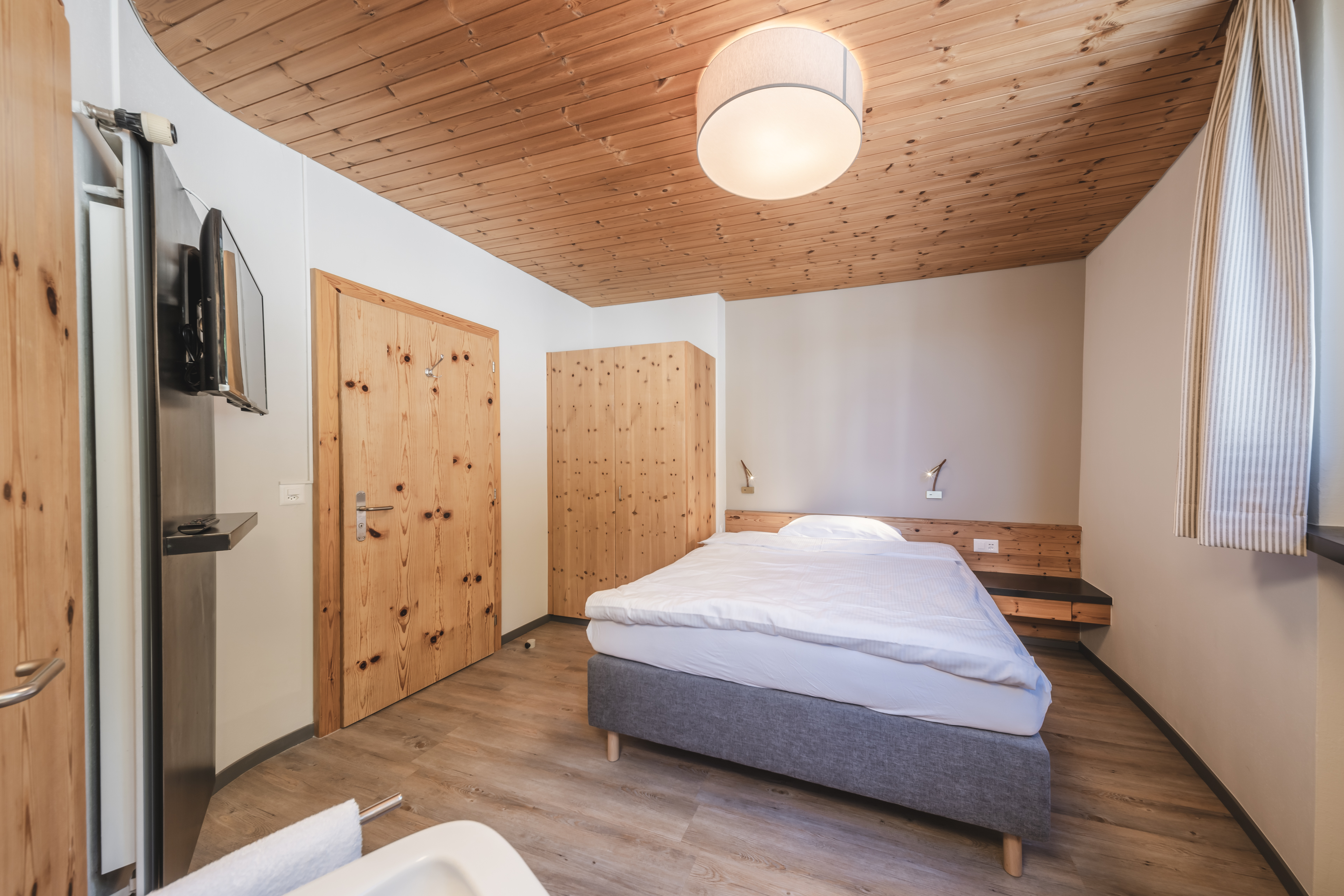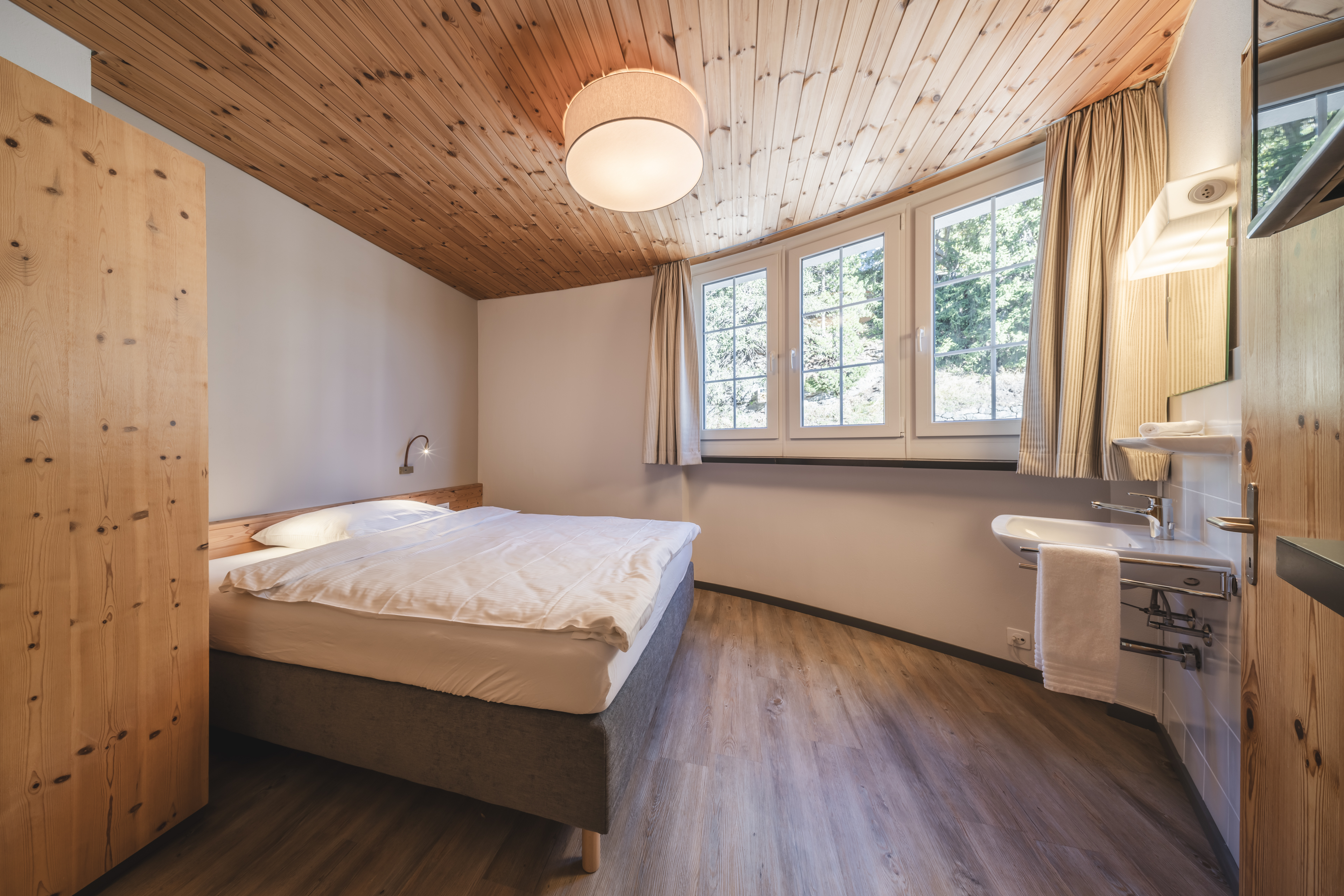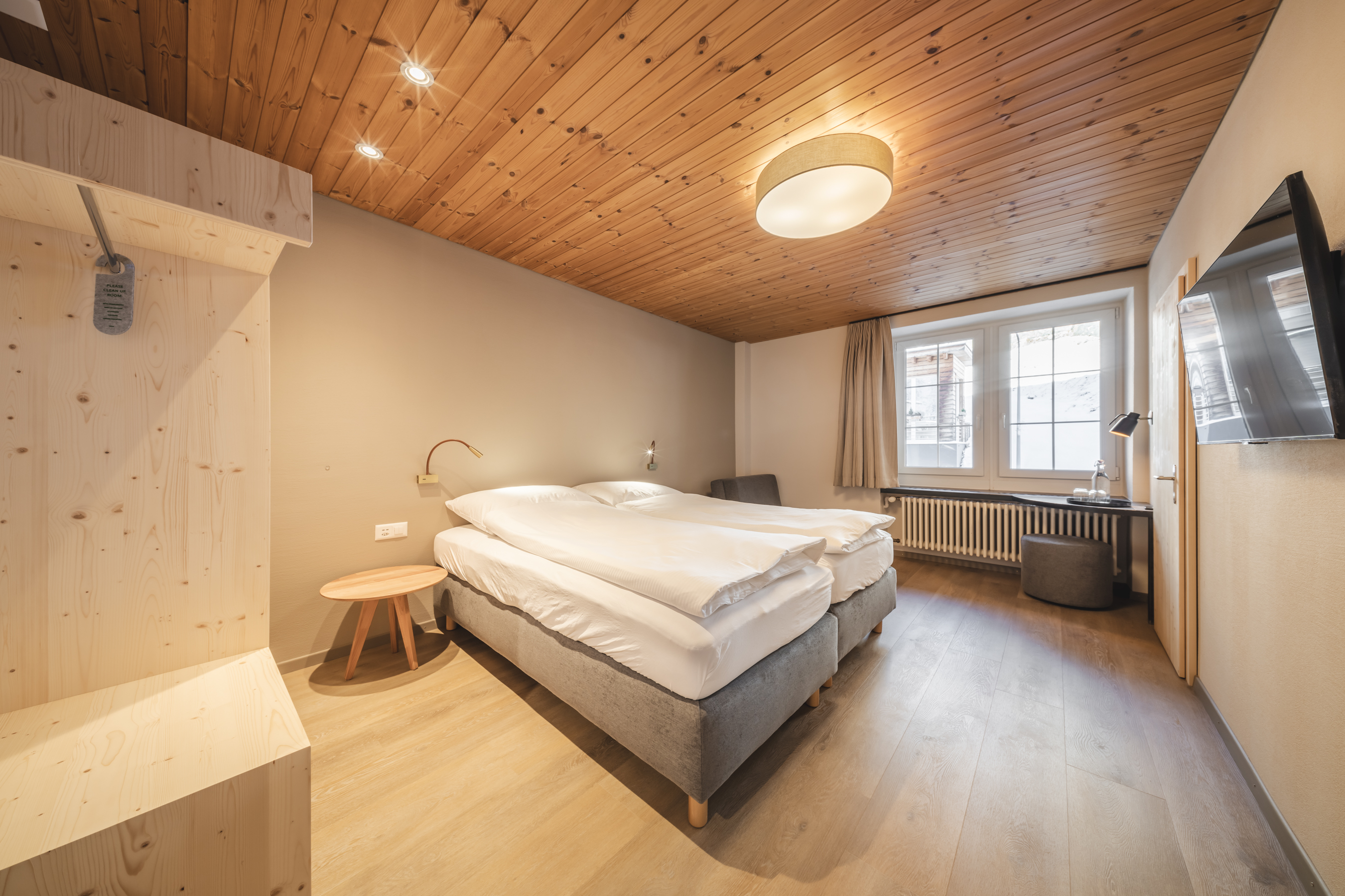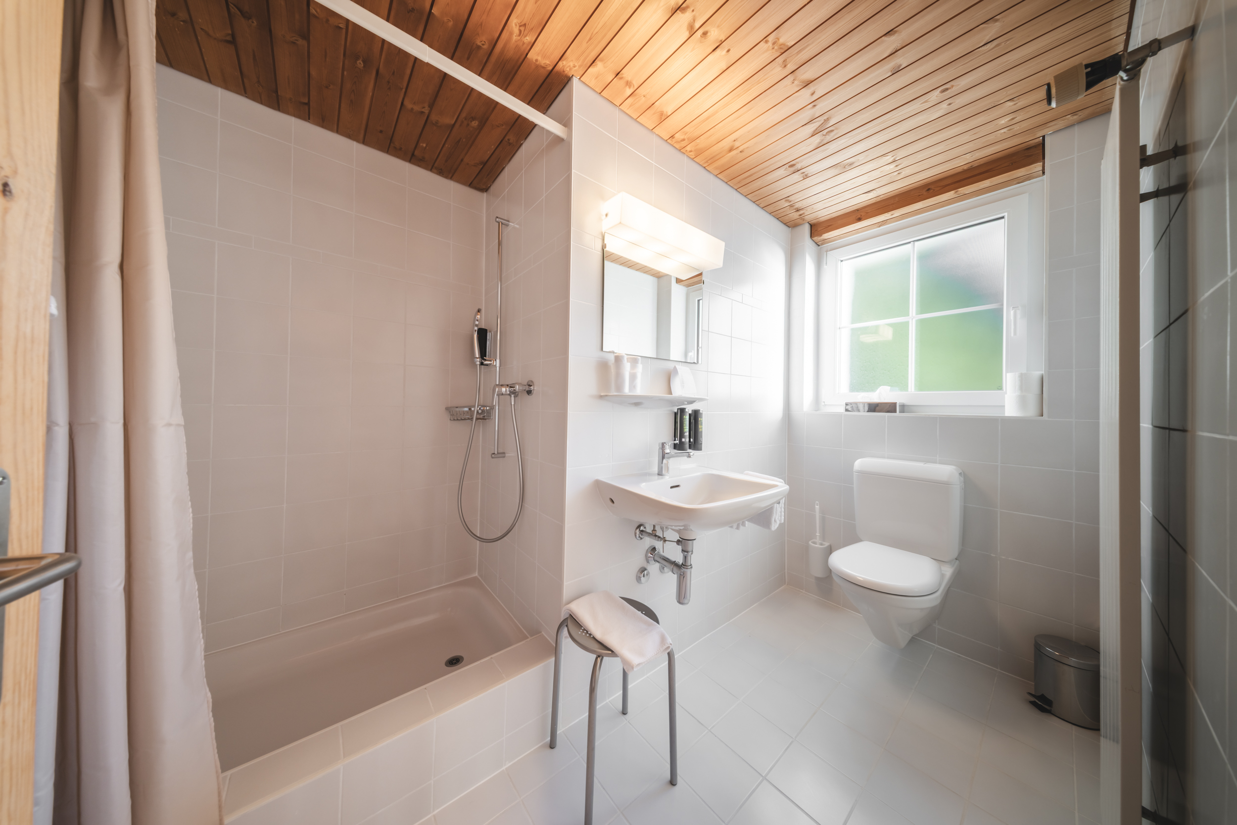 Alle Zimmer haben neue Boxspringbetten und das private Bad ist mit einer Dusche ausgestattet. Die Holzvertäfelung an den Decken verleiht den Zimmern eine warme, gemütliche Atmosphäre.