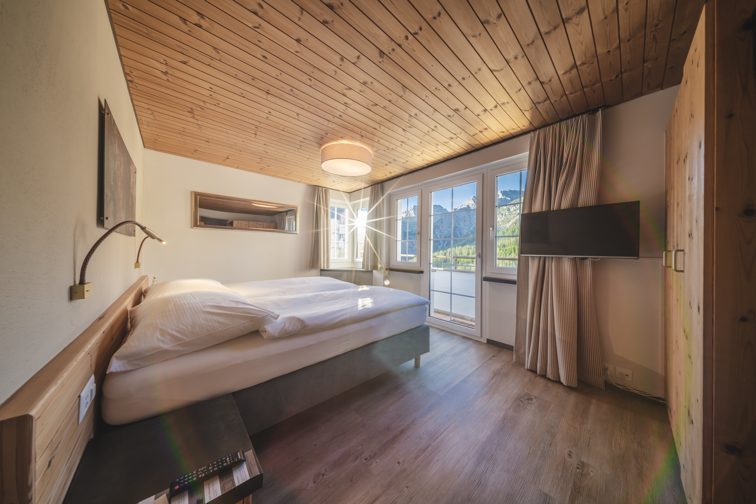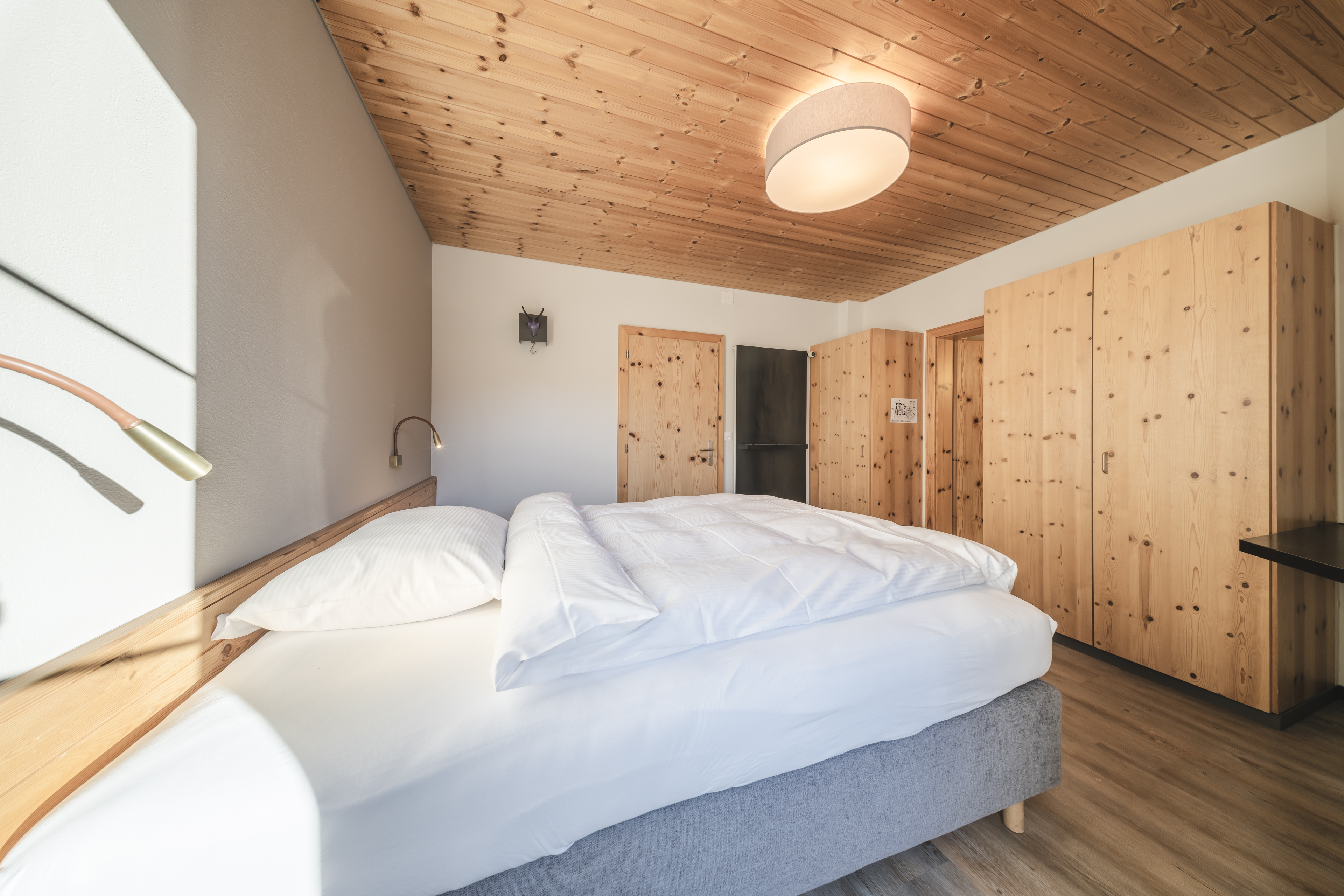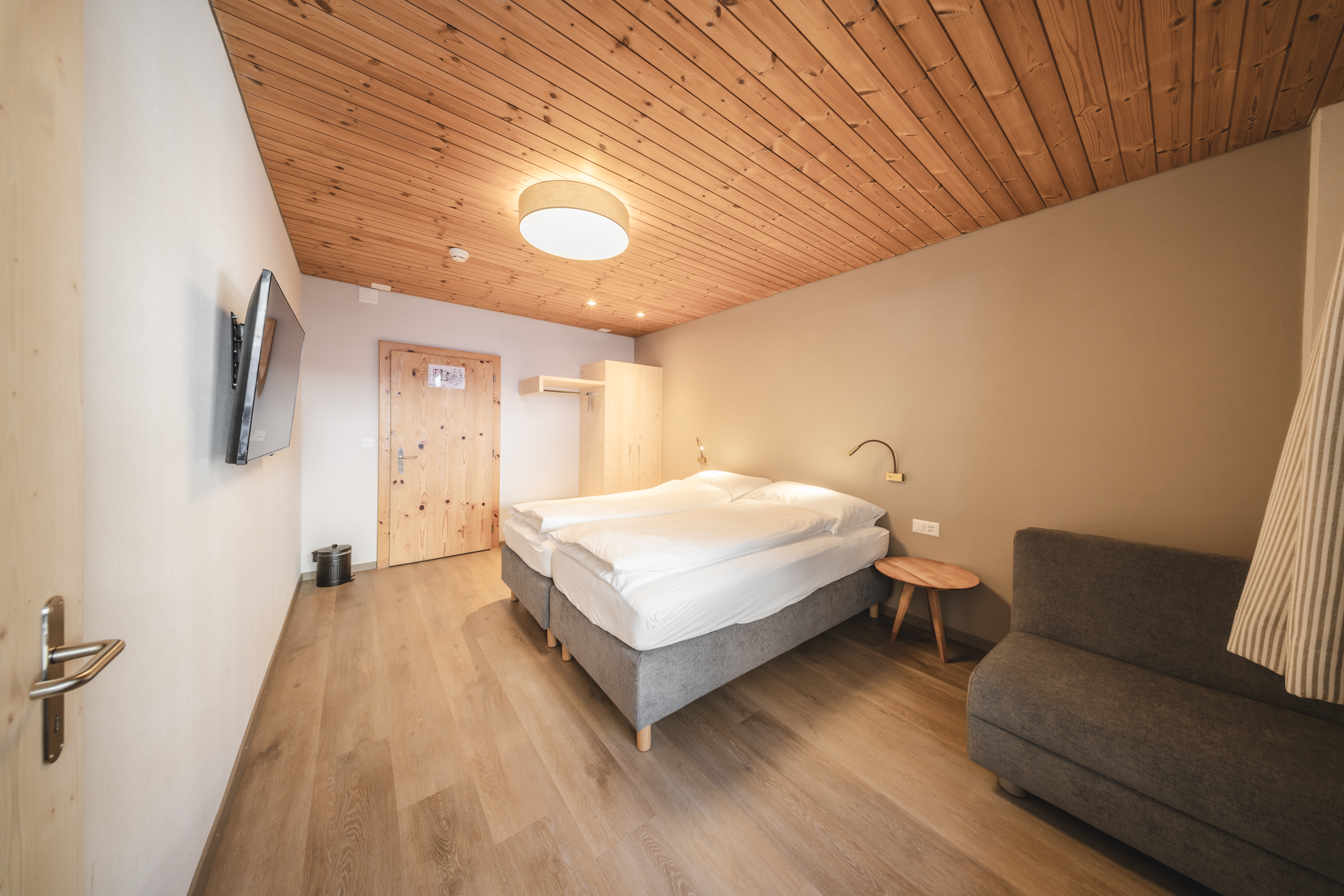 Alle Zimmer haben neue Boxspringbetten und das private Bad ist mit einer Dusche ausgestattet. Die Holzvertäfelung an den Decken verleiht den Zimmern eine warme, gemütliche Atmosphäre.
