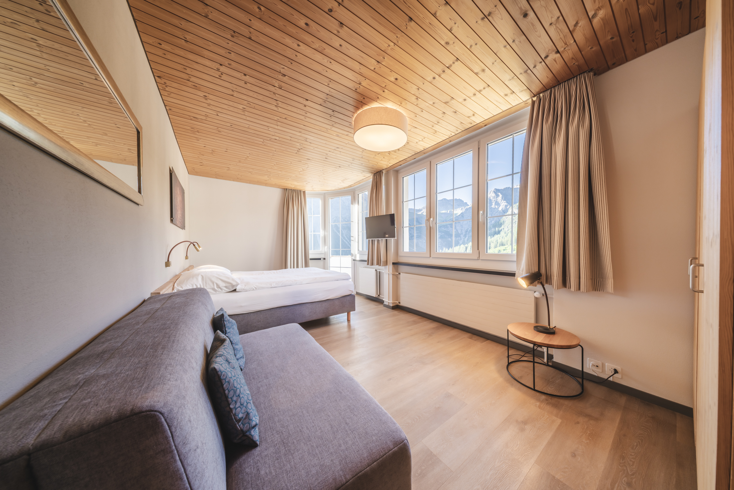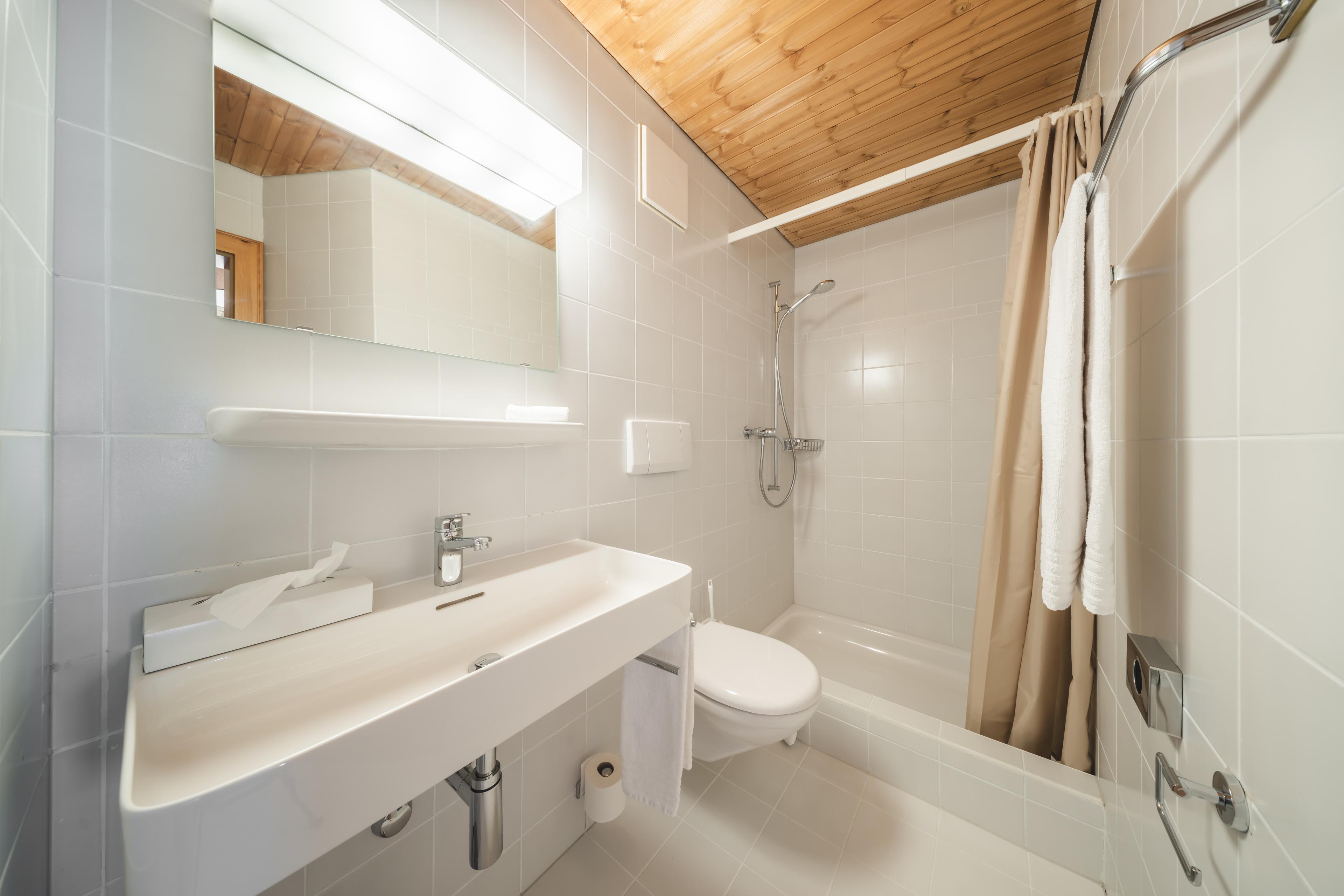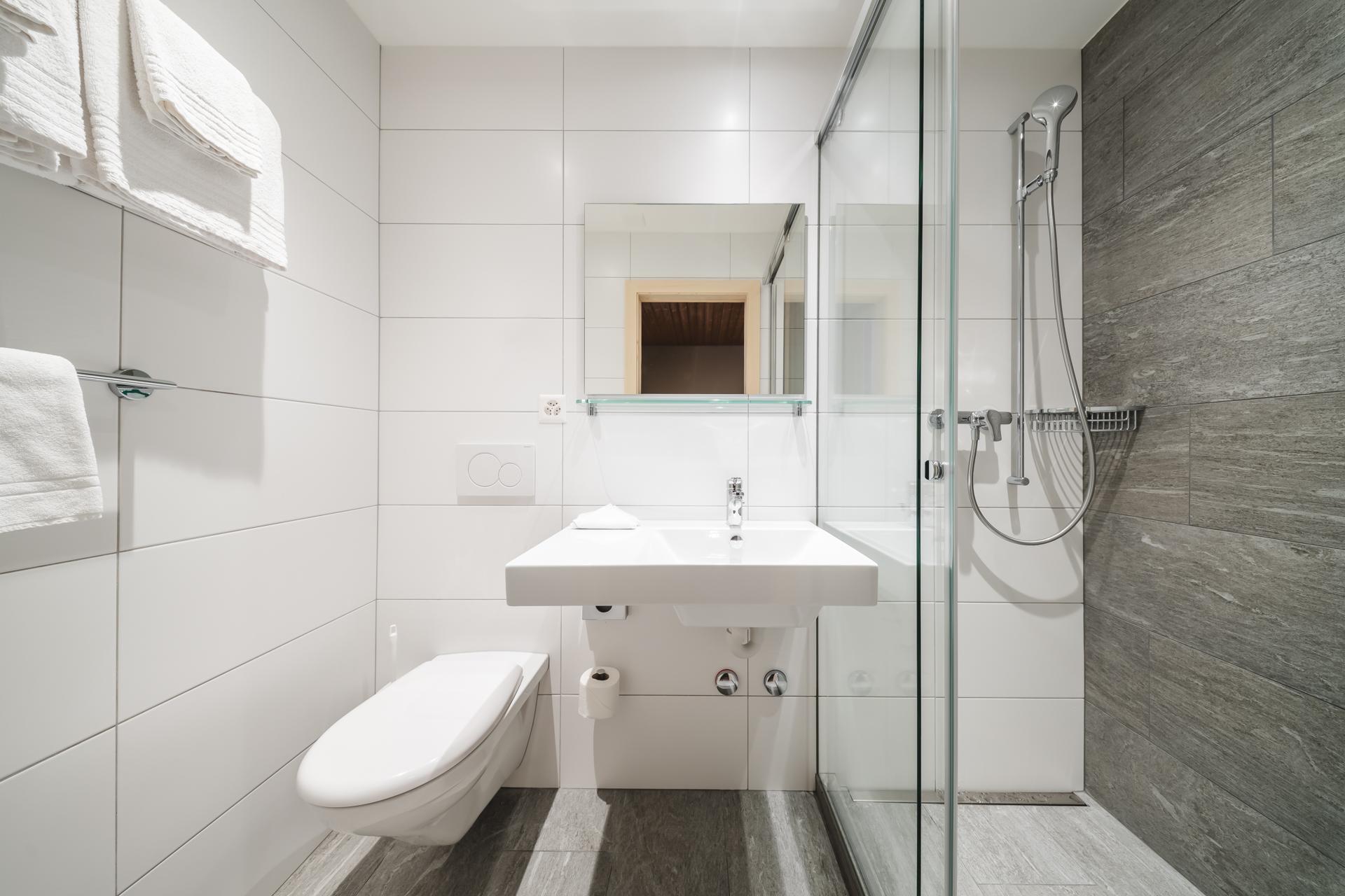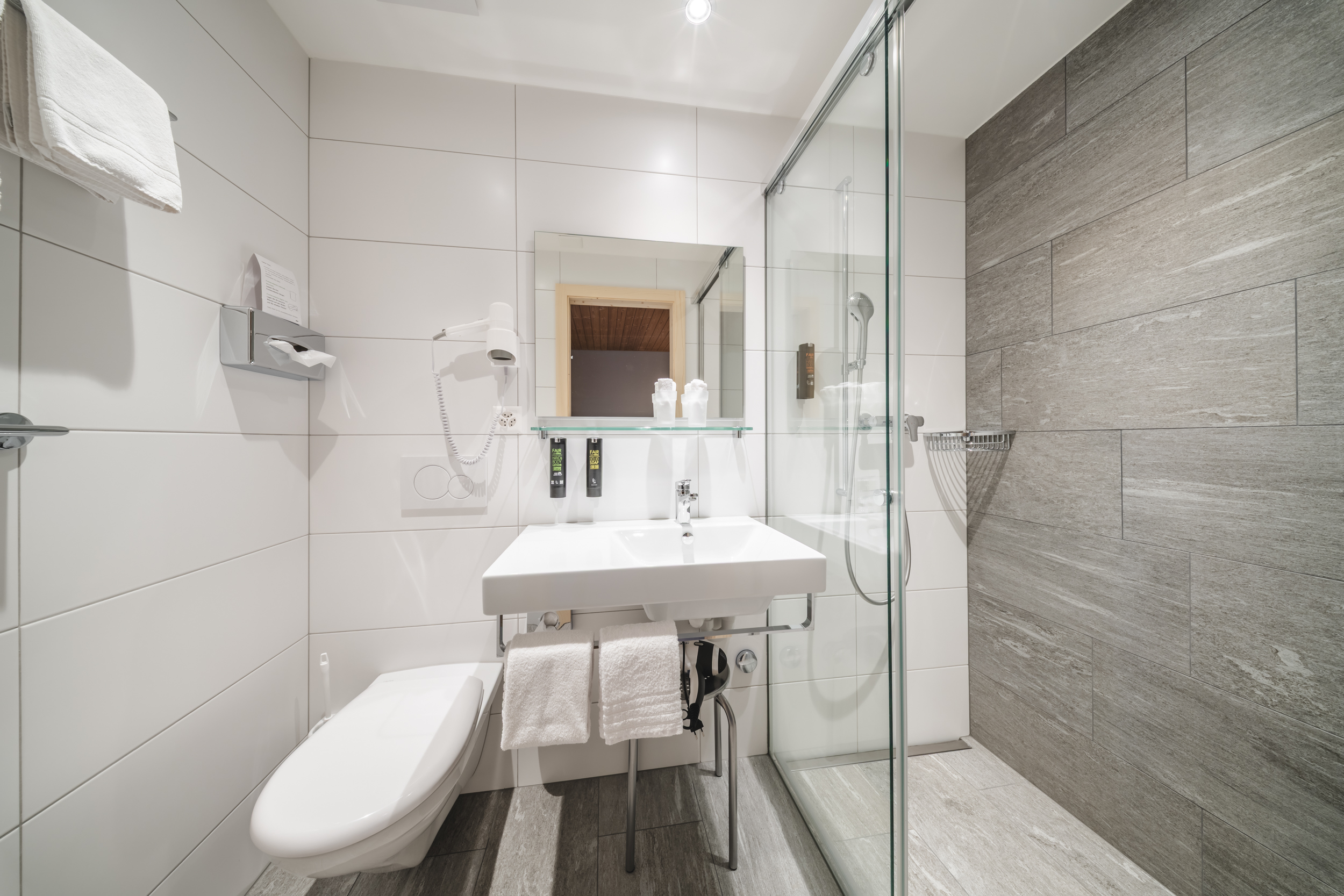Alle Zimmer haben neue Boxspringbetten und das private Bad ist mit einer Dusche ausgestattet. Die Holzvertäfelung an den Decken verleiht den Zimmern eine warme, gemütliche Atmosphäre.