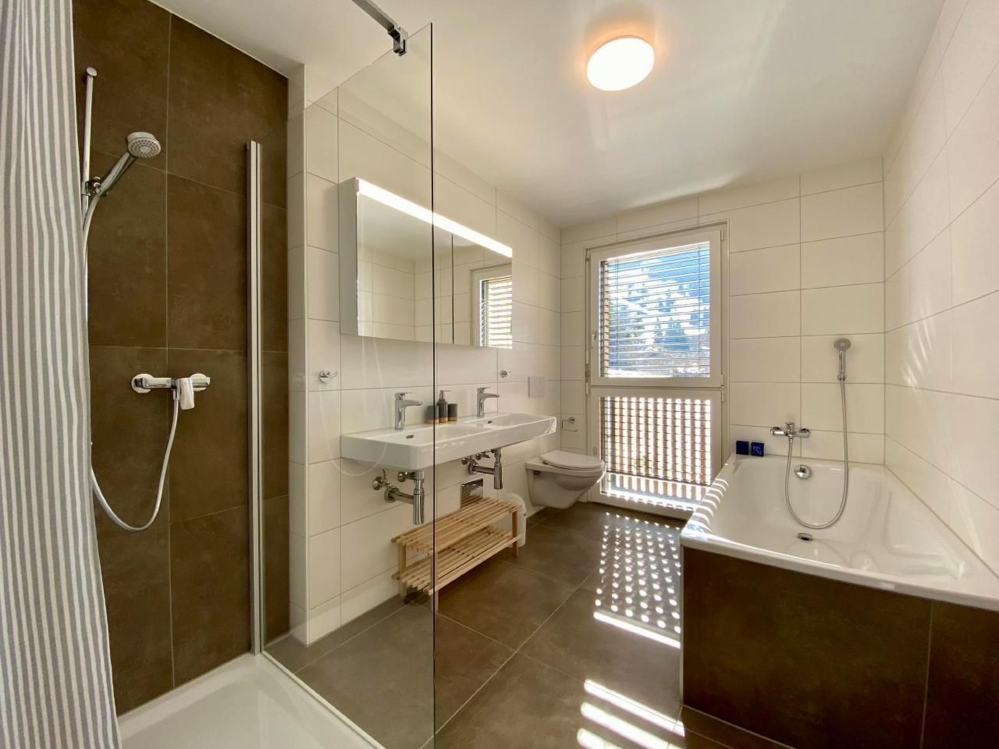 Die Wohnung hat 2 Badezimmer, je mit Dusche/WC und Haarföhn. Das grössere Badezimmer mit Doppellavabo, Dusche und Badewanne.