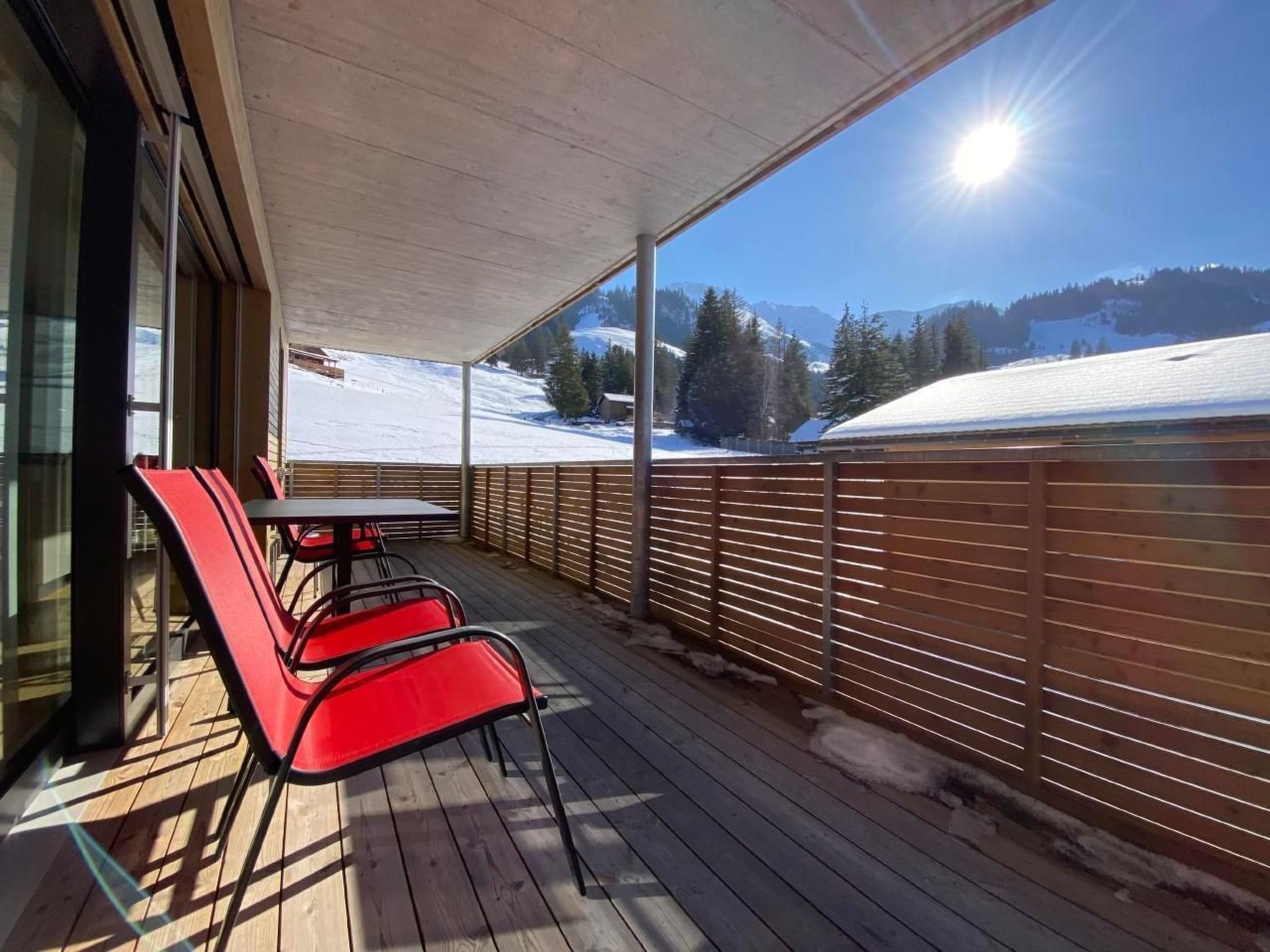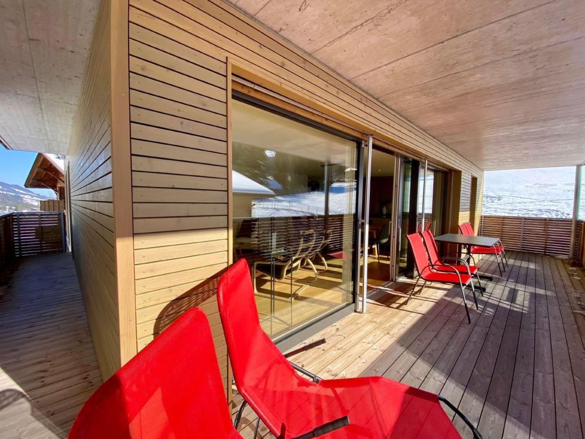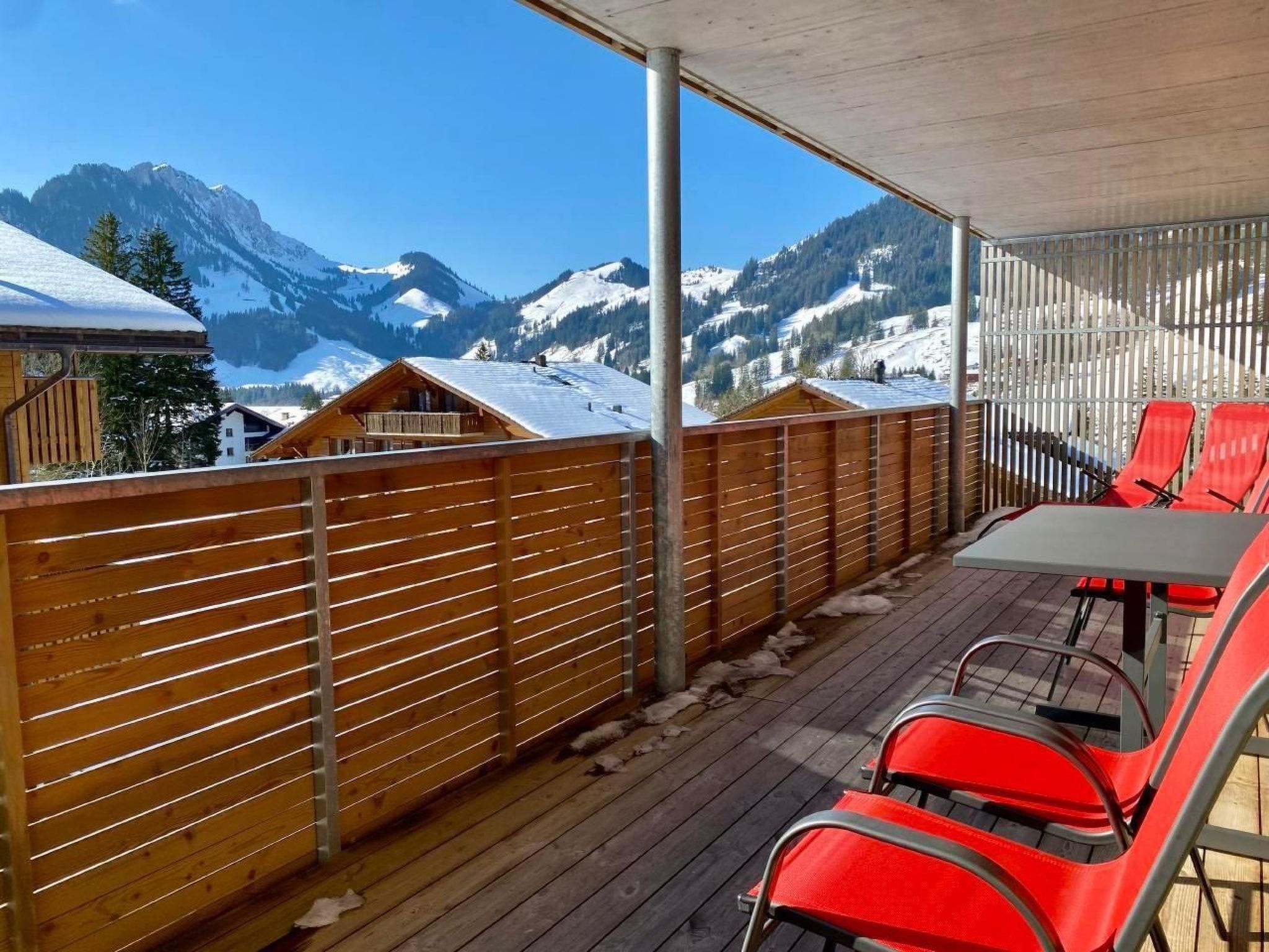 Der grosse Balkon mit Blick auf die Berge bietet Liegestühle, Stühle und einen Tisch.