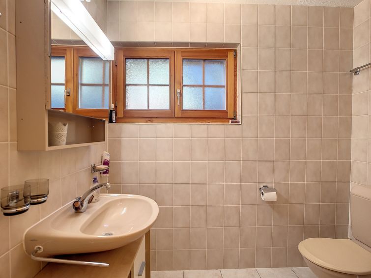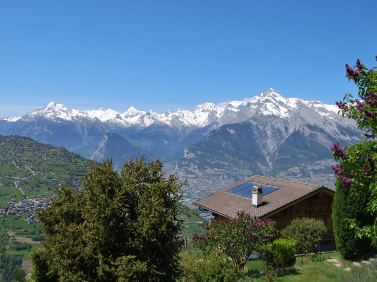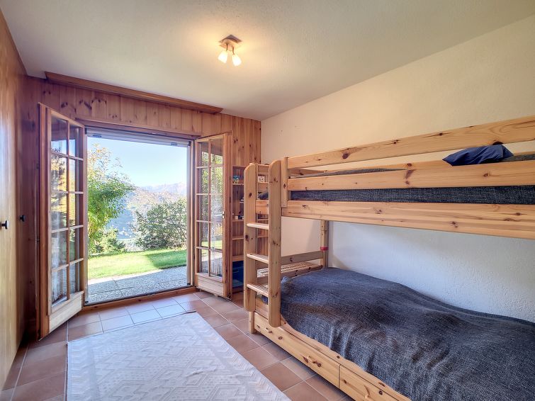 "Les 4 Saisons", 4-Zimmer-Chalet 180 m2 auf 3 Stockwerken, Südostlage. Geräumig, komfortabel und mit viel Holz eingerichtet: grosses Wohn-/Esszimmer mit Schwedenofen und Kabel-TV. Ausgang zum Balkon, zur Terrasse, Richtung Süden und Richtung Westen. Grosse, offene Küche (Backofen, Geschirrspüler, 4 Glaskeramikplatten, elektrische Kaffeemaschine, Racletteofen, Fondue Set (Chinoise, Käse)). Bad/WC. Ölheizung. Unteres Geschoss: 1 Zimmer mit 1 Doppelbett (2 x 90 cm, Länge 190 cm). Ausgang zum Garten. 1 Zimmer mit 1 franz. Bett (140 cm, Länge 190 cm). Ausgang zum Garten. 1 Zimmer mit 1 x 2 Etagenbetten (90 cm, Länge 190 cm). Ausgang zum Garten. Dusche/WC. Obergeschoss: abgeschrägte, offene Galerie mit 1 franz. Bett (140 cm, Länge 190 cm) (2 Pers.). Grosser Balkon, Südlage und Ostlage, Garten, Rasen. Terrassenmöbel, Gartengrill. Panoramasicht auf die Berge und den Wald. Zur Verfügung: Waschmaschine, Haartrockner. Internet (Wireless LAN, gratis). Garage (2 Autos) in 150 m, Höhe 200 cm. Bitte beachten: Nichtraucher-Haus. Anstelle eines abgeschlossenen Schlafzimmers befinden sich manche Schlafplätze in einem offenen Bereich (Galerie, Nische etc.).