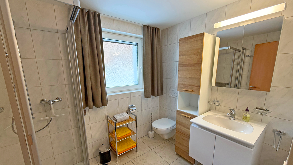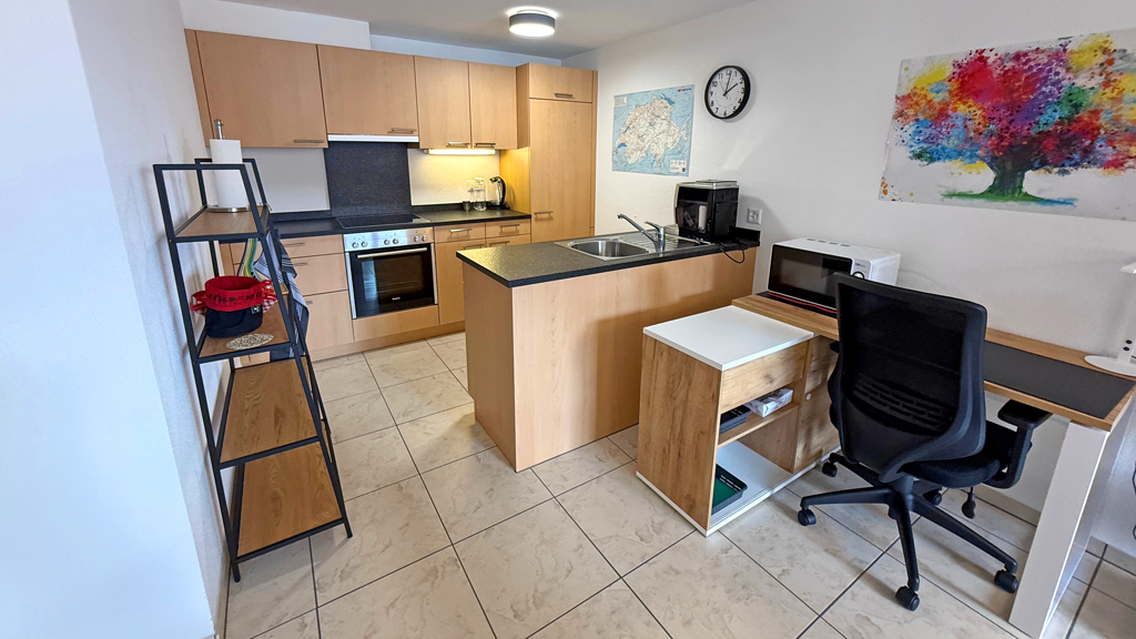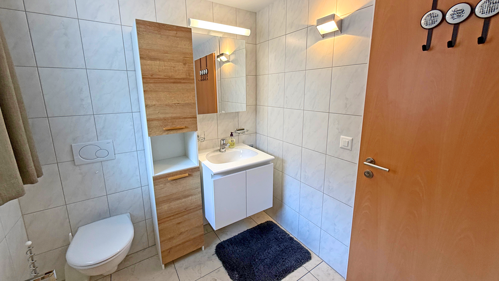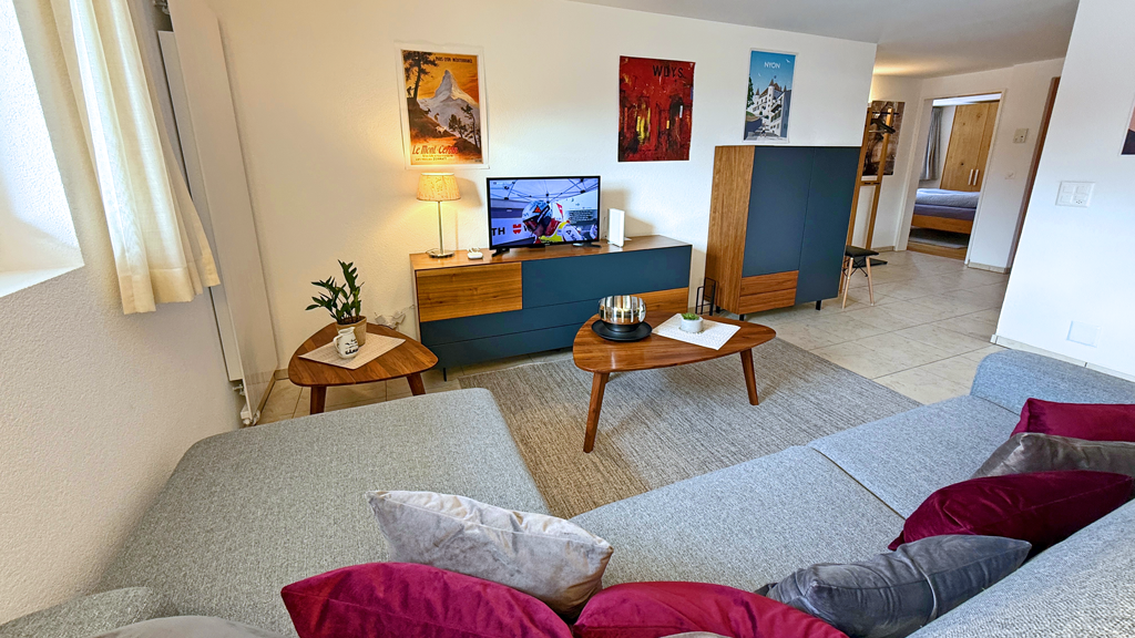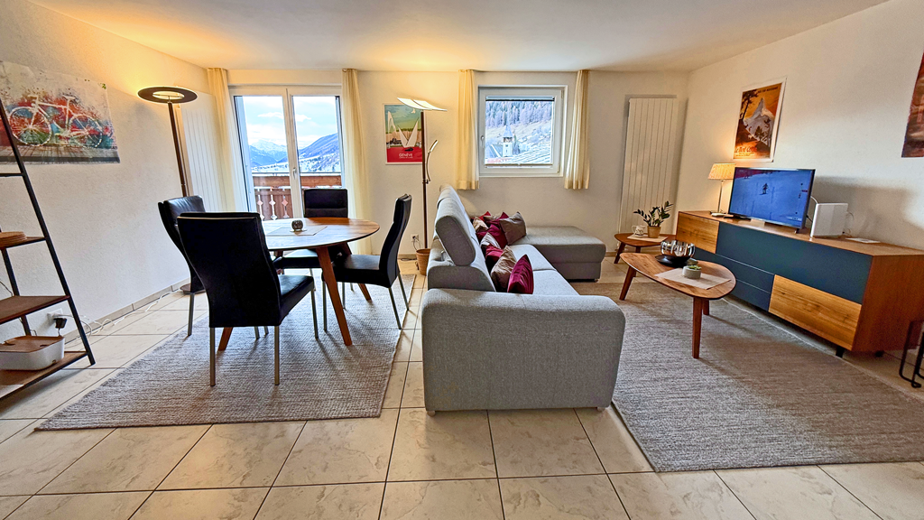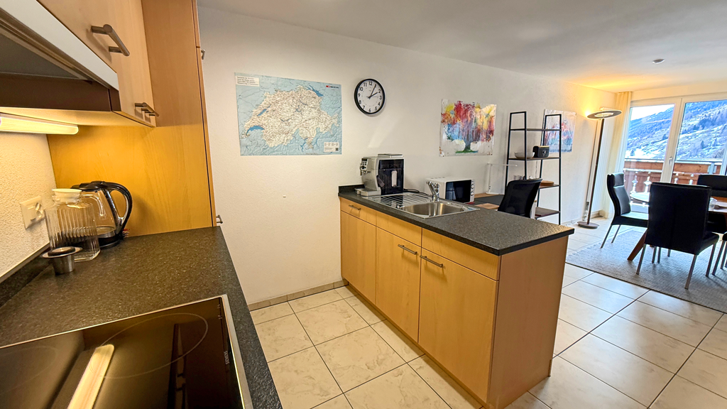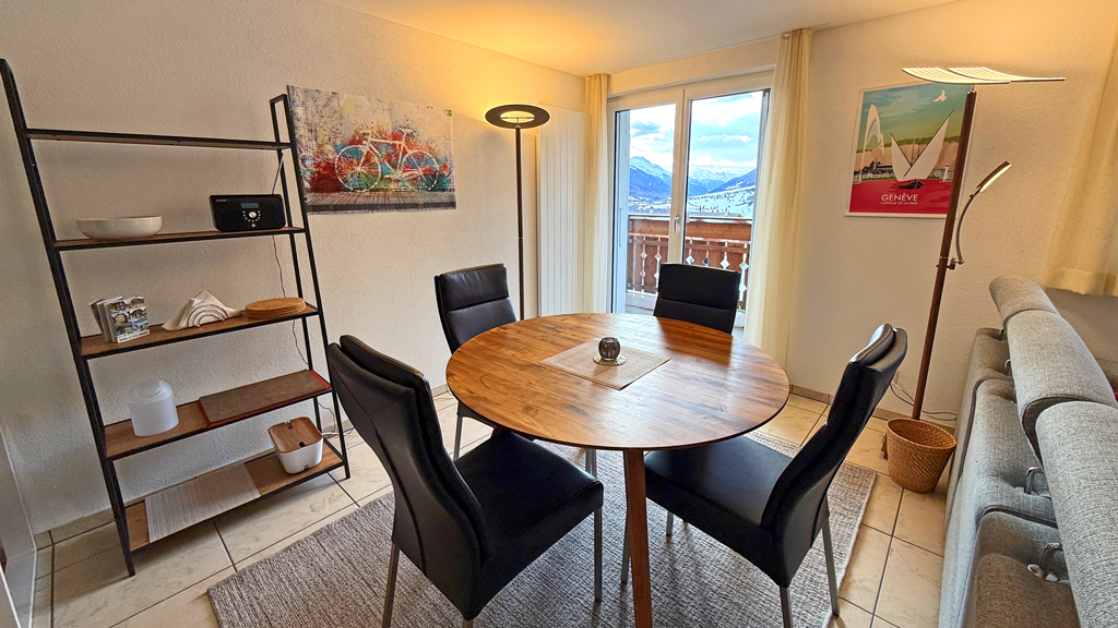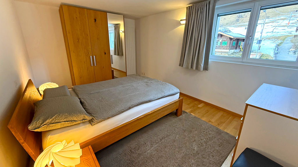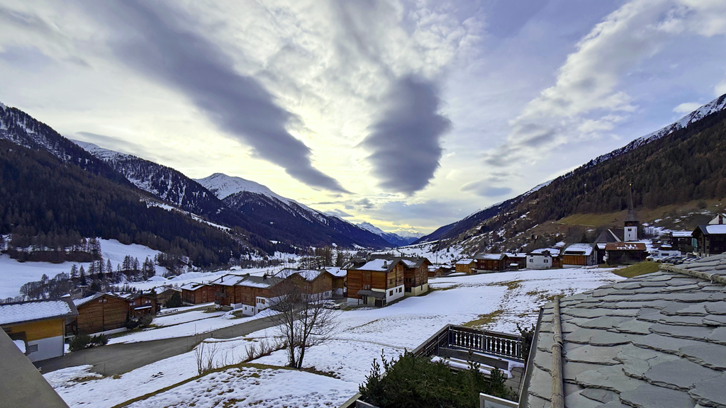 Freie Sicht nach Westen mit Balkon, Skilift, Loipe, Postautostation, Restaurant und Coop zu Fuss in einer Minute erreichbar.