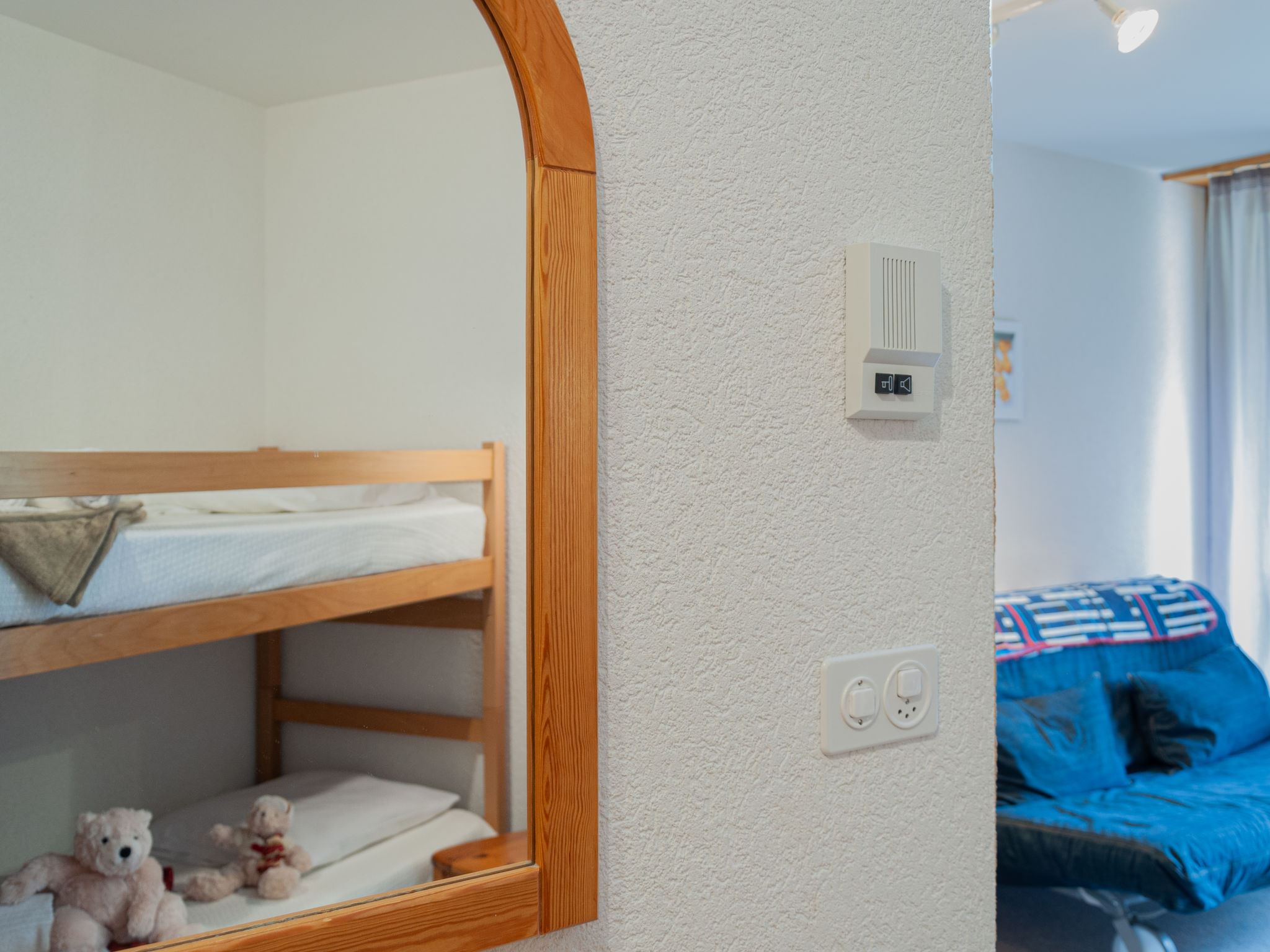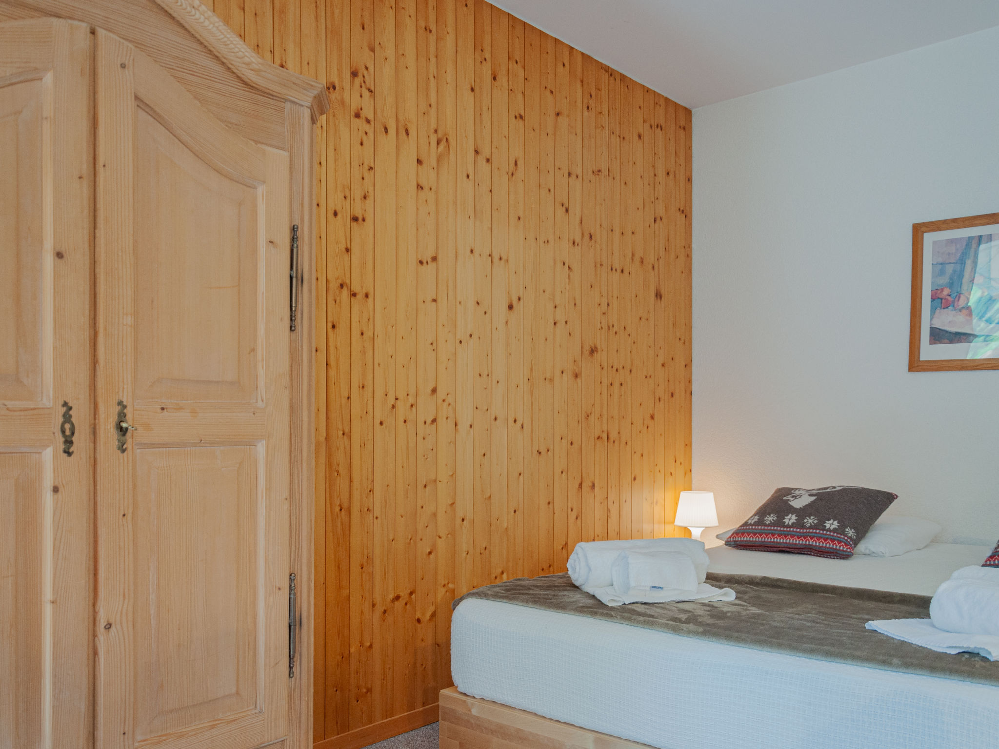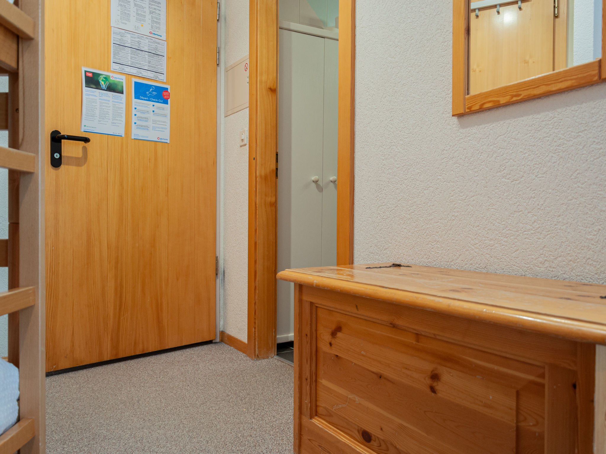 "Mont Fort 43", 1-Zimmer-Wohnung 35 m2 im 4. Stock. Sehr einfach eingerichtet: Wohn-/Esszimmer mit 1 franz. Bett (160 cm, Länge 200 cm), Radio und CD. Eingang mit 1 x 2 Etagenbetten (80 cm, Länge 190 cm). Bad/WC. Balkon, Südostlage. Bitte beachten: Nichtraucher-Haus. Anstelle eines abgeschlossenen Schlafzimmers befinden sich manche Schlafplätze in einem offenen Bereich (Galerie, Nische etc.).
