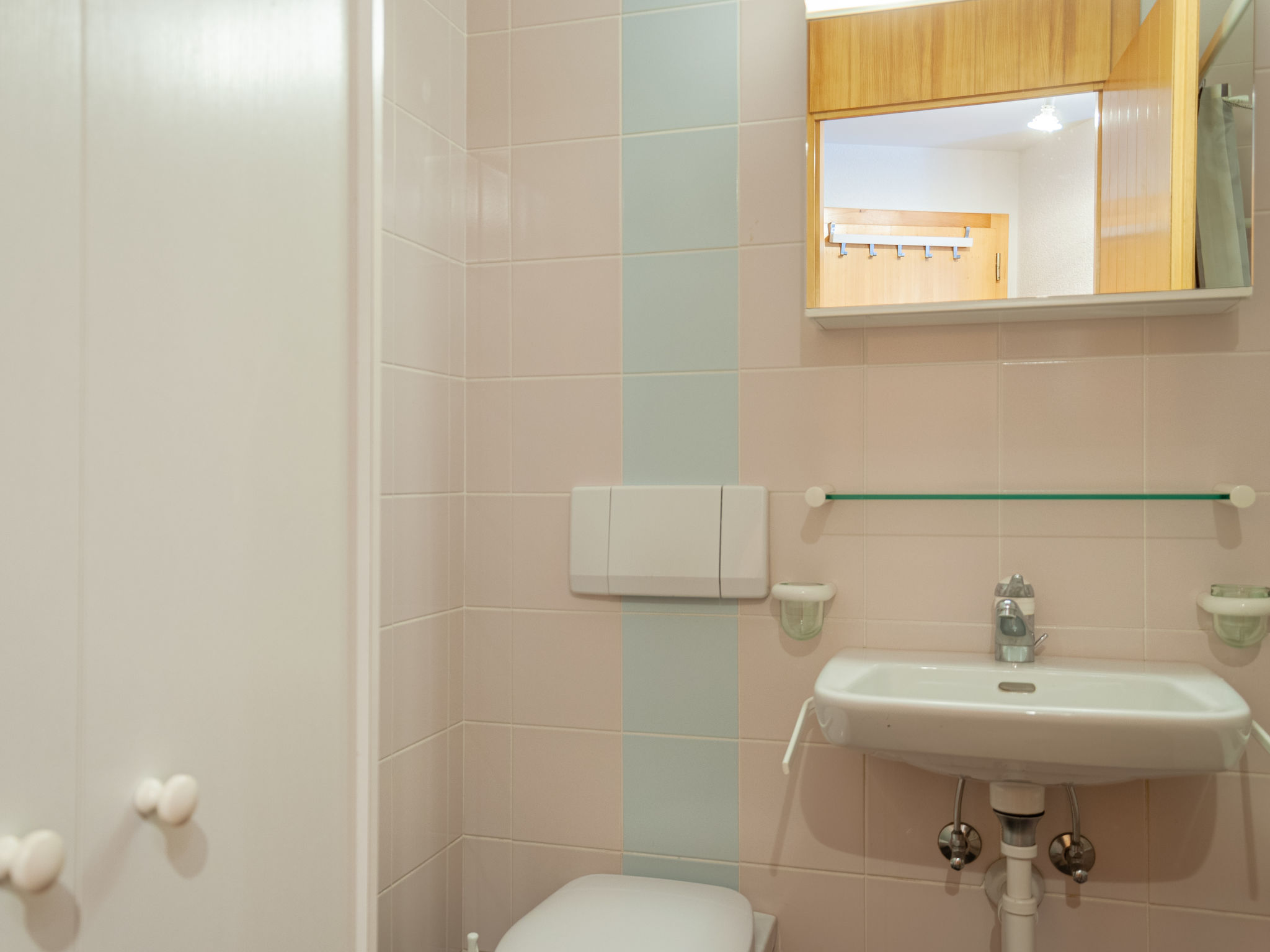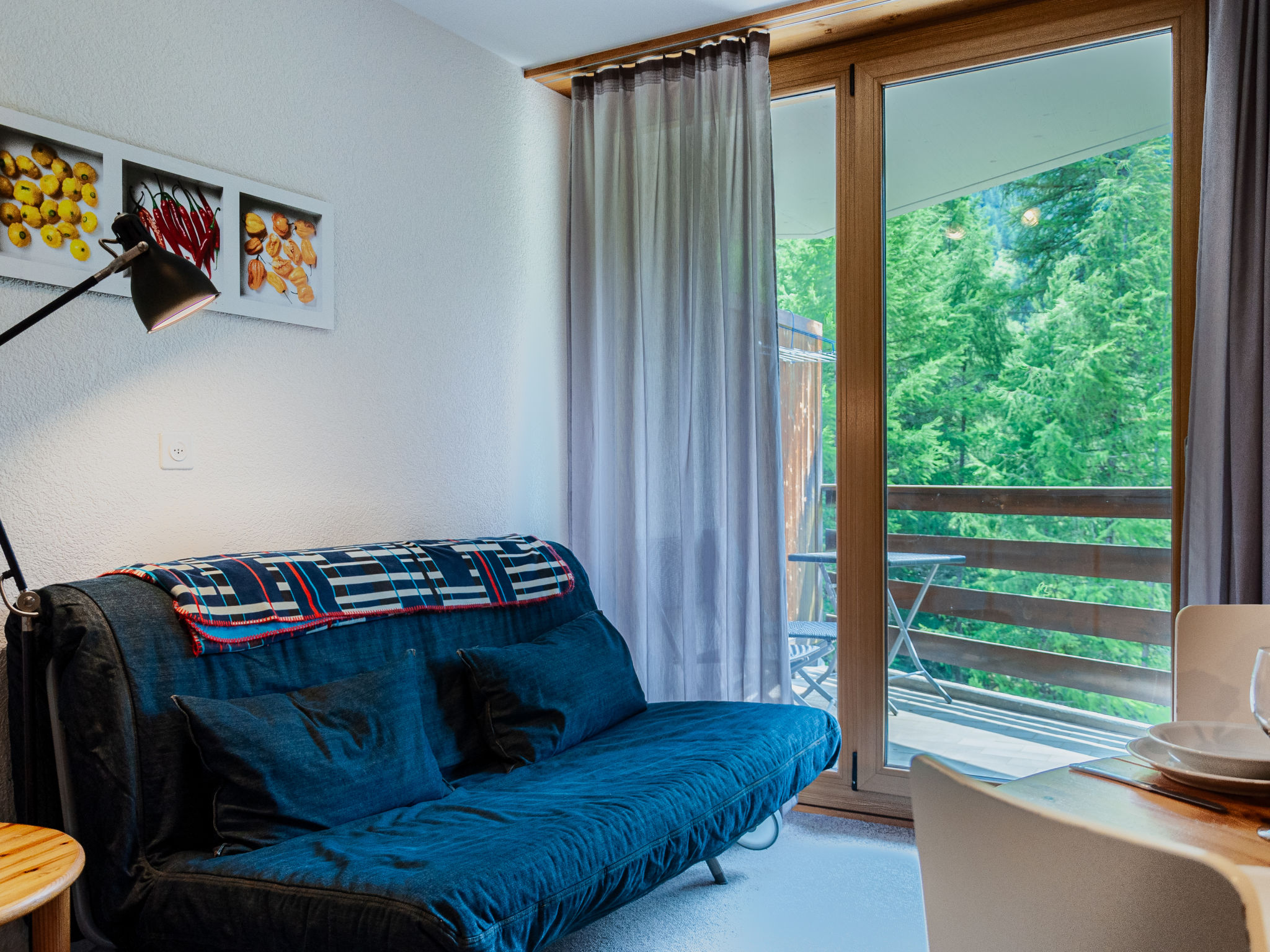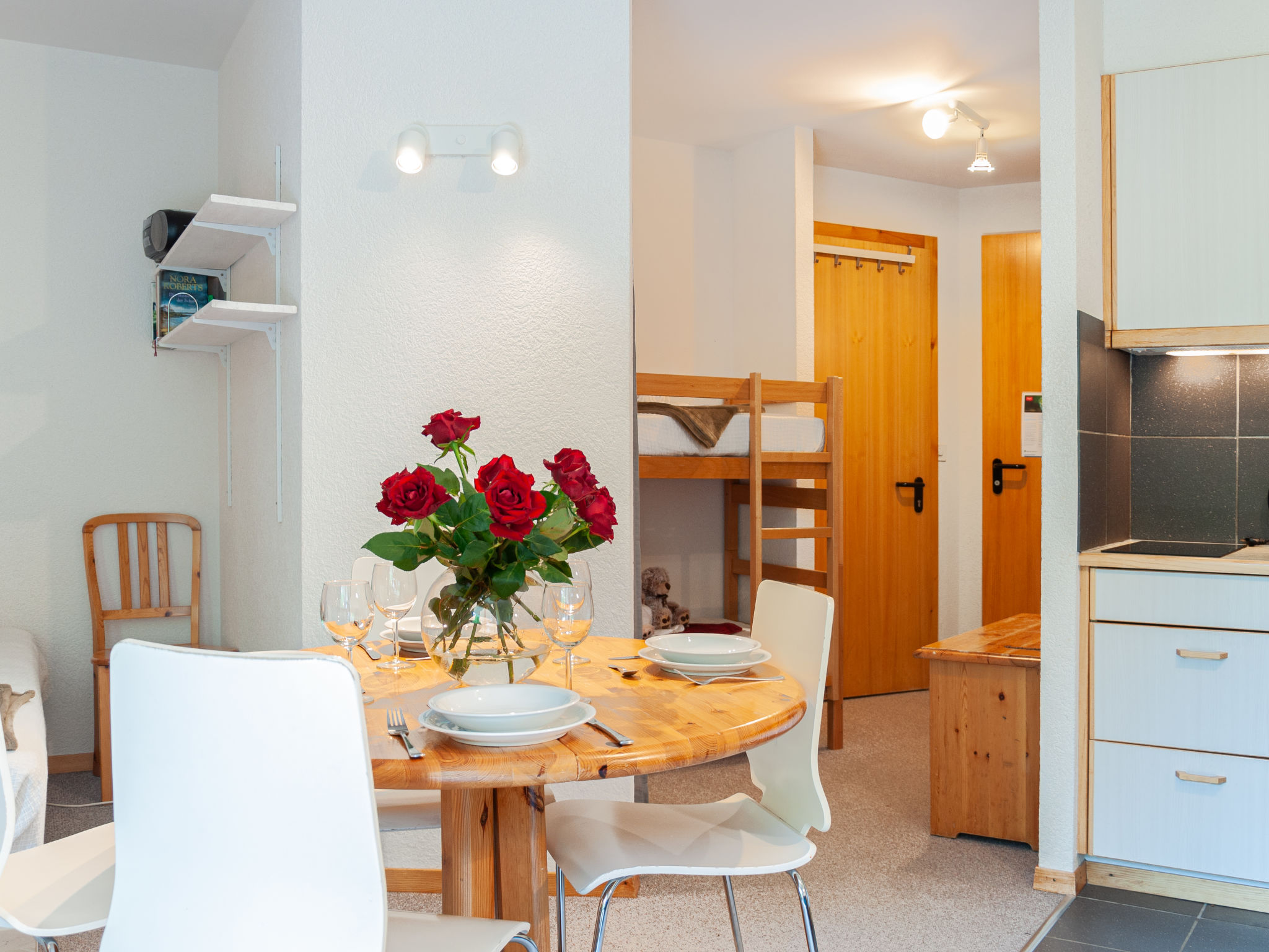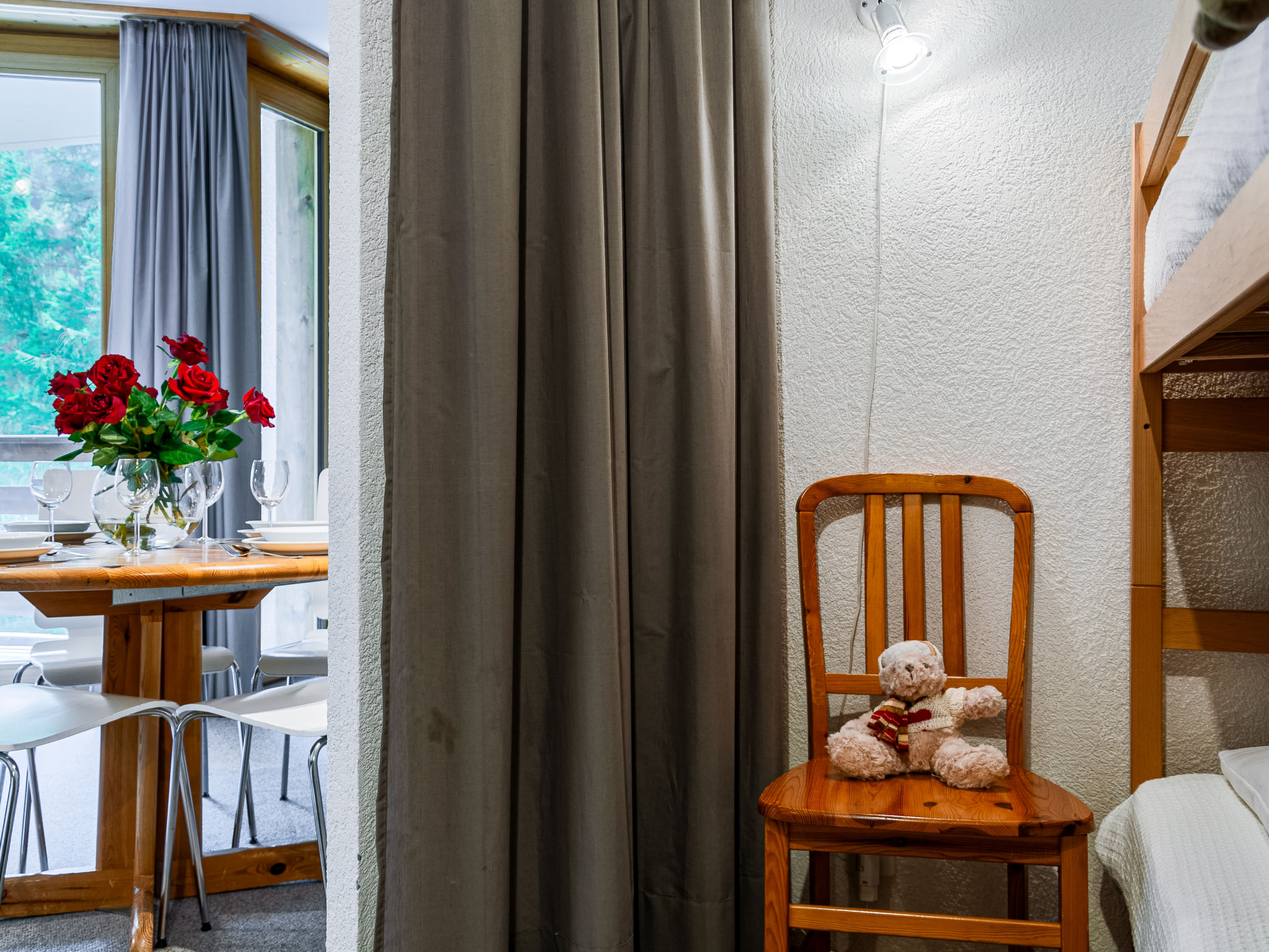 "Mont Fort 43", 1-Zimmer-Wohnung 35 m2 im 4. Stock. Sehr einfach eingerichtet: Wohn-/Esszimmer mit 1 franz. Bett (160 cm, Länge 200 cm), Radio und CD. Eingang mit 1 x 2 Etagenbetten (80 cm, Länge 190 cm). Bad/WC. Balkon, Südostlage. Bitte beachten: Nichtraucher-Haus. Anstelle eines abgeschlossenen Schlafzimmers befinden sich manche Schlafplätze in einem offenen Bereich (Galerie, Nische etc.).