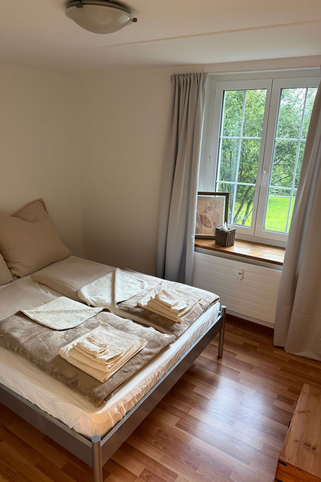 Die Wohnung erstreckt sich auf der einen Seite über den ersten Stock und geht auf der anderen Seite in einen privaten Garten über. Mit drei Schlafzimmern und drei Toiletten bietet die Wohnung viel Platz und Privatsphäre - ideal für Familien und Gruppen, die gemeinsam reisen. Zwei Bäder mit begehbarer Dusche und Badewanne sorgen für Komfort nach einem aktiven Tag. Eine voll ausgestattete Küche mit Induktionskochfeld, Kapselkaffeemaschine und Geschirrspüler macht das Kochen leicht, während eine traditionelle Cheminée im Wohnzimmer einen gemütlichen Treffpunkt schafft.