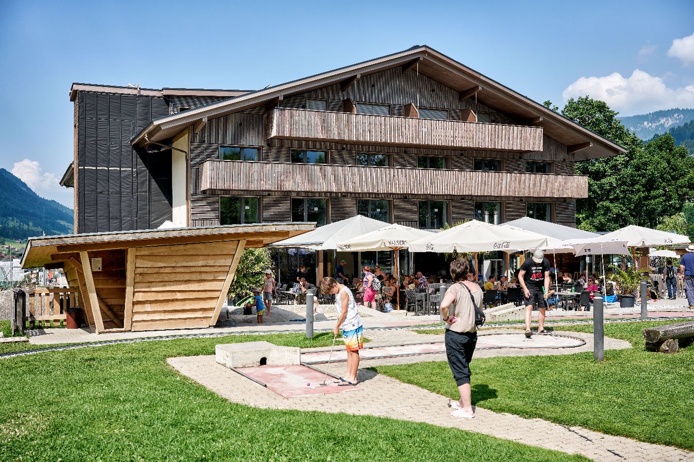 Das Hotel im Frutigresort liegt ungefähr 800 Meter in nördlicher Richtung vom Bahnhof Frutigen (Berner Oberland, Schweiz) entfernt und ist speziell eingerichtet für Familien.