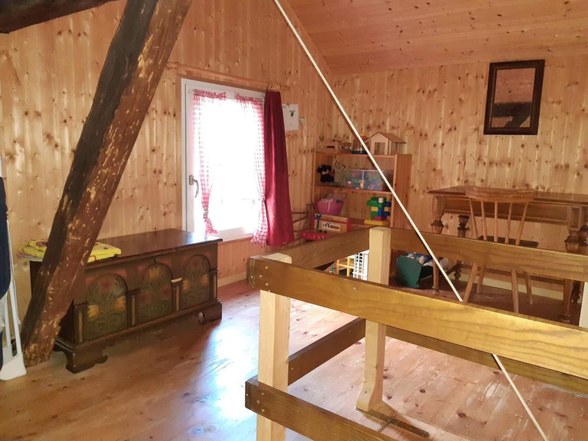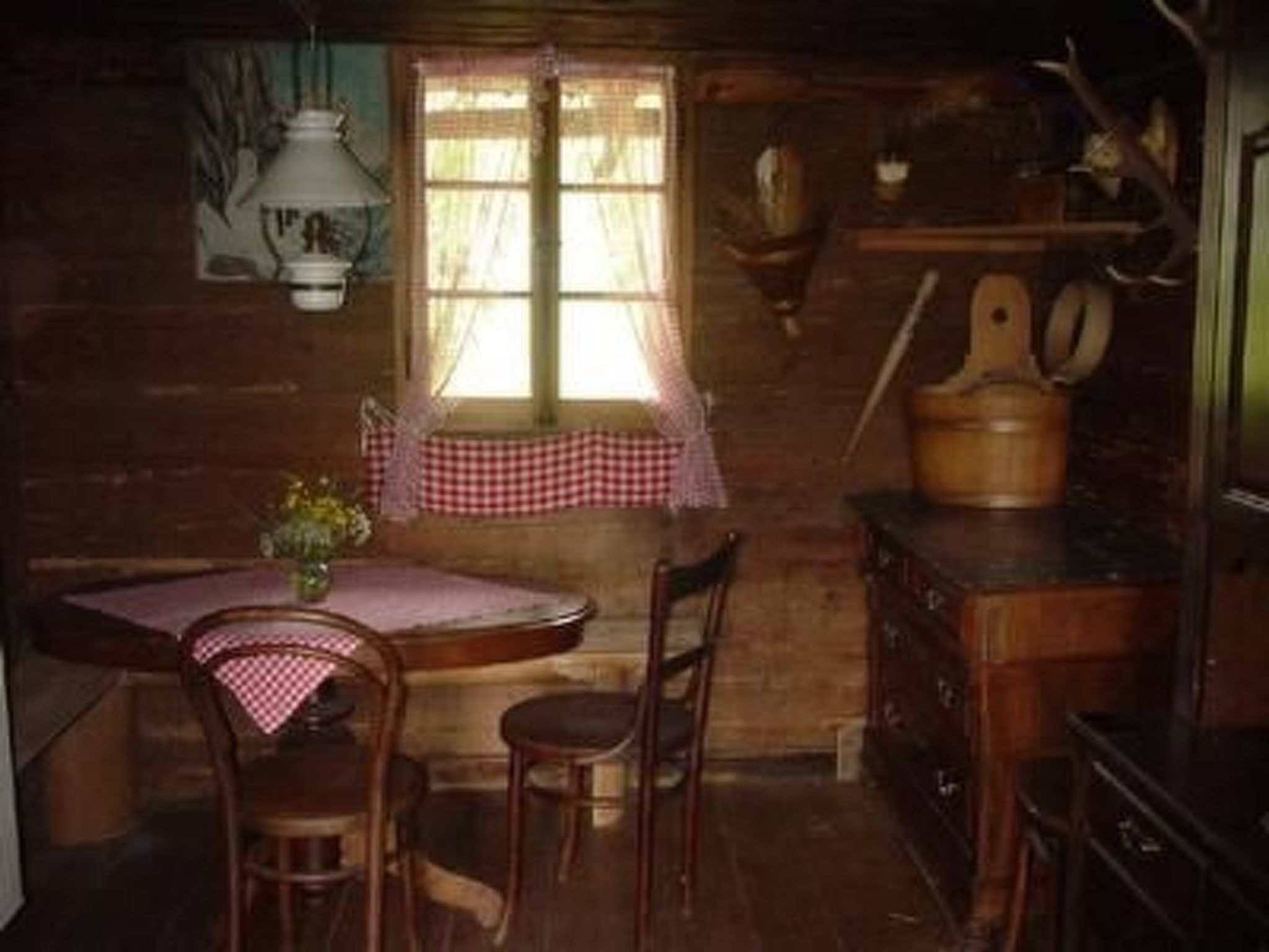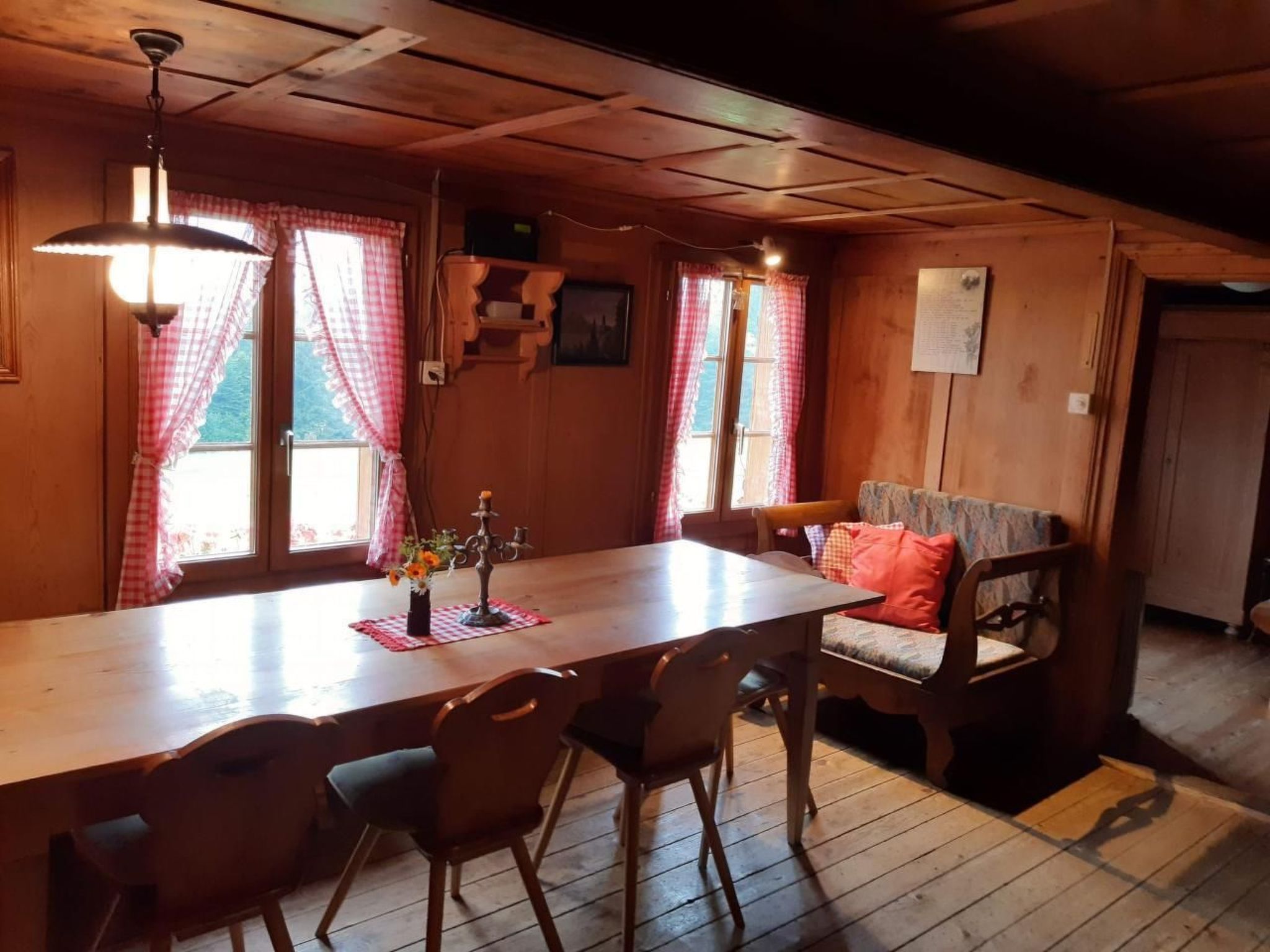 Sonstige Wohnzimmerausstattung (Wohnzimmer1): Wohnzimmer dient gleichzeitig auch als Esszimmer, ausgestattet ist es mit einem grossen Tisch, einem kleinen Sofasessel, Büffet und Kachelofen mit Ofenbank. Gesellschaftsspiele, Bücher und Zeitschriften sind vorhanden.