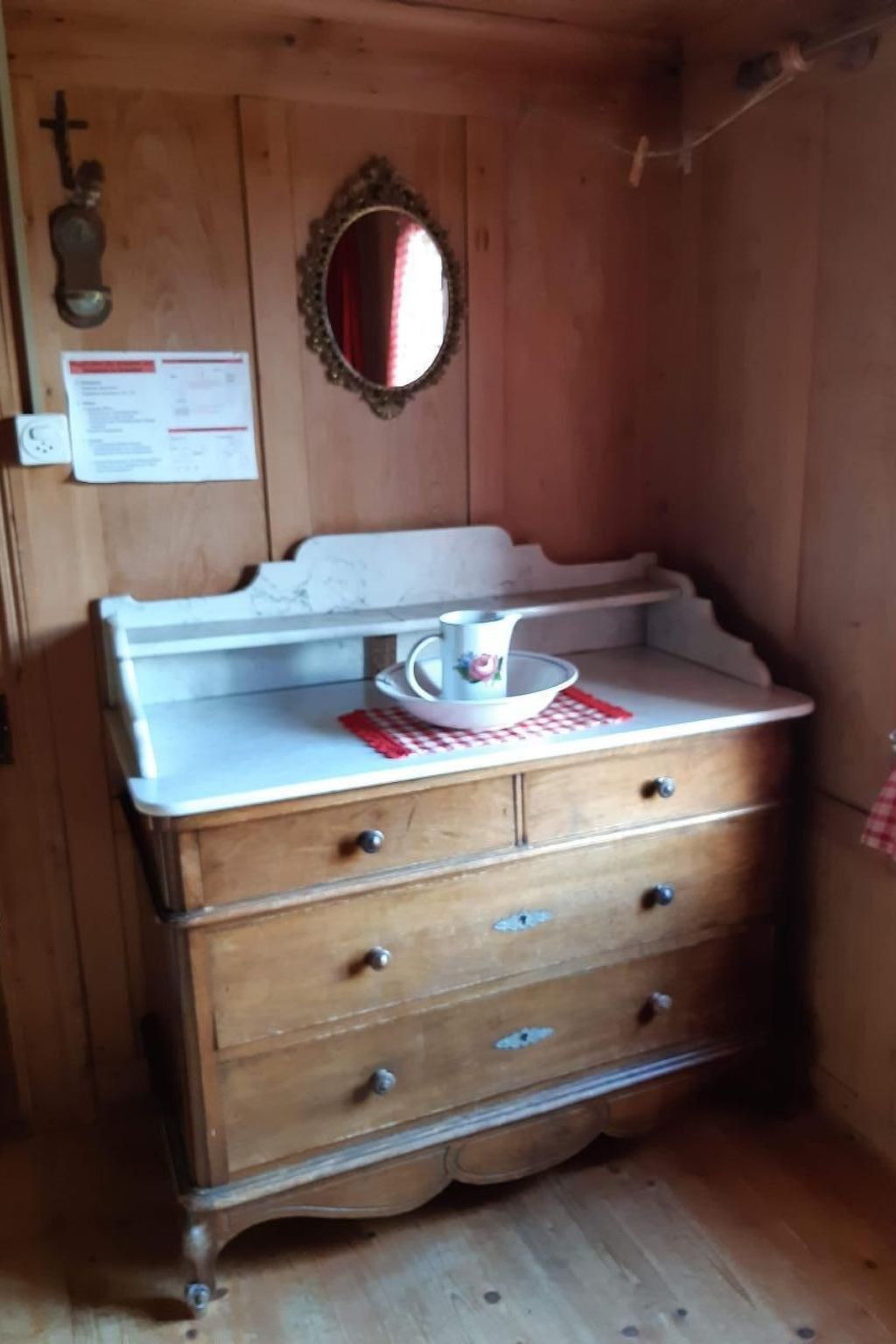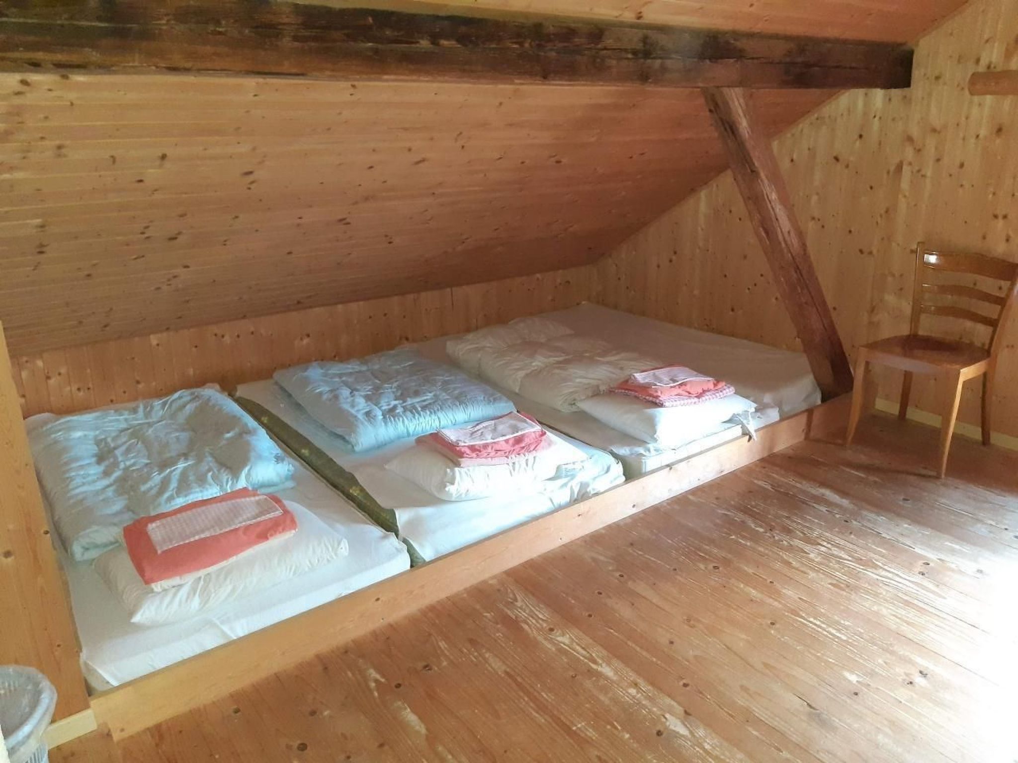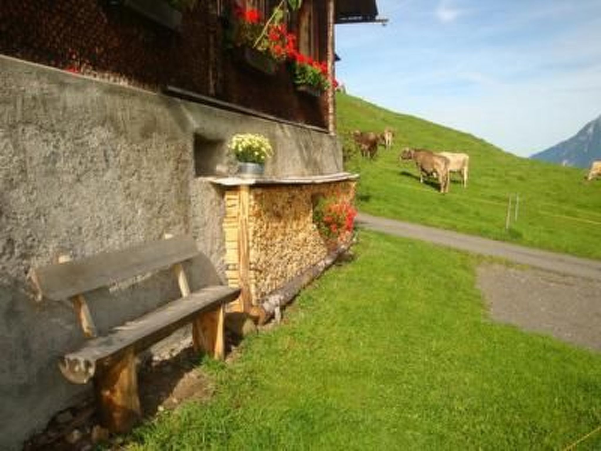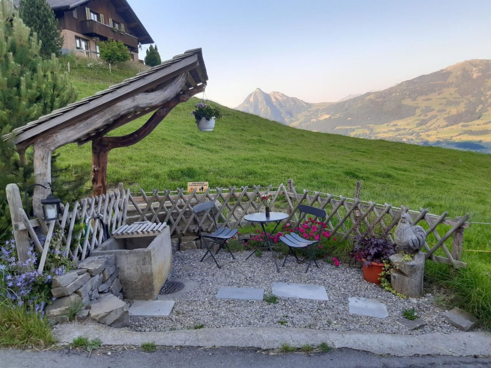 In der urtümlichen, traditionell gestalteten Hütte gibt es weder sanitäre Anlagen (Dusche, WC etc.) noch fliessend Wasser. Die ländliche Atmosphäre zeigt sich anhand des Brunnentroges vor dem Haus und dem "Plumpsklo". Für den nötigen Komfort kann das Badezimmer im Bauernhaus nebenan (ca. 30m) benützt werden.
