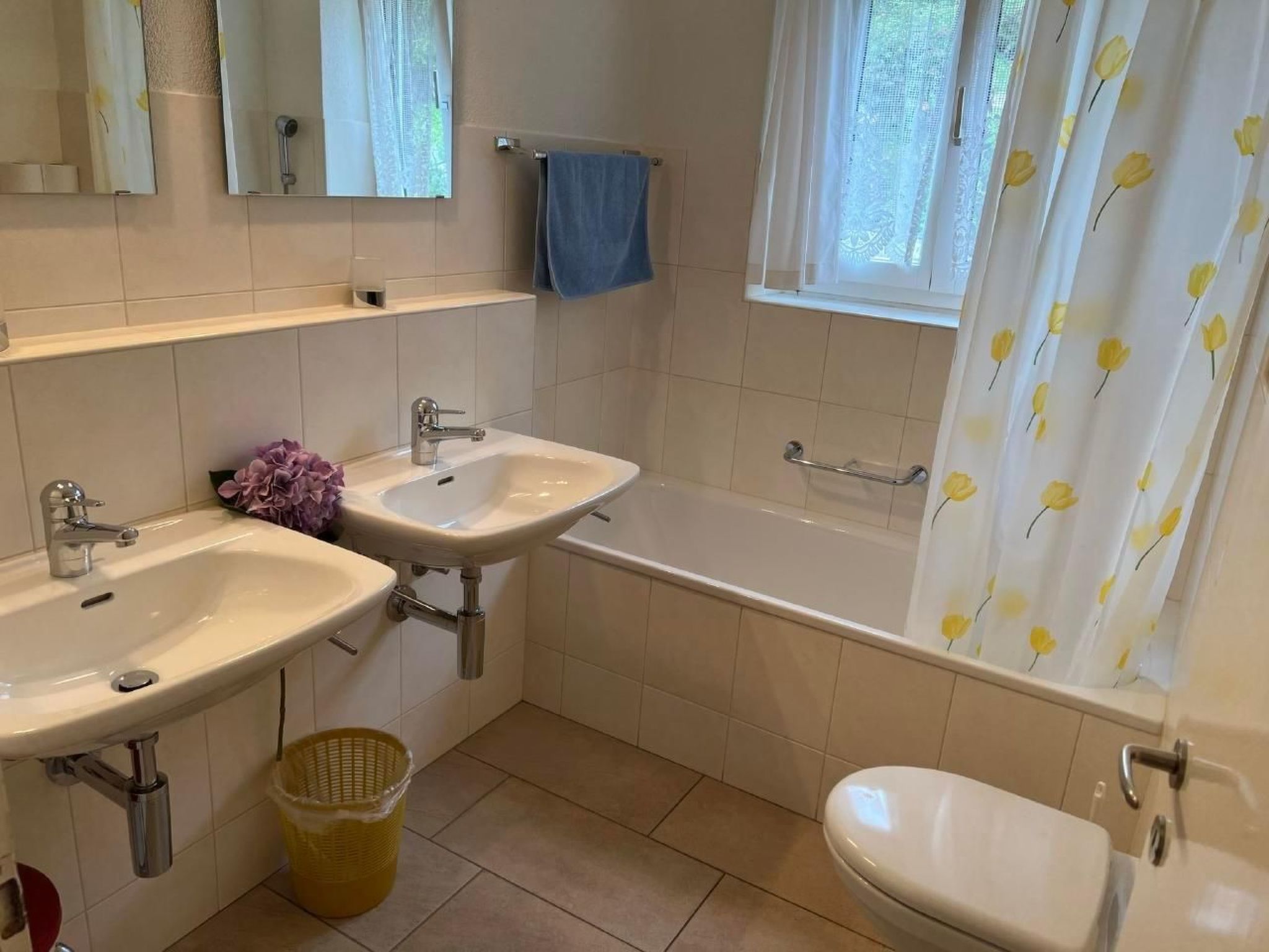 Es hat ein Badezimmer mit WC, 2 Lavabo sowie eine Badewanne, ein kleines Badezimmer mit WC und Lavabo. Und ein Badezimmer mit einer Dusche und Lavabo. Ein kleiner Haarfön steht in der Wohnung zur Verfügung.