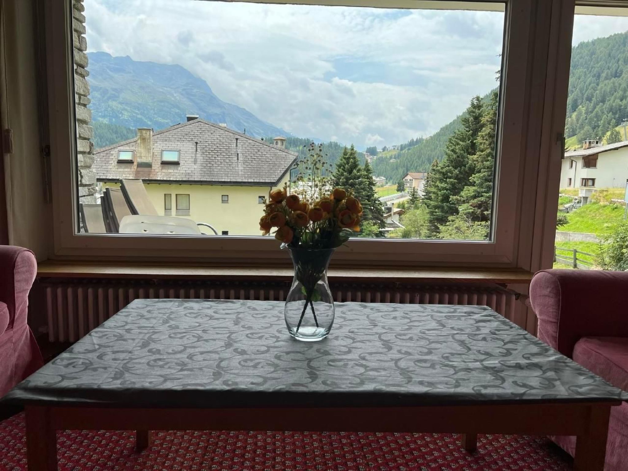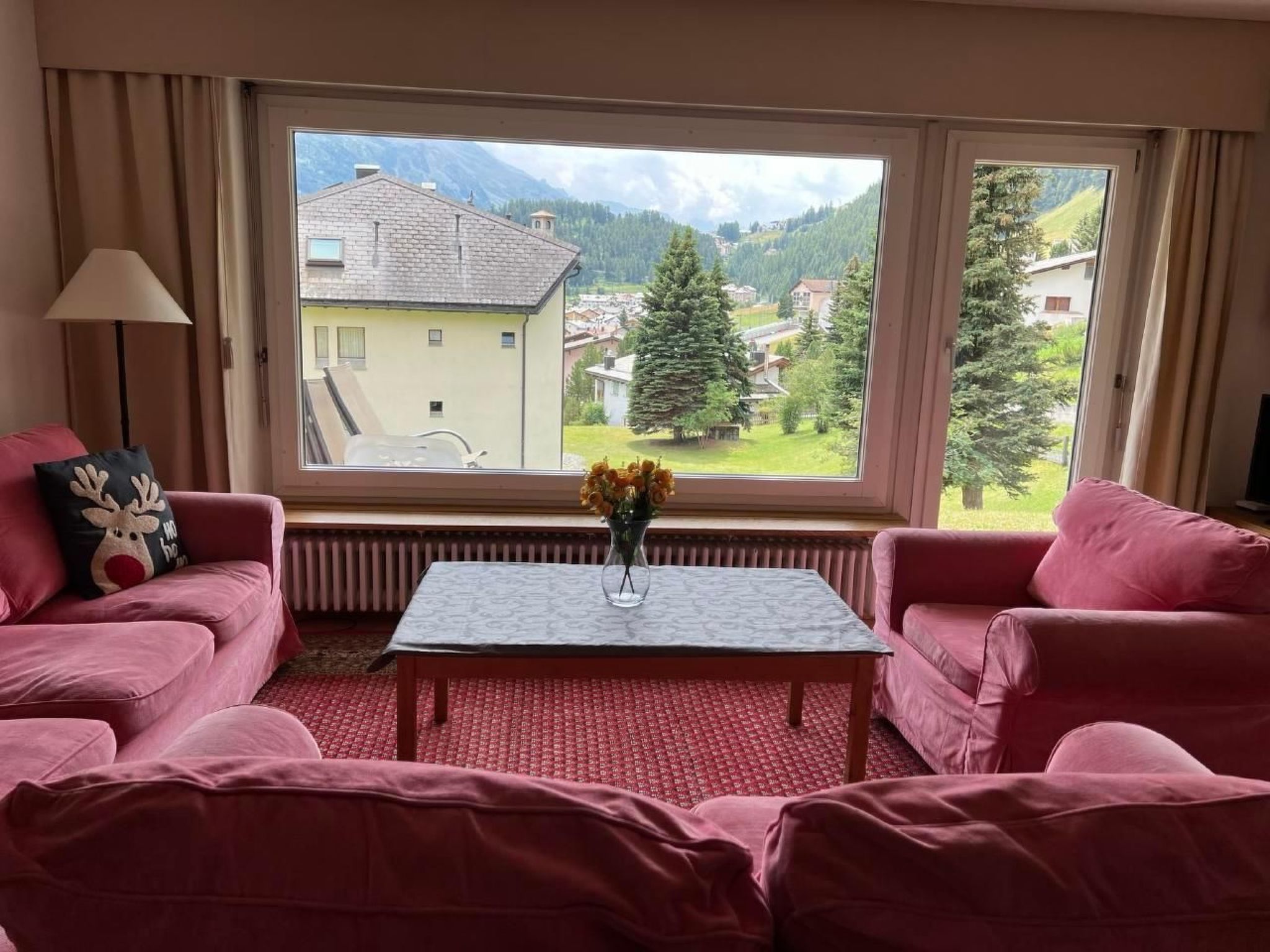 Das Wohnzimmer verfügt über direkter Zugang zum aussen Sitzplatz mit schöner Aussicht richtung Celerina.