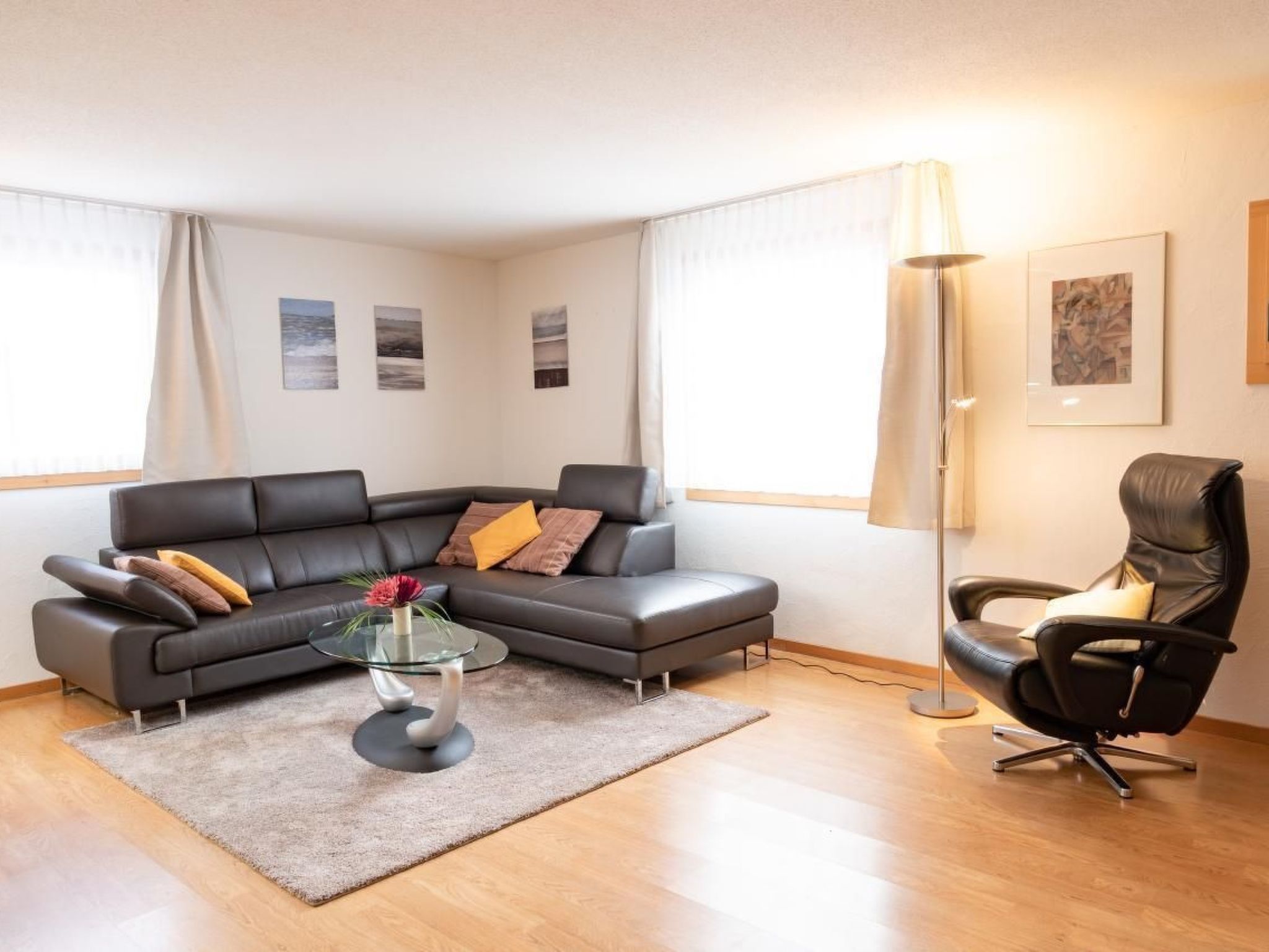 Helle, grosszügige 2.5-Zimmer-Wohnung im 1. Stock. Sehr ruhig gelegen. Das gemütliche Wohnzimmer besteht aus einer Postergruppe mit genügend Sitzplätzen und 2 integrierten Klappbetten. Die Wohnung bietet kostenlos WLAN, TV mit über 300 Sendern.