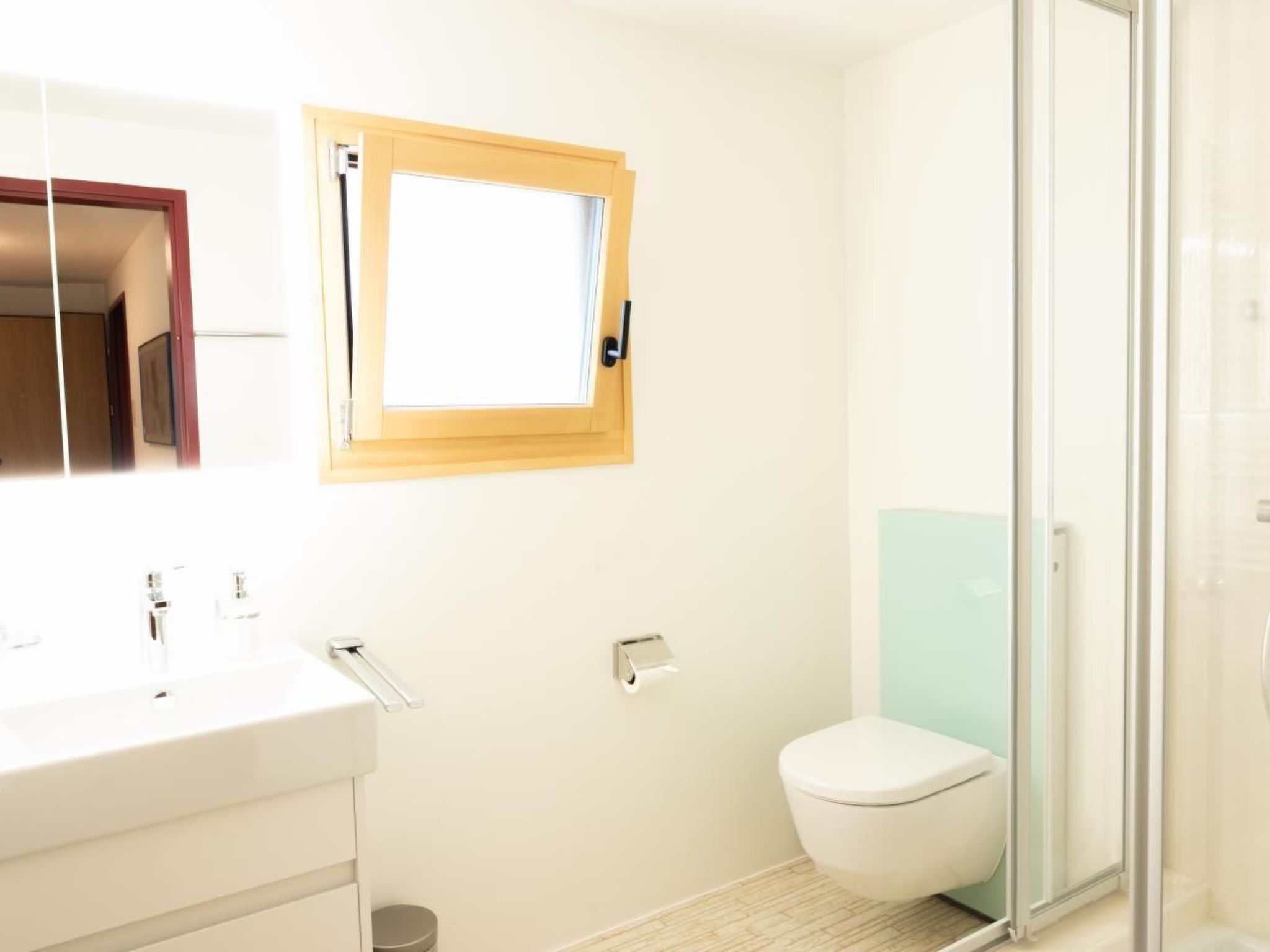Dusche/WC sind komplett neu gestaltet. Im Eingangsbereich ist eine Garderobe mit angrenzendem Putzschrank.