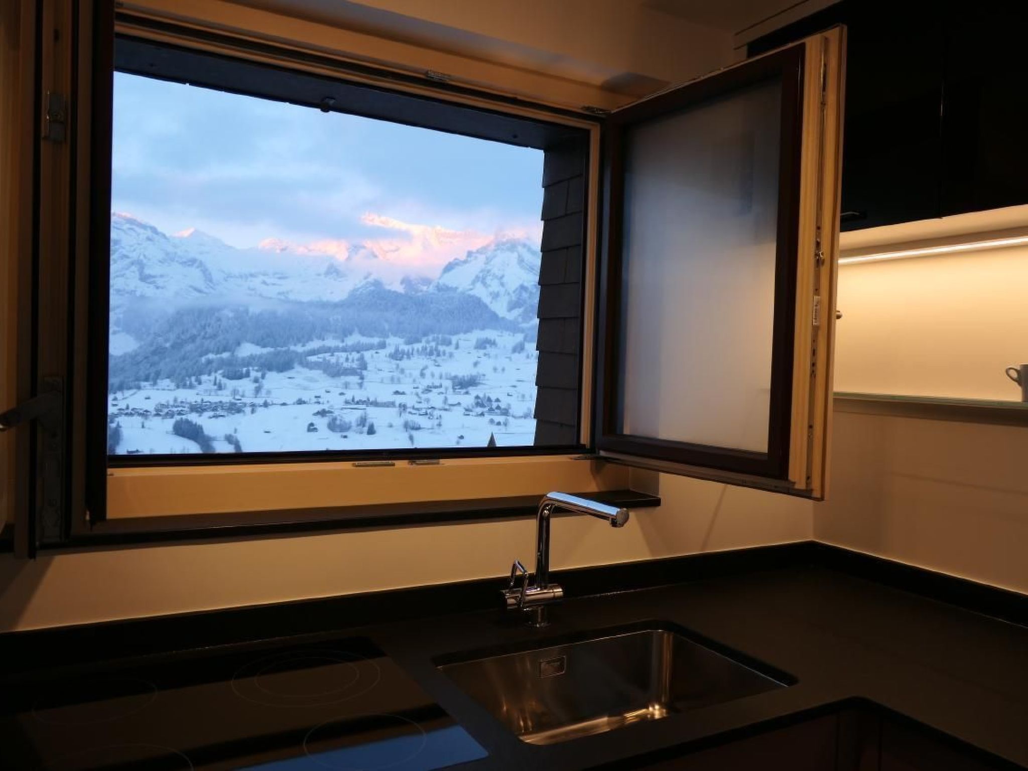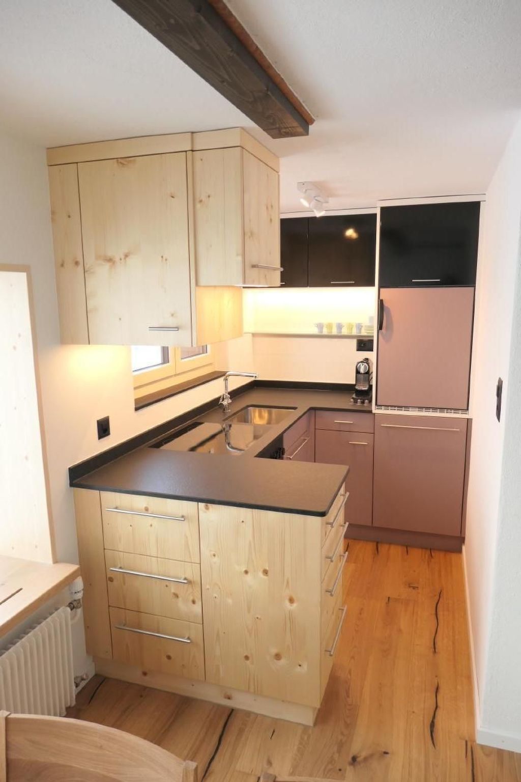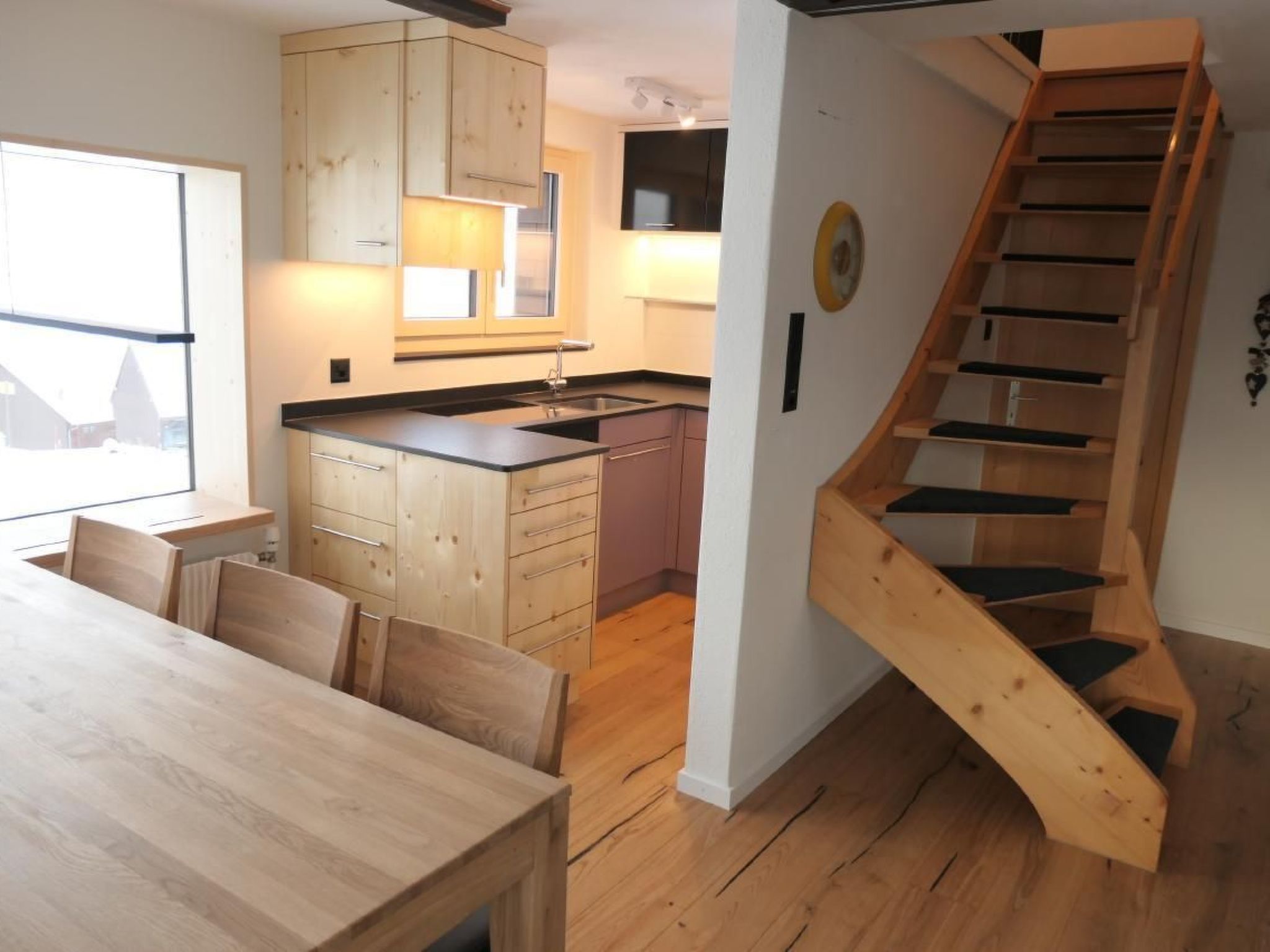 Die Küche wurde komlett umgebaut. Neu mit Backofen, Geschilrrspüler und erweiterten Arbeitsflächen über diversen Auszugschubladen. Alle Materialien wurden sorgfältig ausgewählt, aufeinander abgestimmt und durch regionale HandwerkerInnen fachgerecht bearbeitet. Der Boden im Eingangs-, Wohn- und Essbereich wurde mit hochwertigen Eichenparkett versehen. Der Essbereich ist neu möbiliert mit eindrücklicher Aussicht auf das Alpsteingebirge. Das neue grosszügige Panoramenster lädt zum Verweilen oder Lesen ein und bildet zusammen mit dem neu gestalteten Essbereich eine exklusive Ambiente.