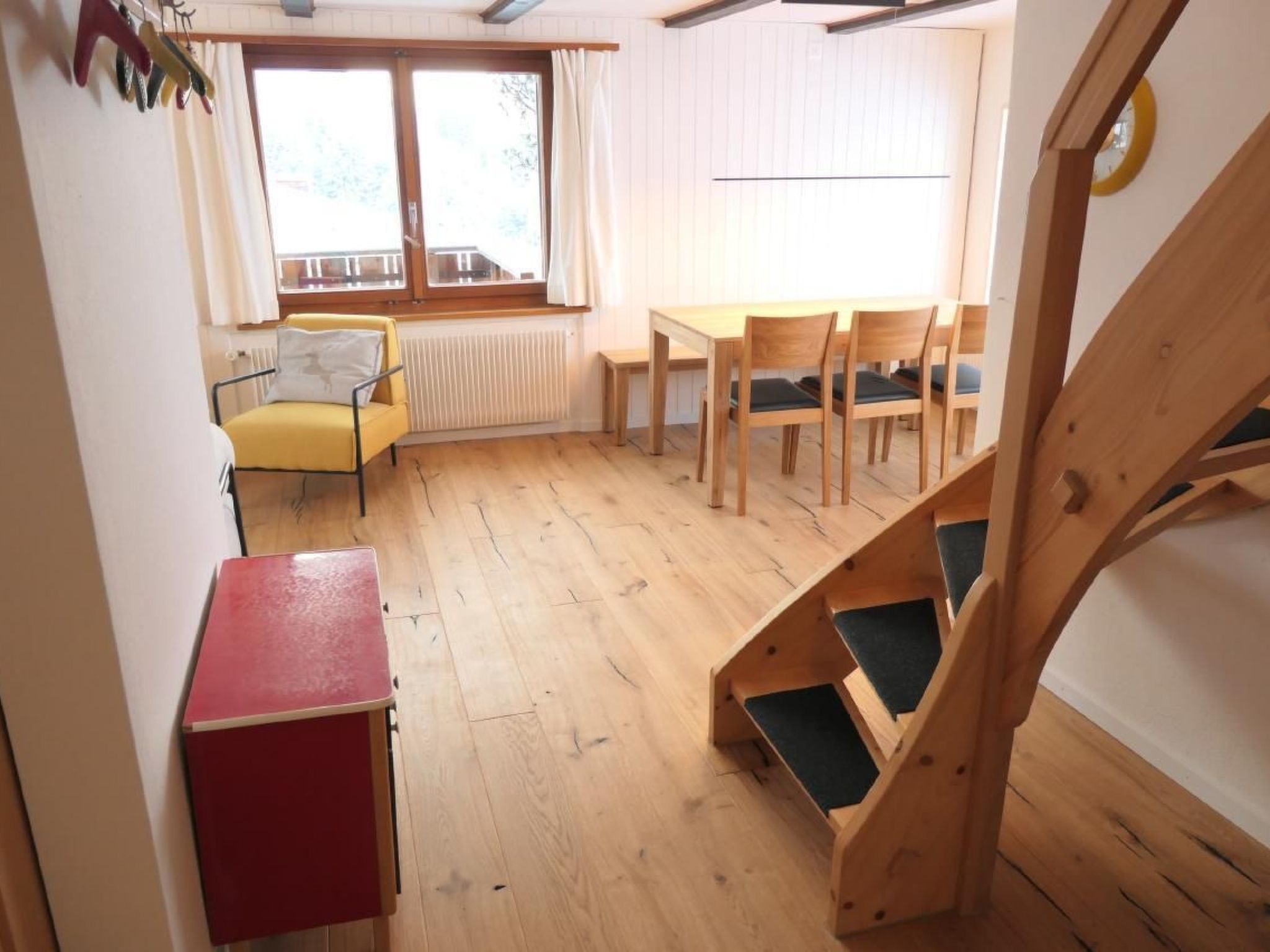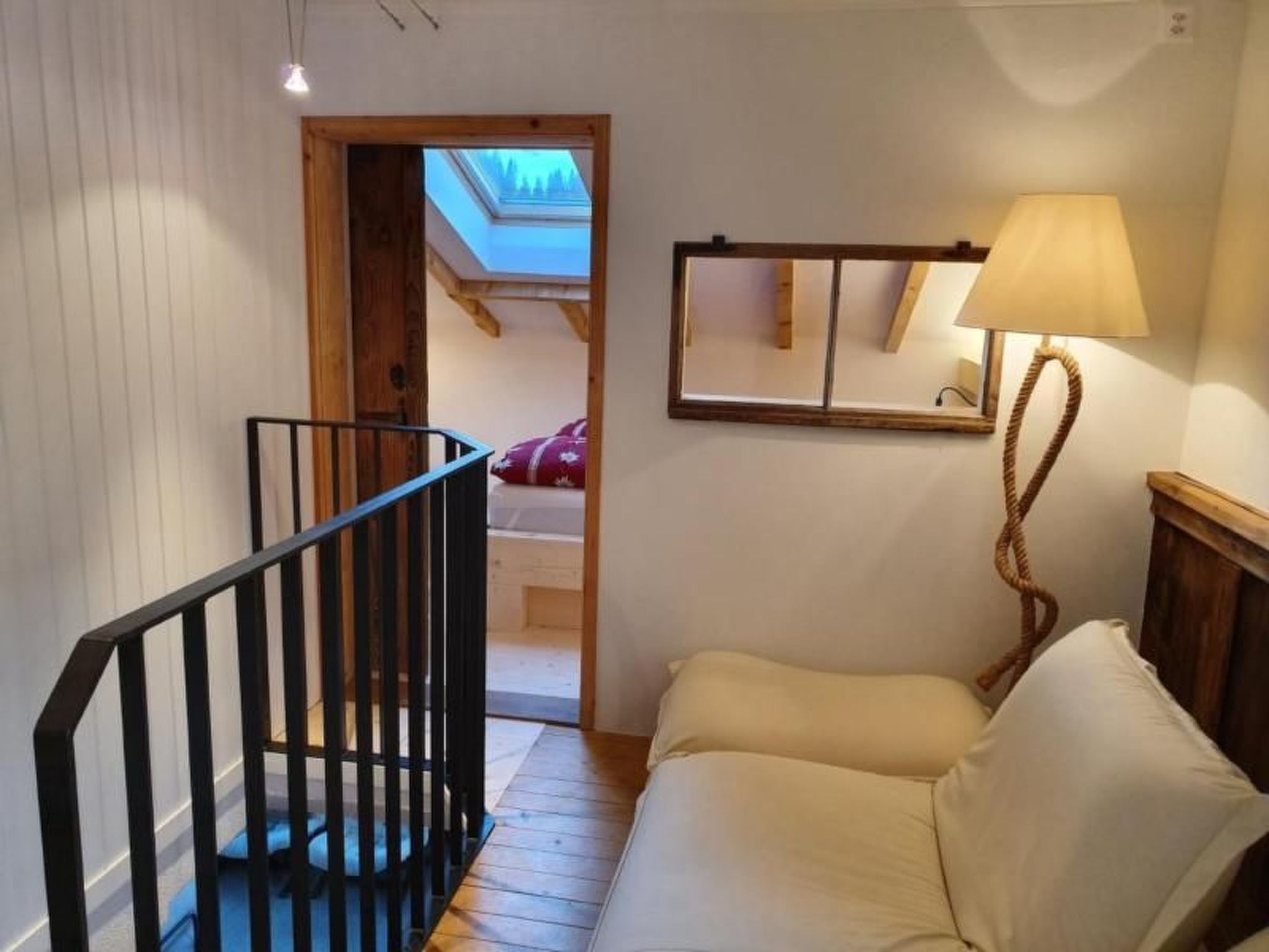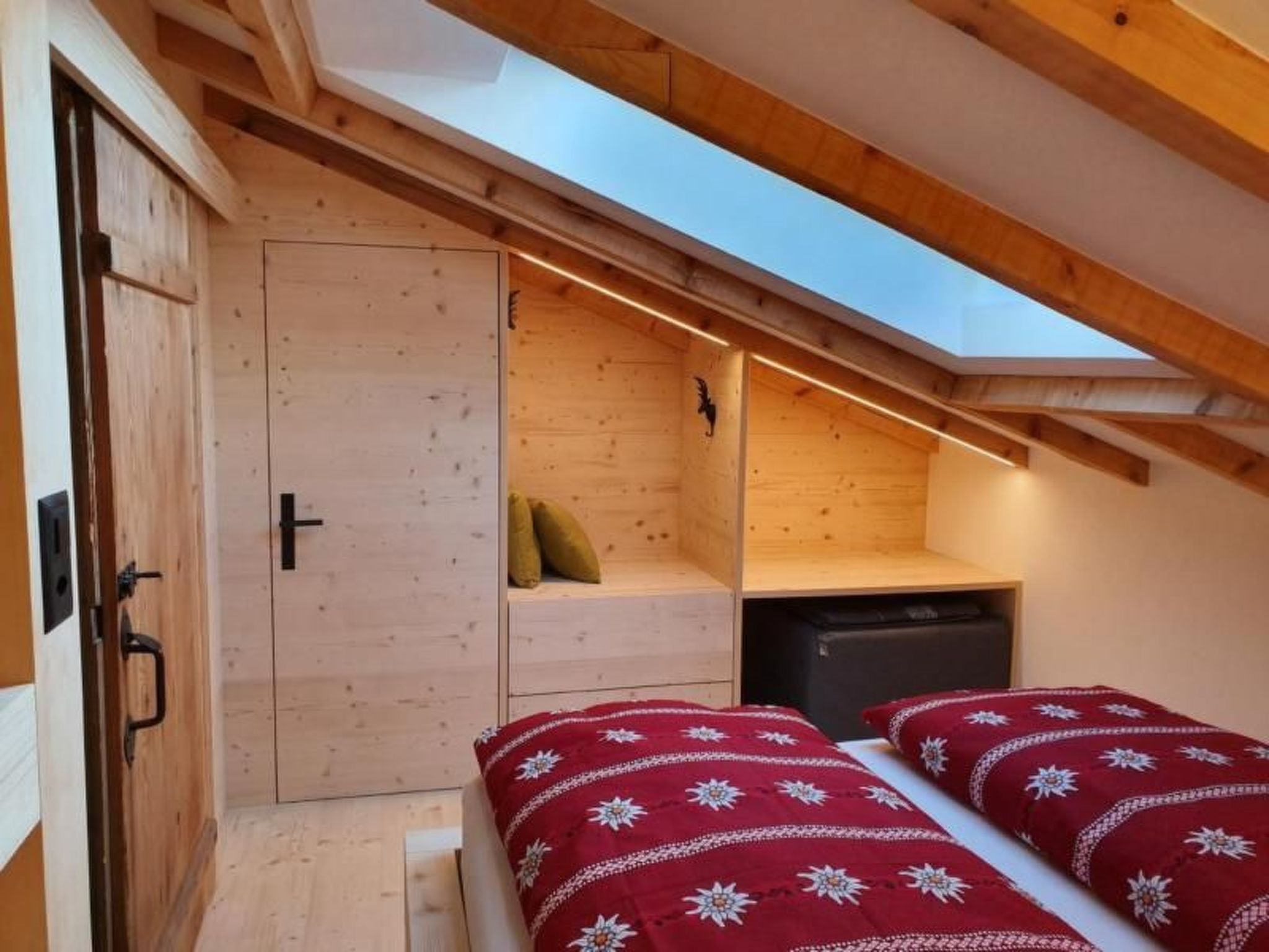 Das im Jahre 2019 erstellte Dachzimmer im Obergeschloss versprüht den frischen Duft aus einheimischen Fichtenholz. Dessen Vorraum mit Einbindung einzelner Altholzelemente bildet als Lounge gemütlichen Aufenthalt mit einem Sofa-Designklassiker aus dem Hause Ligne Roset. Auf der anderen Seite im Obergeschoss liegt das grösste Schlafzimmer mit zwei aneindander gestellten Einzelbetten und Kleiderschrank mit Zimmerausblick Richtung Churfirsten