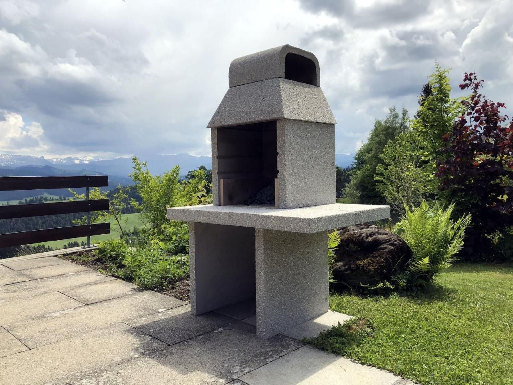 Der Aussenbereich des Ferienhauses ist geprägt von der spektakulären Lage auf rund 950 Metern über Meer. Hier können Sie die ruhige Atmosphäre und die beeindruckende Aussicht in vollen Zügen geniessen. Der Balkon oder die Terrasse bieten sich perfekt an, um die Seele baumeln zu lassen und die einzigartige Landschaft zu bewundern.