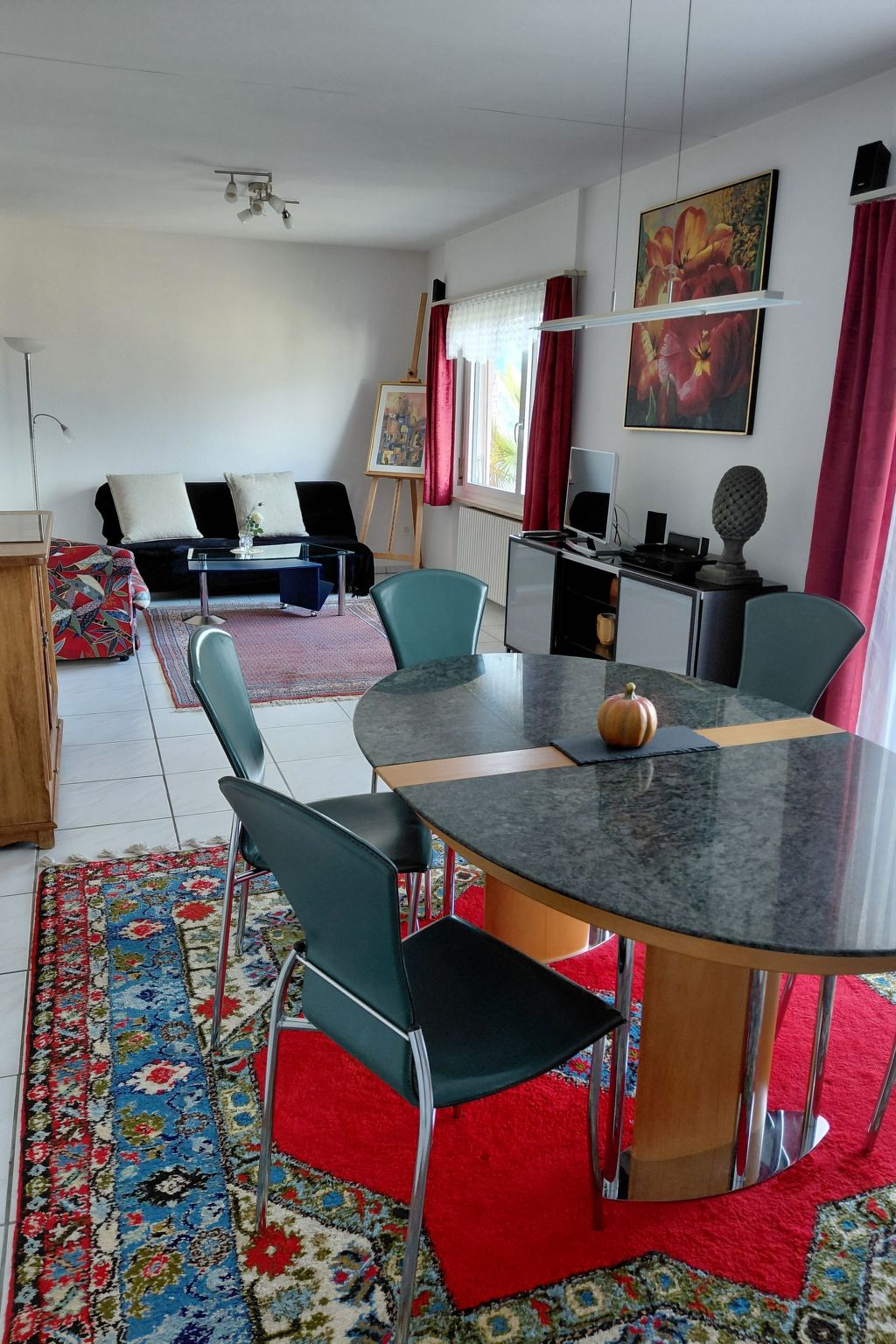 Der Außenbereich der Wohnung ist ebenso einladend. Eine Terrasse mit Gartenmöbeln sowie ein Gartensitzplatz mit Holzkohlegrill (Holzkohle selber verantwortlich) stehen Ihnen zur Verfügung, von wo aus Sie die herrliche Aussicht genießen können. Ihr Fahrzeug parken Sie bequem und kostenfrei auf dem privaten Gelände des Hauses. Dies ist der perfekte Ort, um in aller Ruhe zu entspannen und die Natur zu genießen.