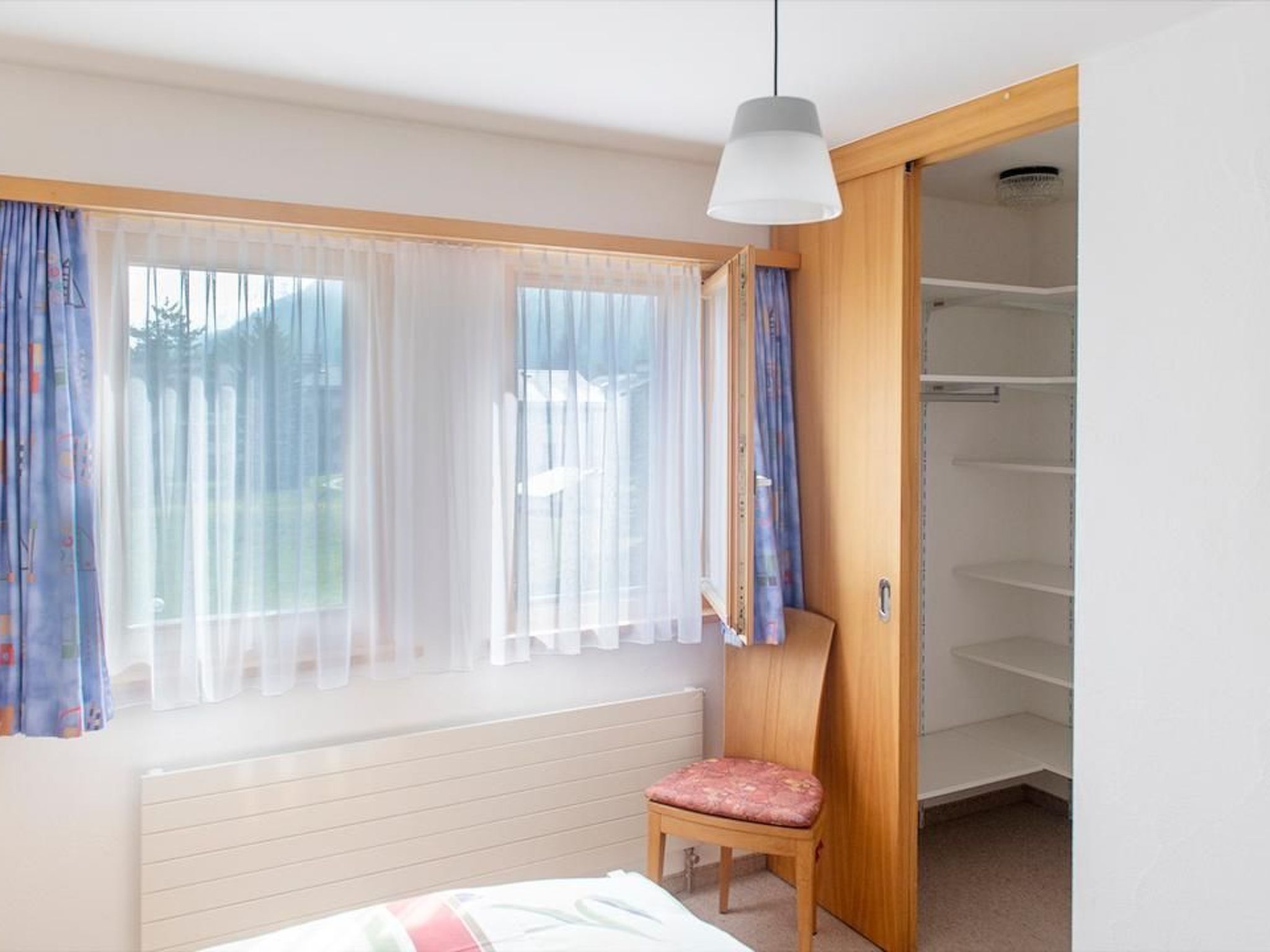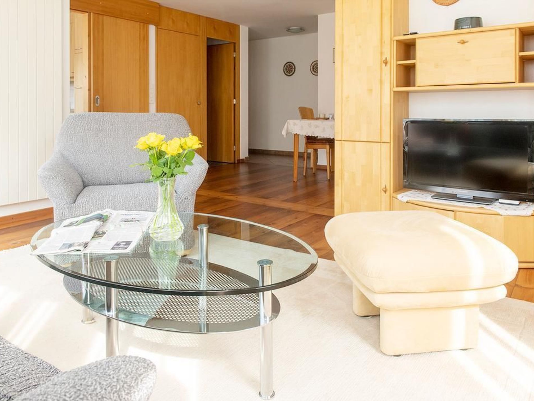 Die Inneneinrichtung der Wohnung lässt keine Wünsche offen. Mit einem gratis Internetzugang, TV, Radio und einer Geschirrspülmaschine bietet sie Ihnen sämtliche Annehmlichkeiten, die Sie für einen erholsamen Aufenthalt benötigen. Ein begehbarer Kleiderschrank im Schlafzimmer, Nachttische und praktische Stühle für Kleiderablage sorgen für zusätzlichen Komfort und Ordnung. Für kulinarische Entdeckungen zu Hause stehen Ihnen unter anderem ein Racletteofen und ein Käse-Fondue-Set zur Verfügung. Auch die Nutzung eines hauseigenen Wasch- und Trockenraums sowie ein zusätzlicher Abstellraum und Veloraum im Keller bringen Bequemlichkeit in Ihren Alltag.