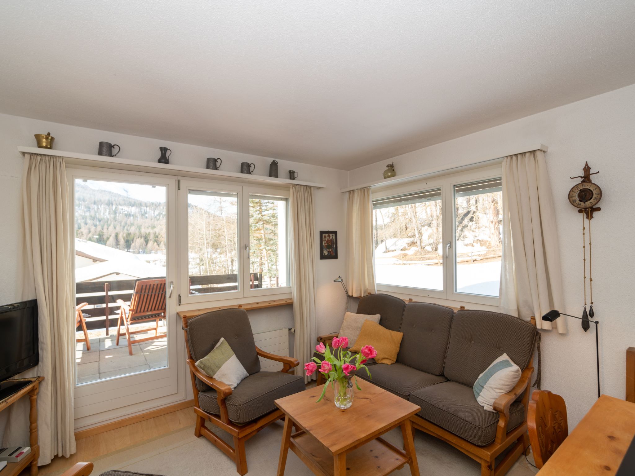 Das Wohn-/Esszimmer im Engadiner Stil mit Schiefer-Esstisch, Buffet Polstergruppe, alles aus Arvenholz gewährt gemütliche Stunden. ( KABEL-TV u. –Radio, Telefon, Internet(W-LAN., Sonnige Terrasse mit freiem Blick in Berge und Wald gewährt direkten Zugang auf Wiese. Moderne gut eingerichtete Küche mit Glaskeramikherd und Backofen, Geschirrspüler, grossem Eisschrank mit separatem Tiefkühlfach, Espresso- sowie Filter- Kaffeemaschine. Elternschlafzimmer ebenfalls mit Arvenmöbeln ausgestattet. Kinderschlafzimmer mit Twinbett (2 separat ausziehbare Betten). Neues Bad mit moderner Dusche und WC. Waschmaschine im Haus. Tiefgarage, grosse Wiese vor dem Haus.
