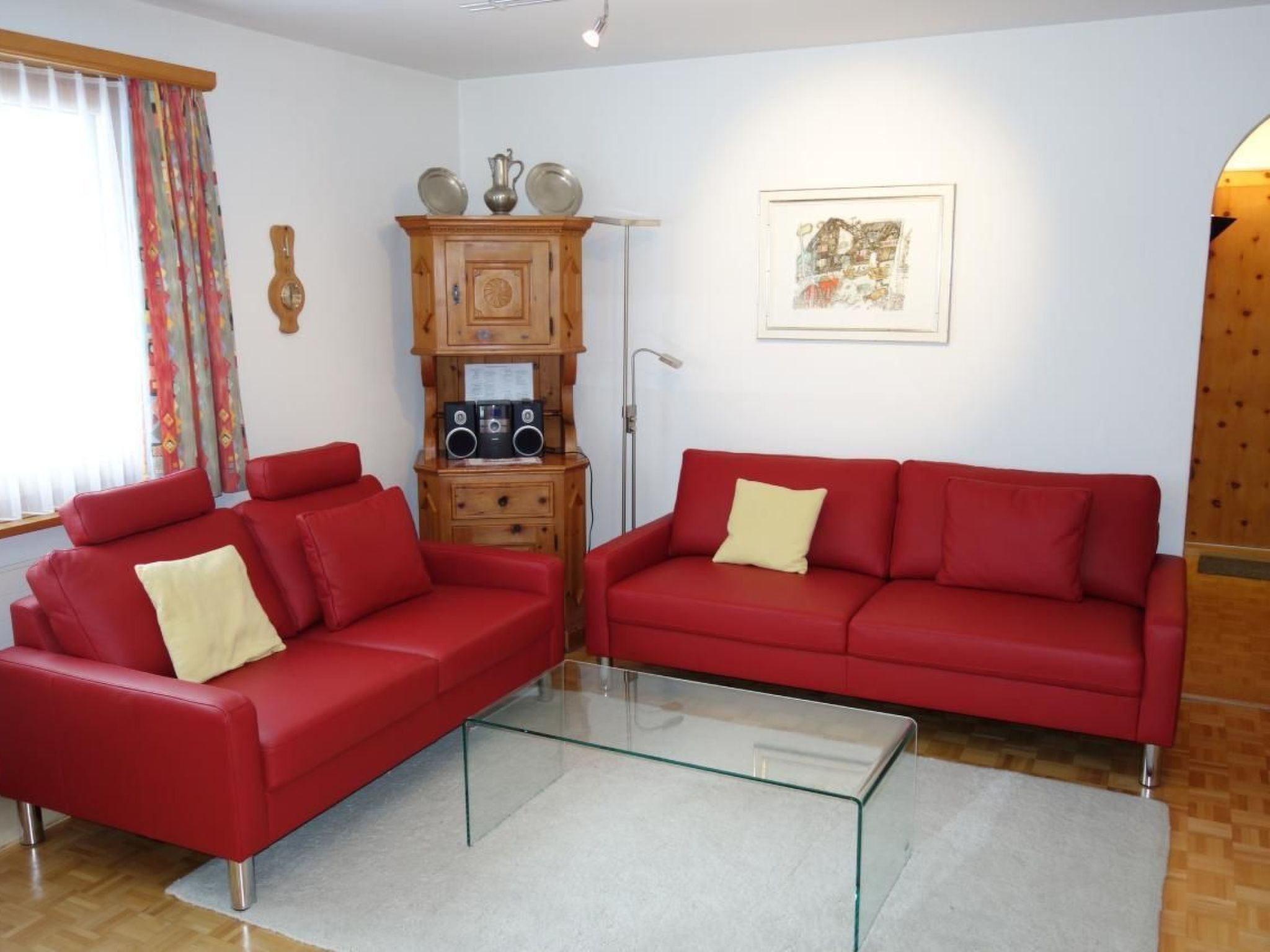 Im Inneren der Wohnung finden Sie ein gemütliches Schlafzimmer mit einem Doppelbett sowie ein weiteres Schlafzimmer mit einem Etagenbett, ideal für Familien oder kleine Gruppen. Die offene Küche ist voll ausgestattet mit einem Geschirrspüler, Backofen und einer Kaffeemaschine – sowohl Filter als auch Nespresso-Maschine stehen zur Verfügung. Der Wohn-/Essraum ist mit hochwertigen Arvenmöbeln ausgestattet, ergänzt durch SAT-TV, Radio, sowie eine bequeme Couchecke und einen großen Abstelltisch für gemütliche Abende daheim.
