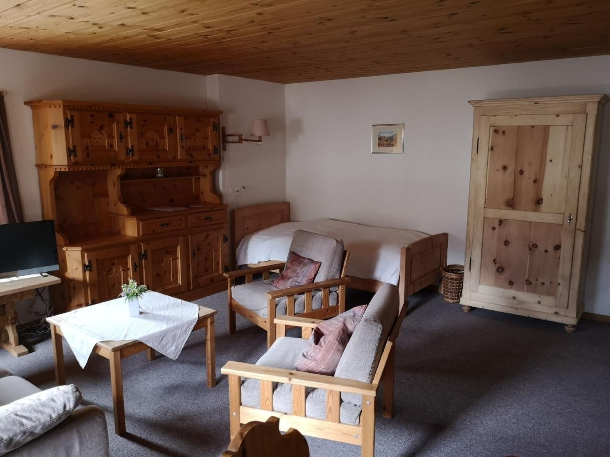 Weniger ist mehr! Einfache OG-Ferienwohnung für zwei Personen (drei möglich) in historischem Engadinerhaus 1642. Renoviert 2013. Mit Auotparkplatz beim Hauseingang oben. Ökologische Energie (Pelletheizung Warmwasserradiatoren und Infrarotpanel zum Ausgleich im Wohnzimmer). Kleine Küche mit Backofen und Geschirrspüler in Zwischenraum, weiche Kork- und Teppichböden. Kleine Dusche-WC. Historisches Engadiner-Schlafzimmer mit 2 neuen Arvenholzbetten /Hüslernest. Wohn-Esszimmer mit Panoramasicht, Sofa zu Couchbett ausziehbar, kleiner Fernseher , Telefon, W-Lan. Skier im Vorraum Haupteingeng. Ablage vor der Wohnung. Gartensitzplatz unten. Ruhige Lage in Quartierstrasse Giarsun nähe Zentrum Oberdorf, Post, COOP, zwei Bäckereien (in 4 Min. zu Fuss erreichbar) Dauermieter im Parterre.