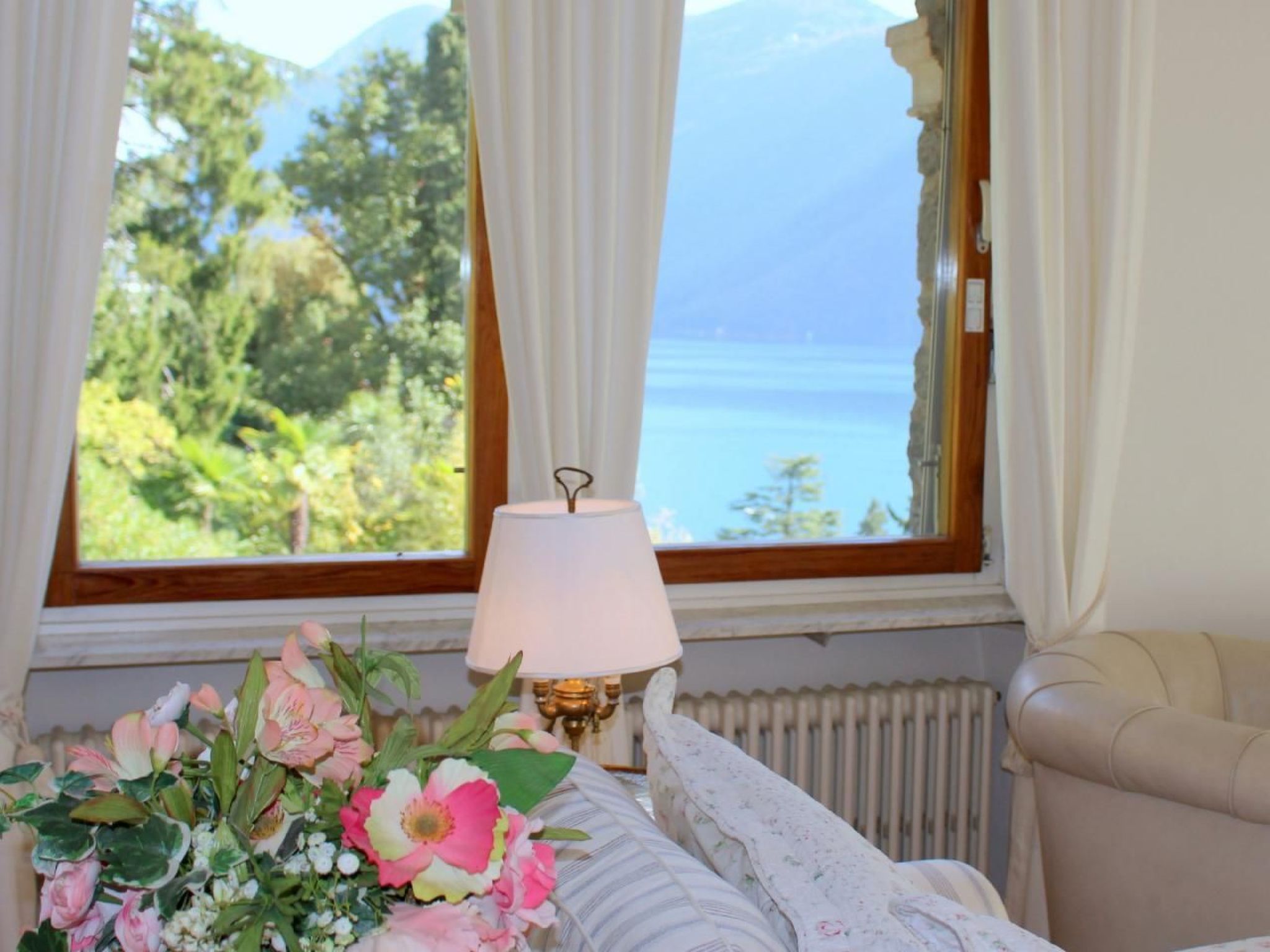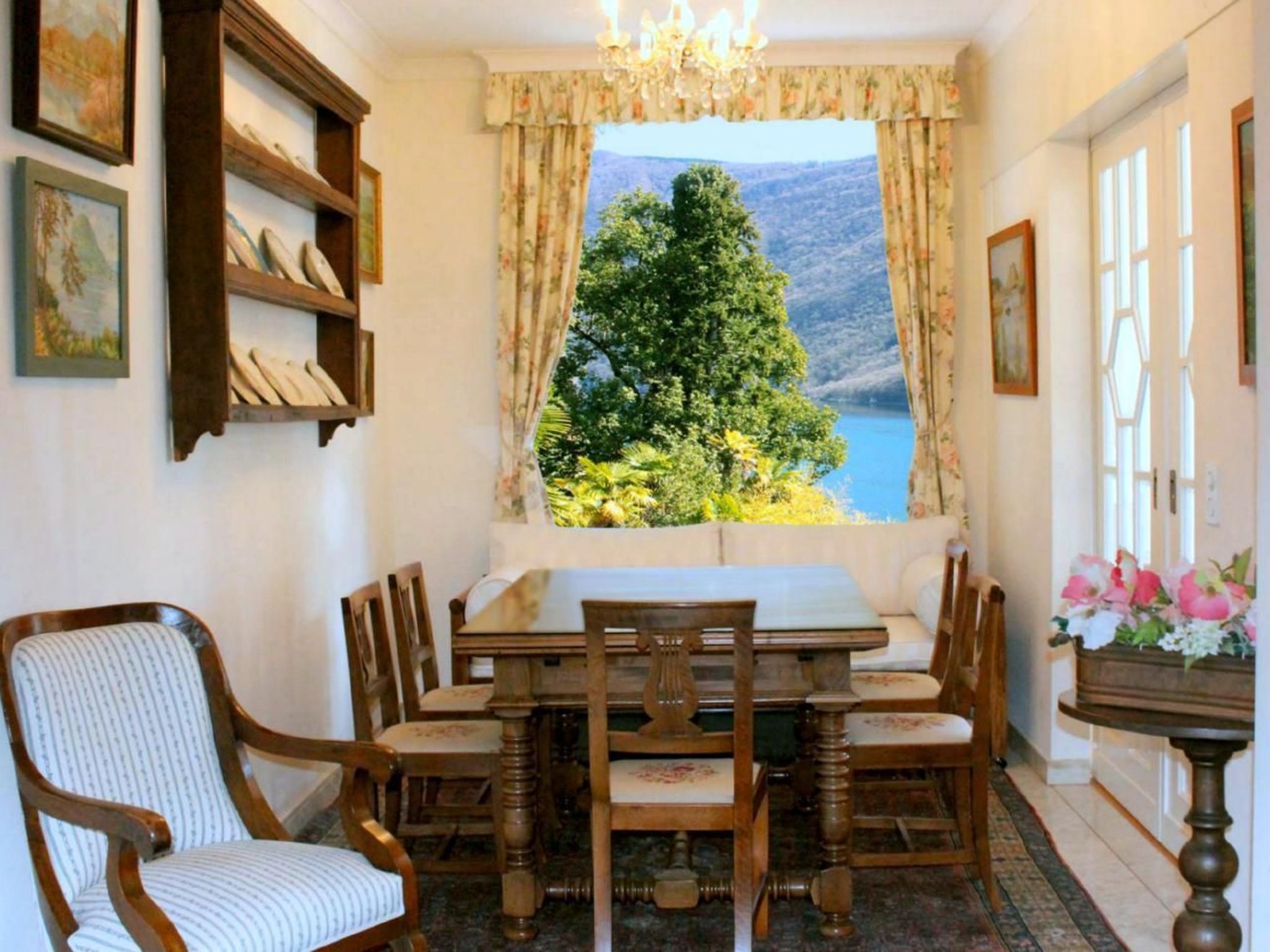 Esszimmer (Deckenventilator) mit Schiebetür zum Wohnzimmer (Klimagerät).Vom Esszimmer/Halle über angewendelte Treppe zur Mansarde. "Bulthaup-Küche"- im Landhausstil + antike Schrankwand: Arbeitsfläche mit handgefertigten franz.Fliesen, 4-Platten-Herd in Edelstahl mit Ueberlaufmulde, Backofen, Dunstabzug, Geschirrspüler, Kühl- und Tiefkühlschrank, Mikrowelle mit Grill, Fenster mit Seesicht. + 1 kl. separate Schrankküche in Schlafzimmer Nr. 2. 1 Schlafzimmer (Klimaanlage) mit 1 Doppelbett 1,6 x 1,9 m + 1 Schlafcouch 0,9 x 1,9 m . Kinderbett auf Anfrage. 1 Schlafzimmer (Klimaanlage mit 1 Doppelbett/2 Matratzen je 0,8 x 1,9 m mit kl. Schrankküche eingebaut hinter 2 antiken Türen. 1 Schlafzimmer (Klimagerät) befindet sich in der Mansarde (mit schrägen Wänden und 2 Velux-Fenstern) und ist erreichbar über eine angewendelte Treppe in der Halle: 2 Einzelbetten 0,9 x 1,9 m + 0,9 x 2 m. 2 Bäder: 1 x Badewanne m. Duschvorhang, Waschbecken, WC, Bidet, Infrarot, 2 Fenster 1 x Badewanne m.Duschvorhang, Doppelwaschbecken m. Unterschrank, WC, Handtuchwärmer, Ventilator, Waschmaschine, 1 gr. Fenster, Trockenständer. Trockner im Gemeinschaftswaschhäuschen auf der Gemeinschaftsterrasse vor Schwimmbadhaus, 1 gr. Fenster,Ventilator. 1 Balkon mit 2 Sesseln + 1 Fussbank mit Markise. 1 Balkon mit Essplatz für 2 Personen mit gr. elektr. Markise 1 Terrasse am Eingang zur Wohnung mit Essplatz für 6 Personen mit Sonnenzelt. Kabel-Fernsehen, Telefon: prepaid Handy möglich, WIFI kostenlos. Möblierung: Geschmackvoll, antik und komfortabel. Nichtraucher-Wohnung. Parkplatz oder Garage disponibel. Wunderschöner Blick auf Luganer See und Berge. Kostenlose Benutzung des überdachten Gemeinschafts-Schwimmbades in Betrieb ab 20. Juni bis Ende September. Zoover Award 2010 bis 2012 "Bestes Ferienhaus Lugano" - "Highly recommended".