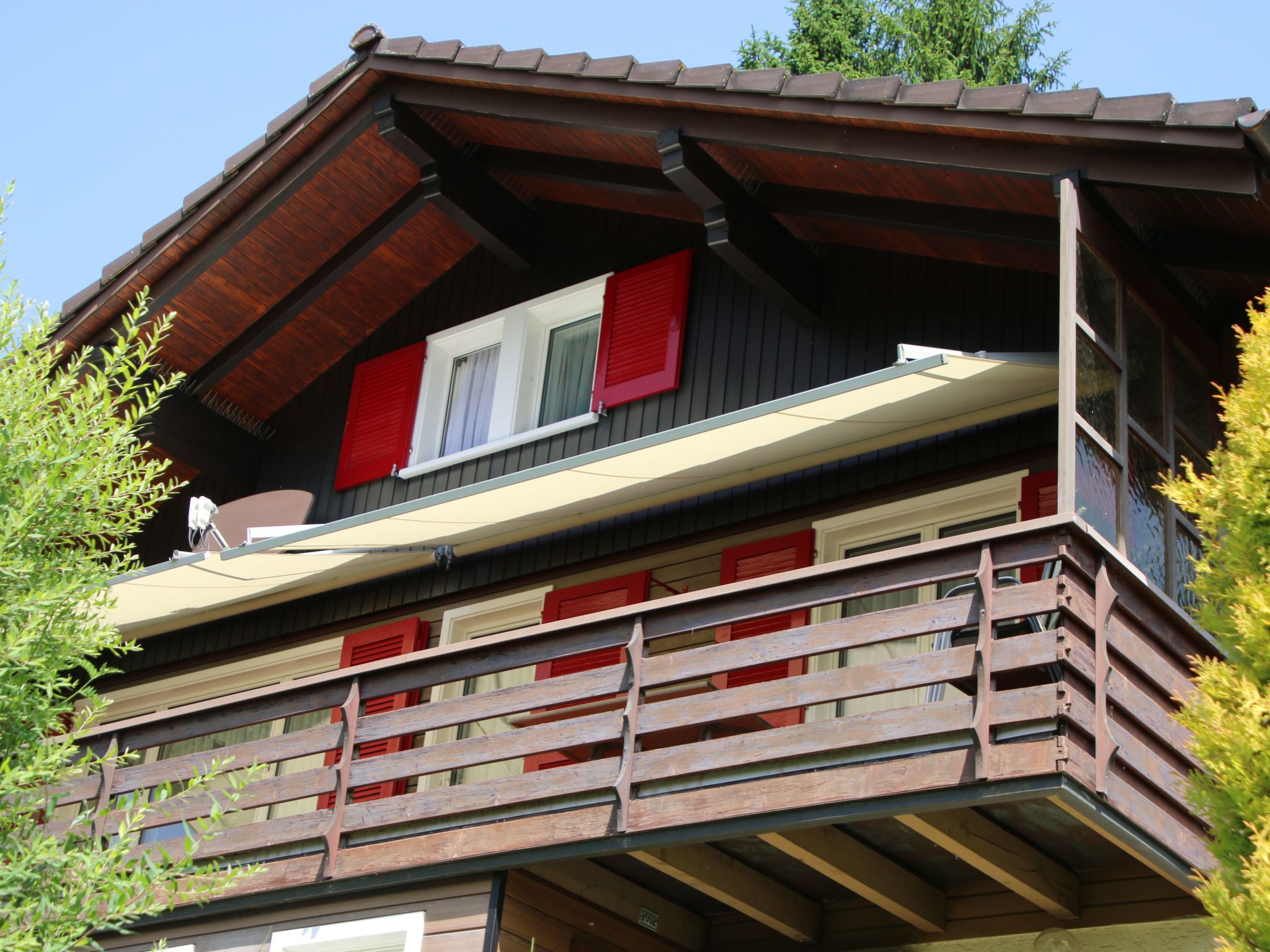 Der Außenbereich dieses Chalets ist ebenso beeindruckend wie sein Inneres. Der großzügige, in L-Form angelegte Balkon lädt dazu ein, die Sonnenstrahlen von morgens bis abends auszukosten. Dort können Sie entspannen, die atemberaubende Aussicht bewundern oder einfach nur den Tag in Ruhe ausklingen lassen.